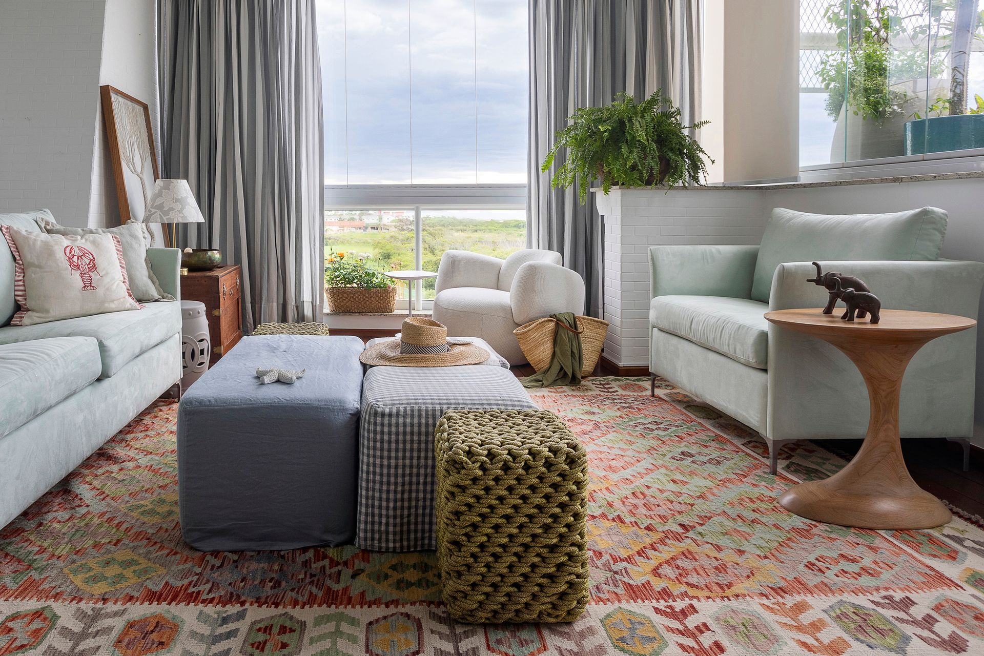 O living reúne sofás com camurça em tom verde azulado, puffes de diferentes estampas e peças assinadas do acervo da Contti, como a poltrona giratória colo