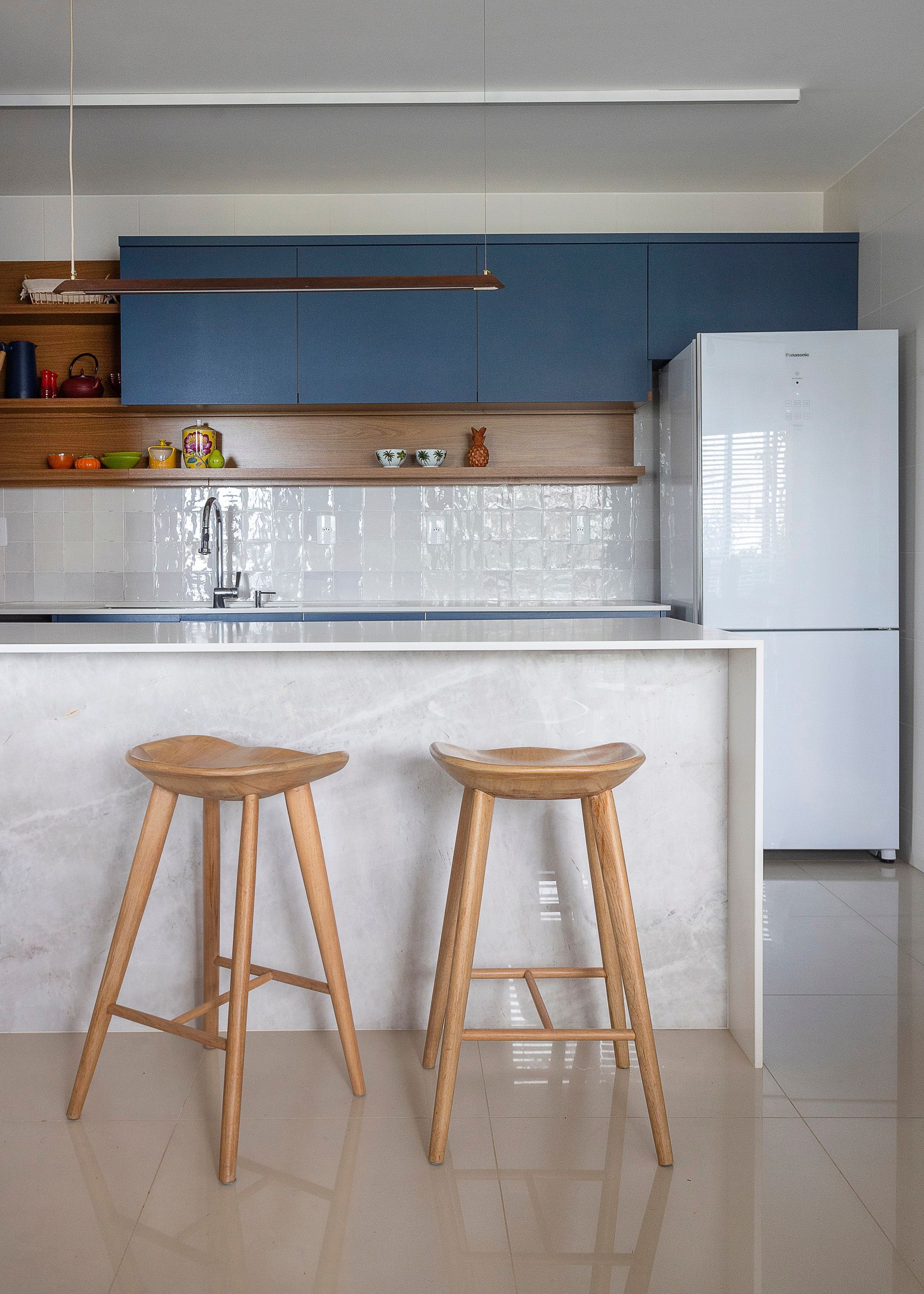 A cozinha, com sua bancada-ilha, teve a marcenaria trabalhada em azul, madeira freijó e bancada branca. Em frente à bancada, um par de banquetas Contti em madeira de cerejeira maciça acomodam quem quiser petiscar ou apenas bater um papo enquanto as refeições são preparadas.