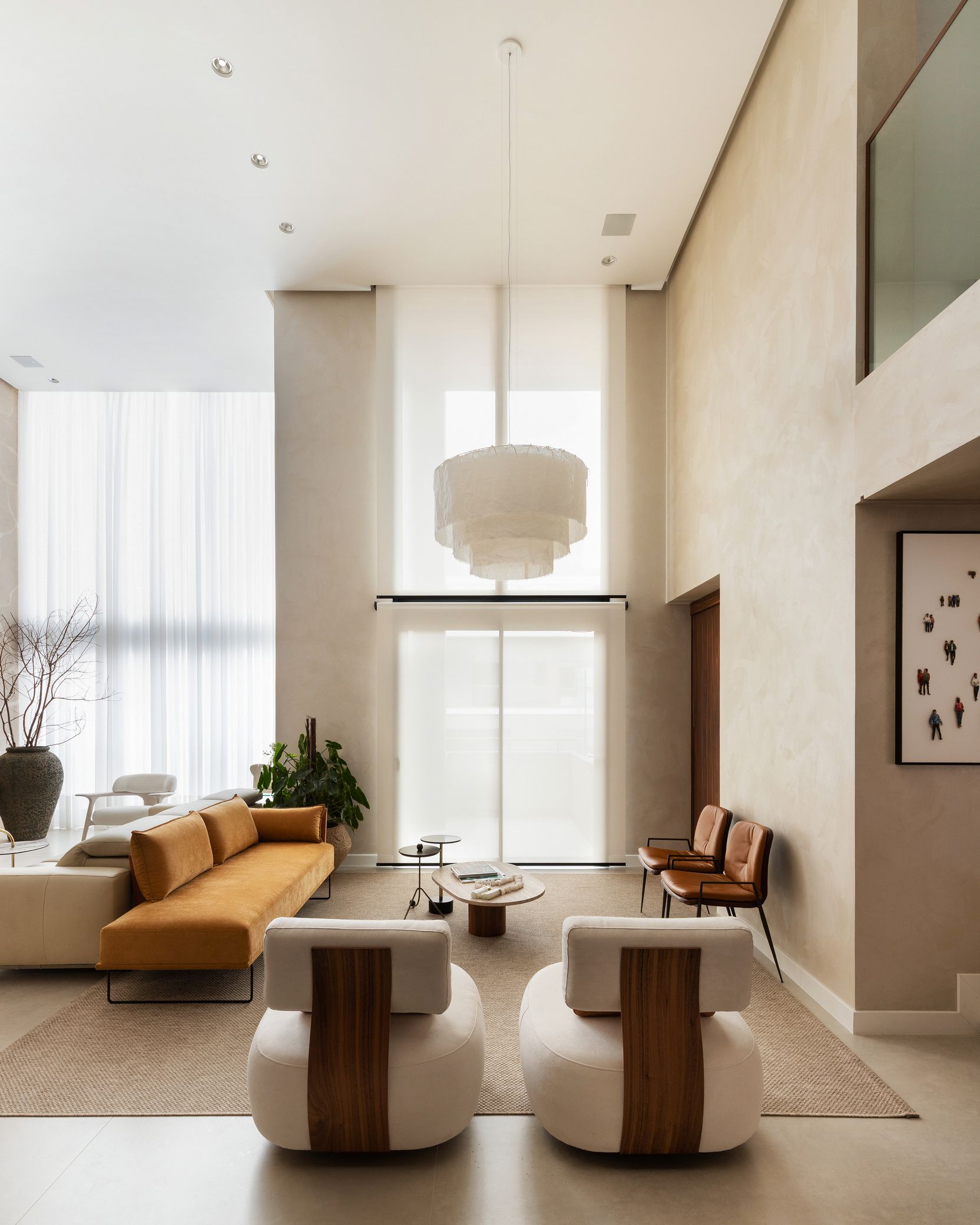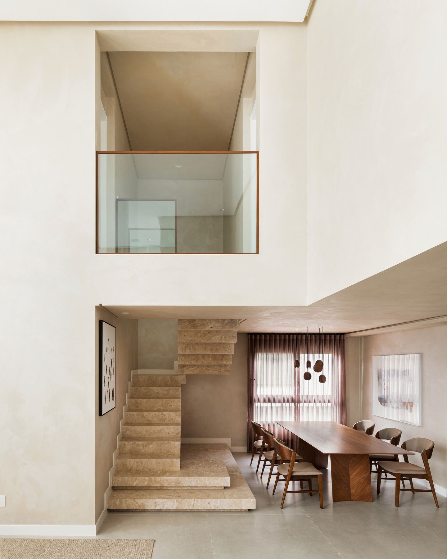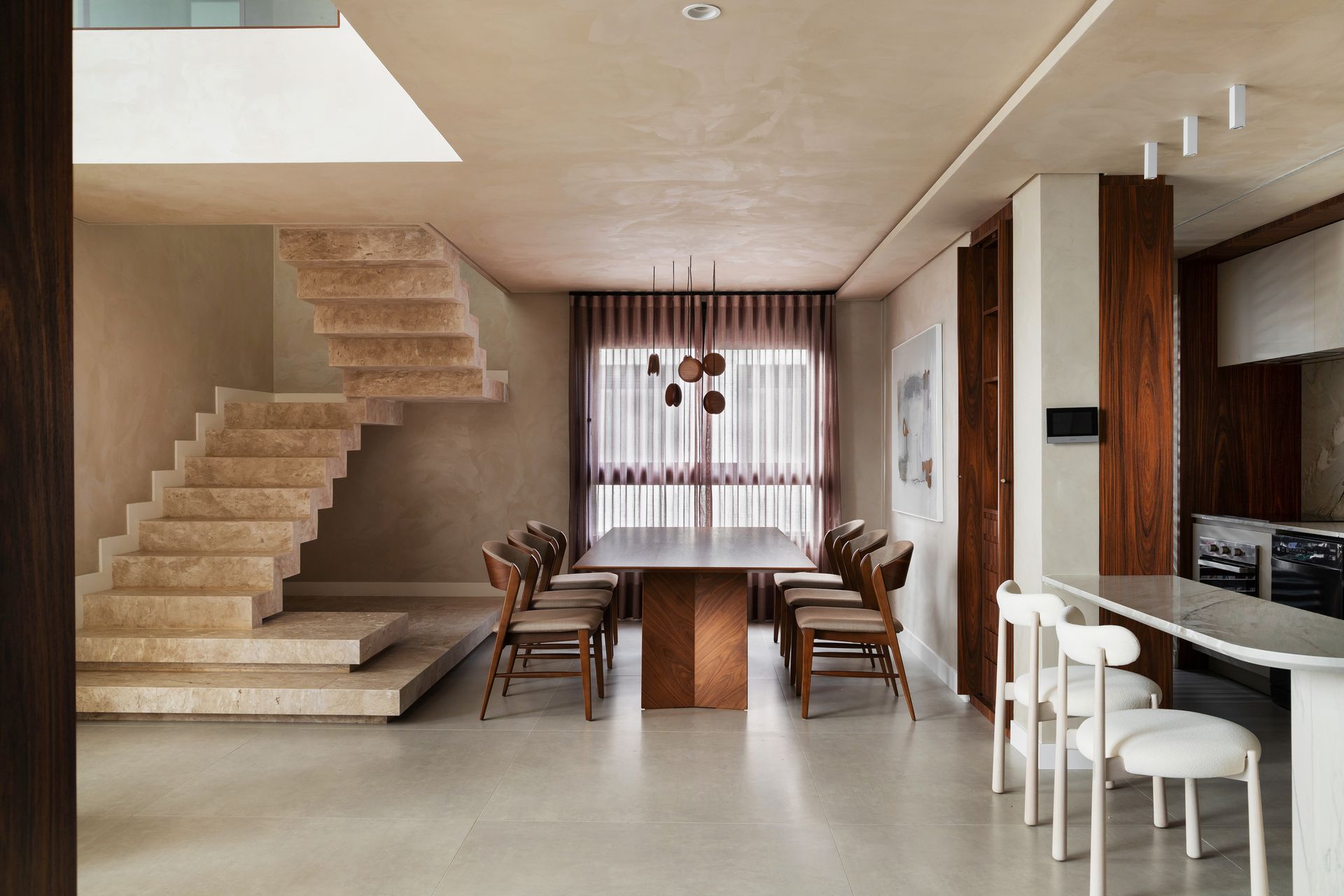 A Poltrona Winding, com estrutura em aço laminado nogueira, é outro ponto alto do projeto, oferecendo elegância e conforto, em total sintonia com a Mesa de Centro Zion e seu tampo em pedra travertino rústico. A Mesa de Apoio Carol, com acabamento em inox tonalizado, adiciona leveza ao conjunto, complementando a composição de forma sutil. O pendente Mini, em madeira jequitibá maciça, traz um toque artístico e de naturalidade ao espaço. Para finalizar, a Cadeira Seriema reforça a proposta de conforto e elegância, complementando o design sofisticado da residência.