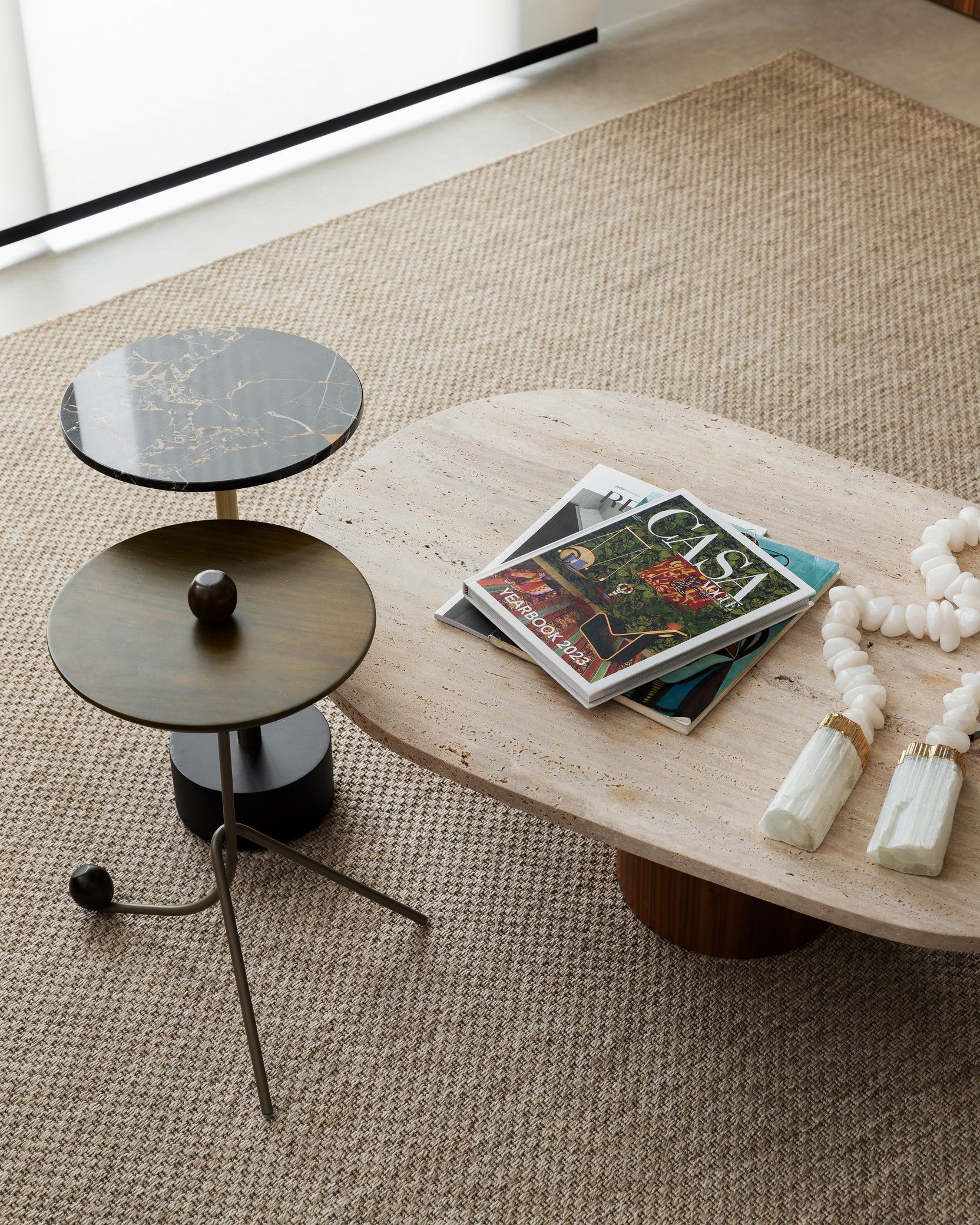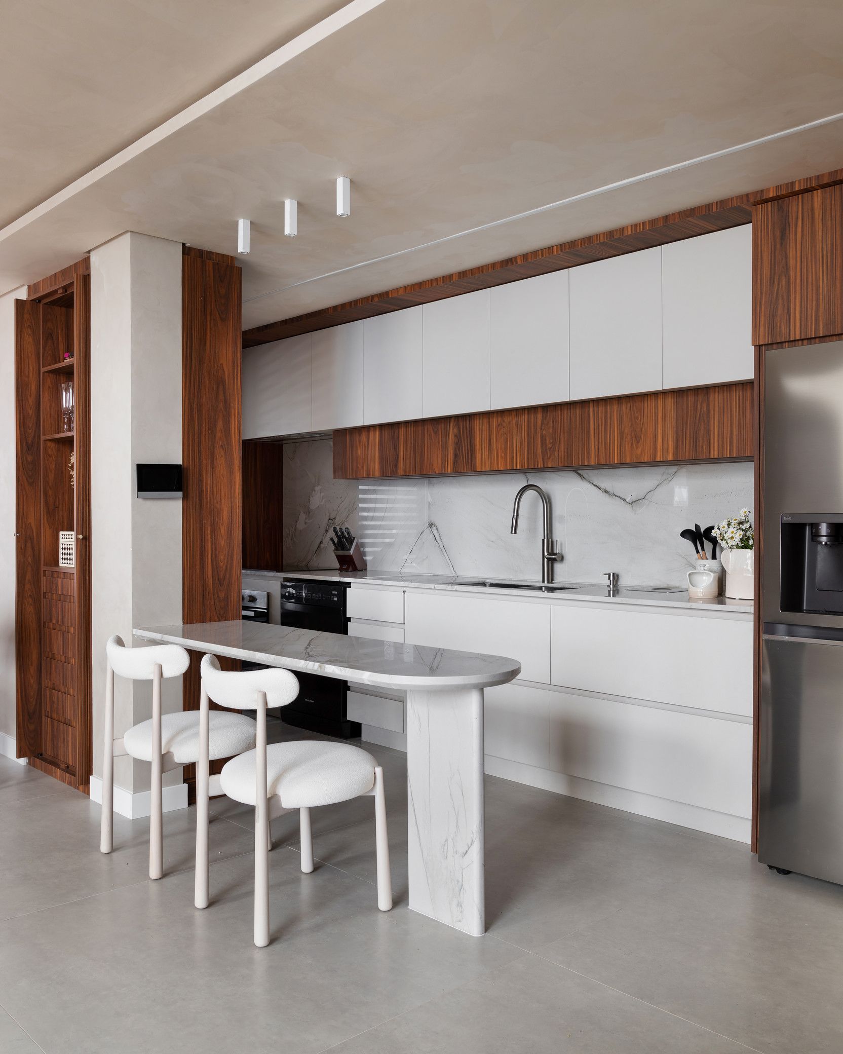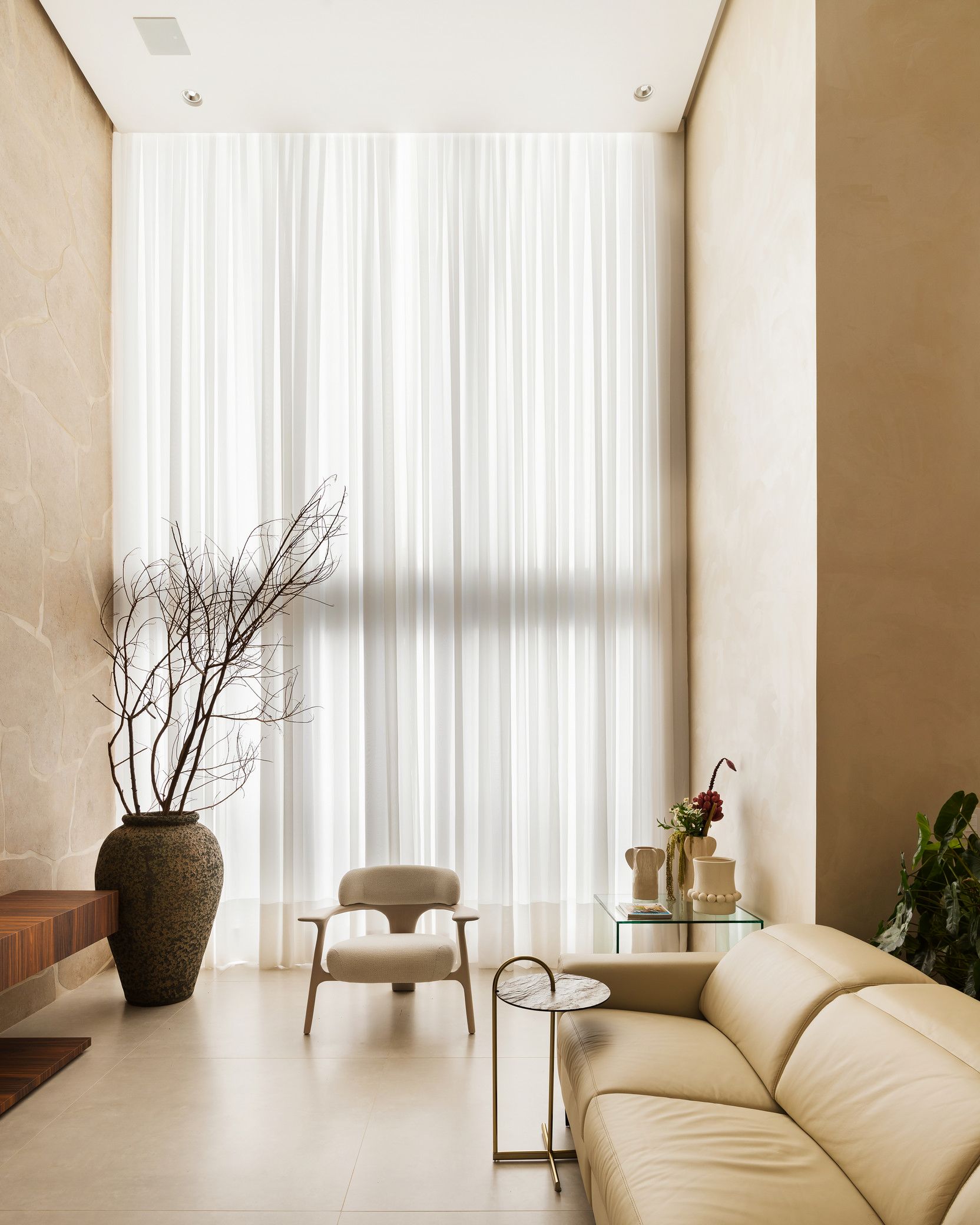 A Poltrona Winding, com estrutura em aço laminado nogueira, é outro ponto alto do projeto, oferecendo elegância e conforto, em total sintonia com a Mesa de Centro Zion e seu tampo em pedra travertino rústico. A Mesa de Apoio Carol, com acabamento em inox tonalizado, adiciona leveza ao conjunto, complementando a composição de forma sutil. O pendente Mini, em madeira jequitibá maciça, traz um toque artístico e de naturalidade ao espaço. Para finalizar, a Cadeira Seriema reforça a proposta de conforto e elegância, complementando o design sofisticado da residência.