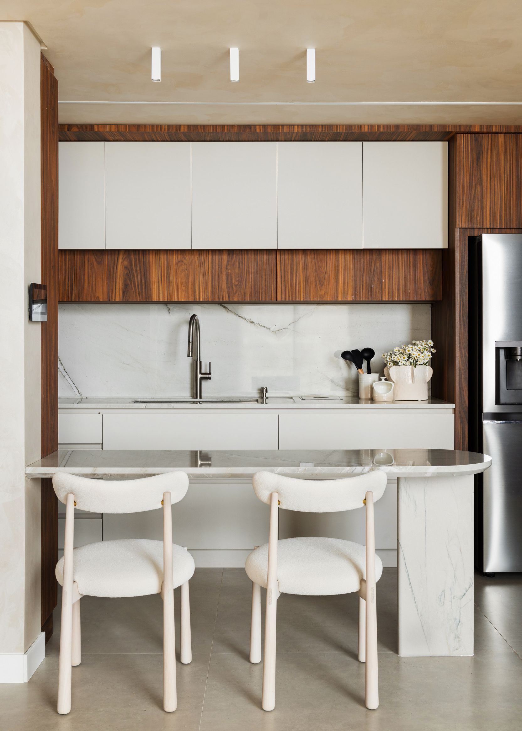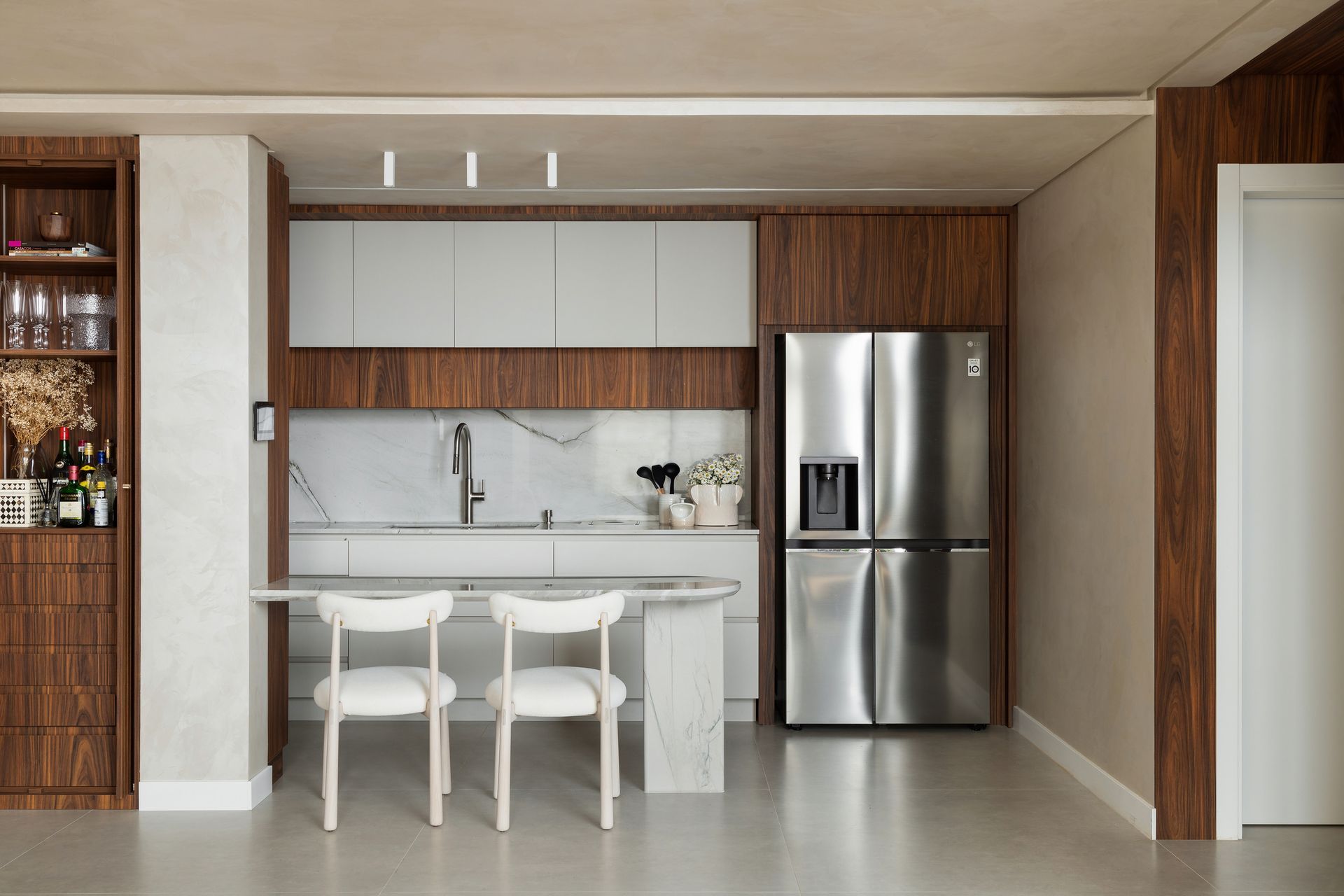 O mobiliário da ContTi Home Design foi cuidadosamente selecionado pela arquiteta para equilibrar conforto e estética, atendendo às necessidades dos moradores, médicos ortopedistas, que priorizam a ergonomia e a versatilidade no uso dos ambientes.