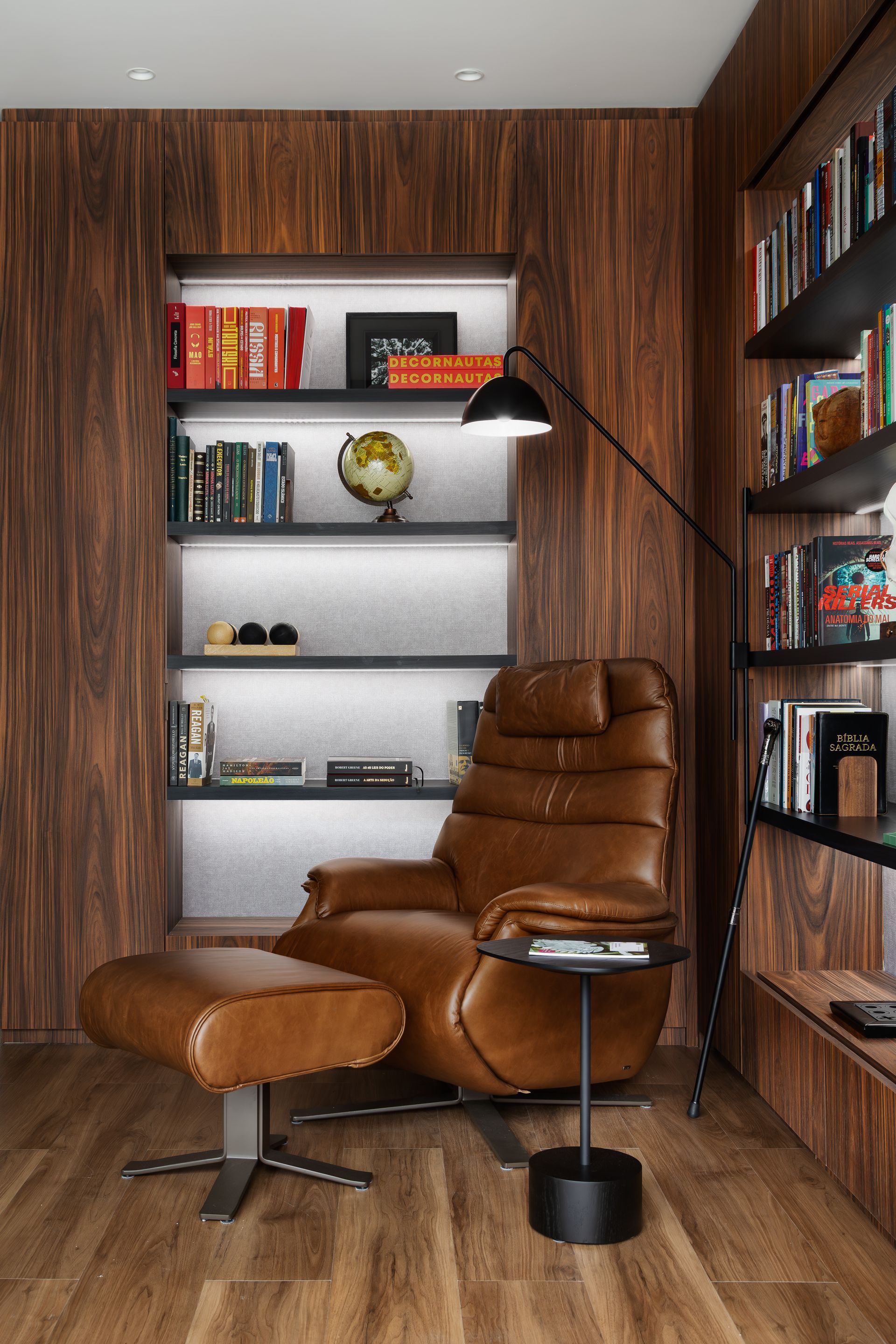Os escritórios foram pensados para rotinas distintas. O dele adota madeira escura e tons contidos, estendendo-se para a “varanda wine”, refúgio de leitura, vinhos e charutos. O dela combina papel de parede e marcenaria verde, com presença de design autoral na cadeira Grão Giratória, de Rejane Carvalho Leite para a Dü Design.