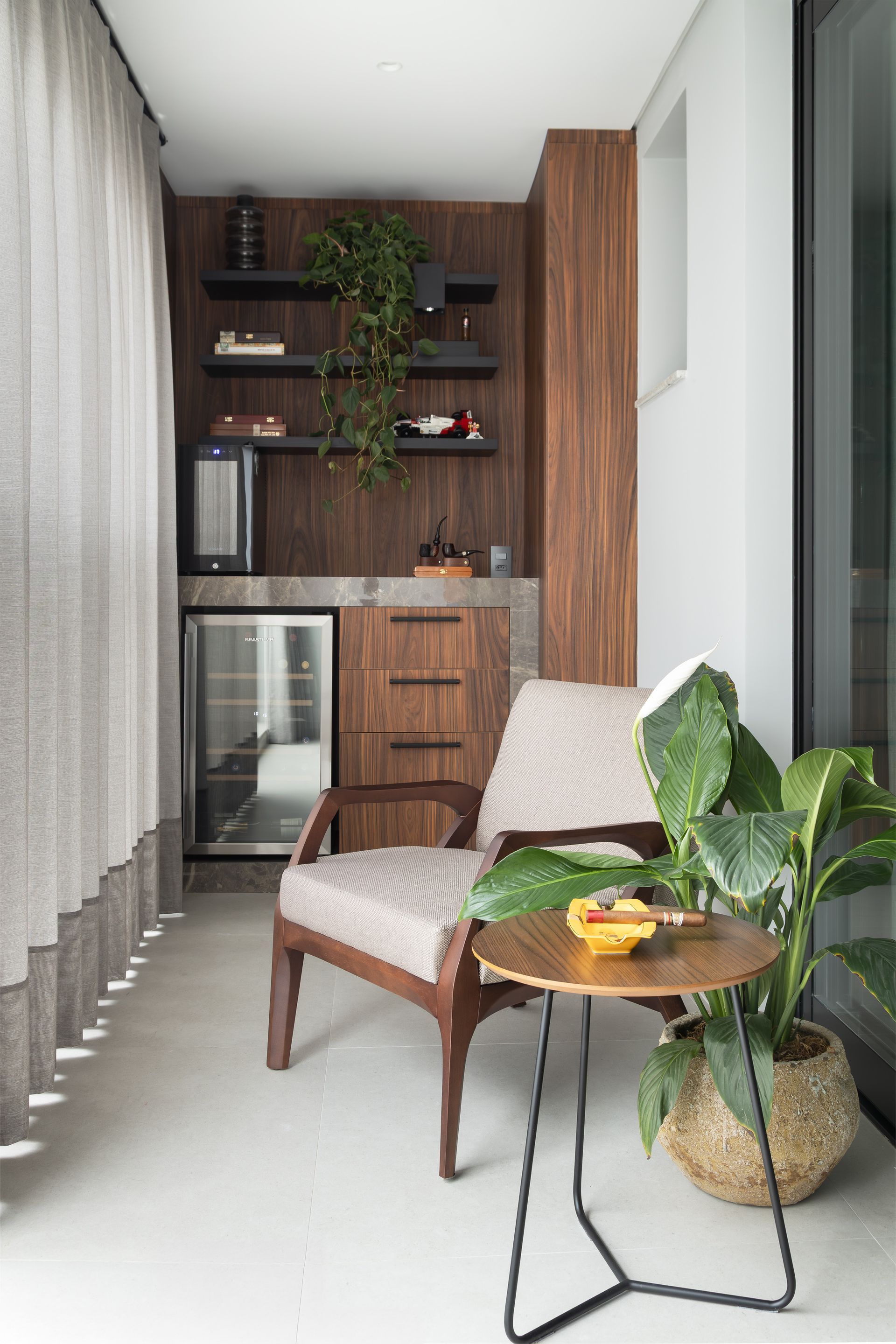 O resultado organiza o cotidiano a partir de um grande living, onde a luz natural, os paineis de madeira e pontos de preto no mobiliário e na adega conduzem a leitura do espaço com vista para o centro da cidade. Dali se articulam as áreas sociais — hall, lavabo, estar e jantar integrados, cozinha e lavanderia, e o núcleo íntimo, que reúne três suítes e dois escritórios independentes. Na varanda, além da churrasqueira original do empreendimento, um espaço de café foi dedicado à torra e moagem de grãos, hábito incorporado ao dia a dia.