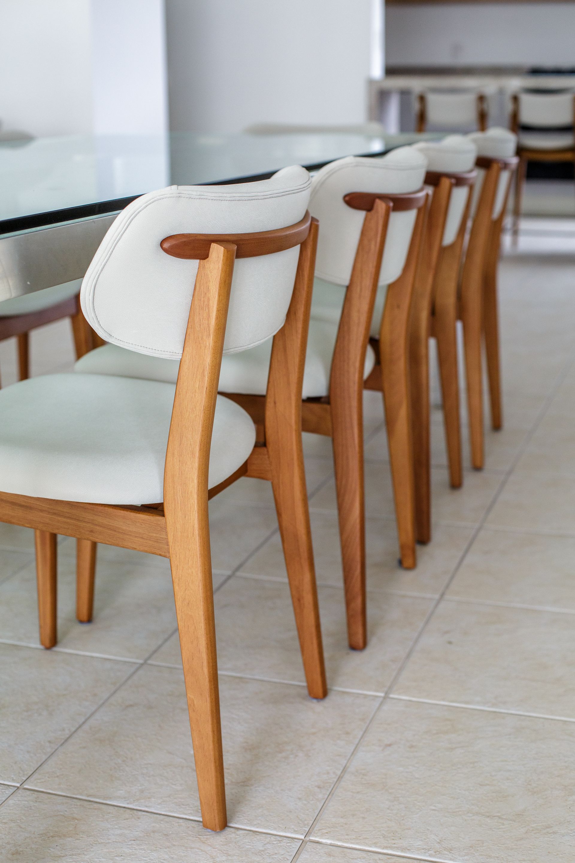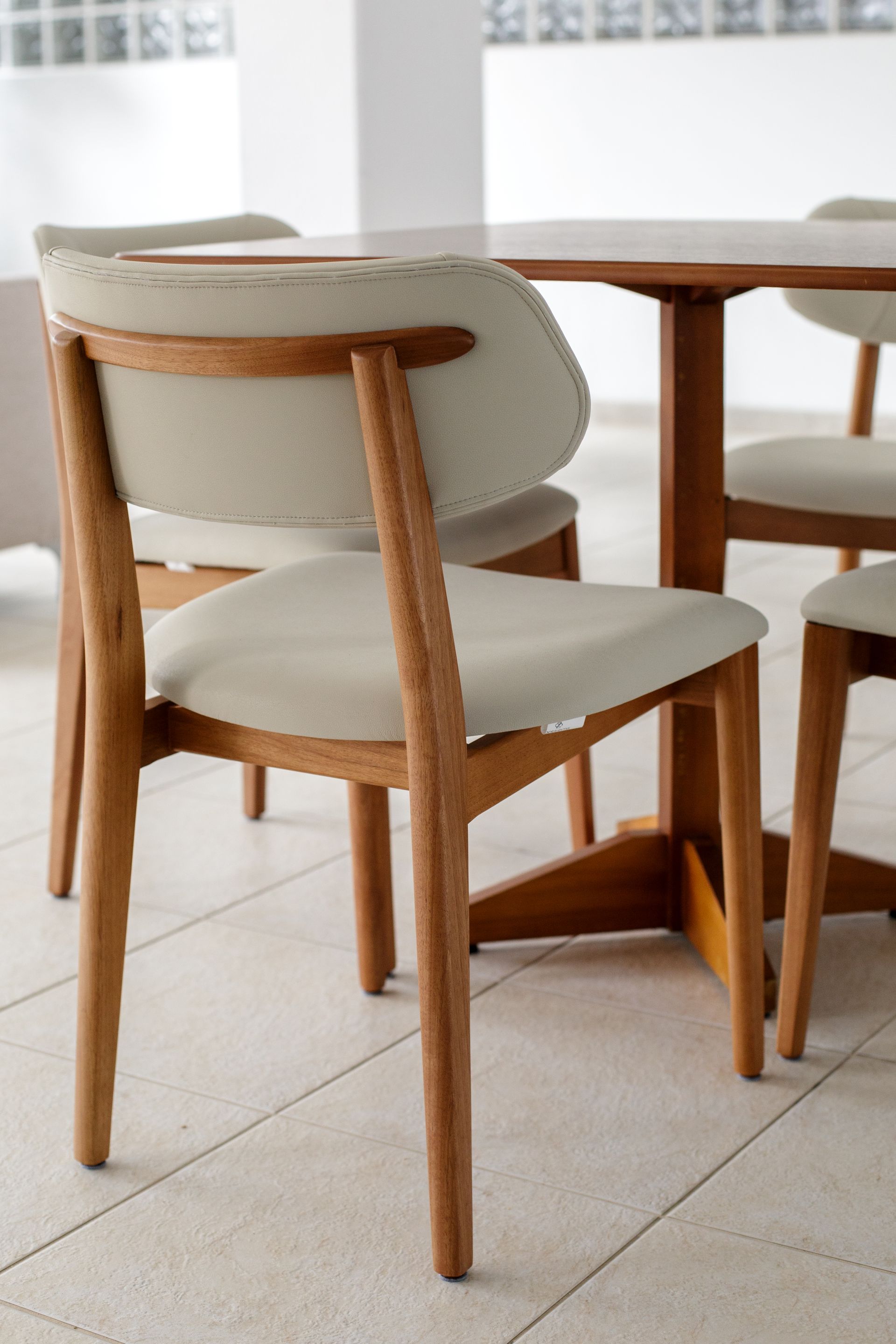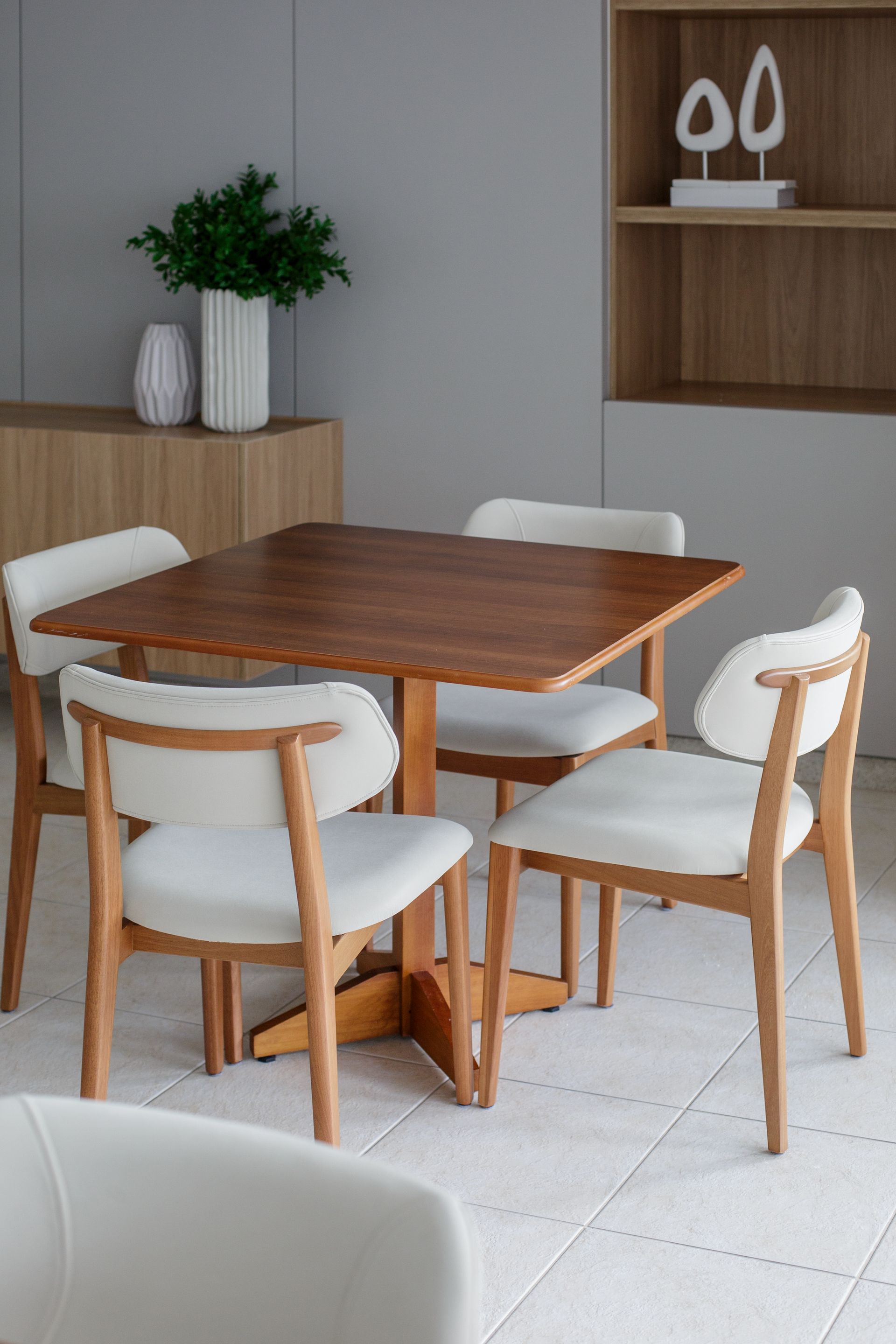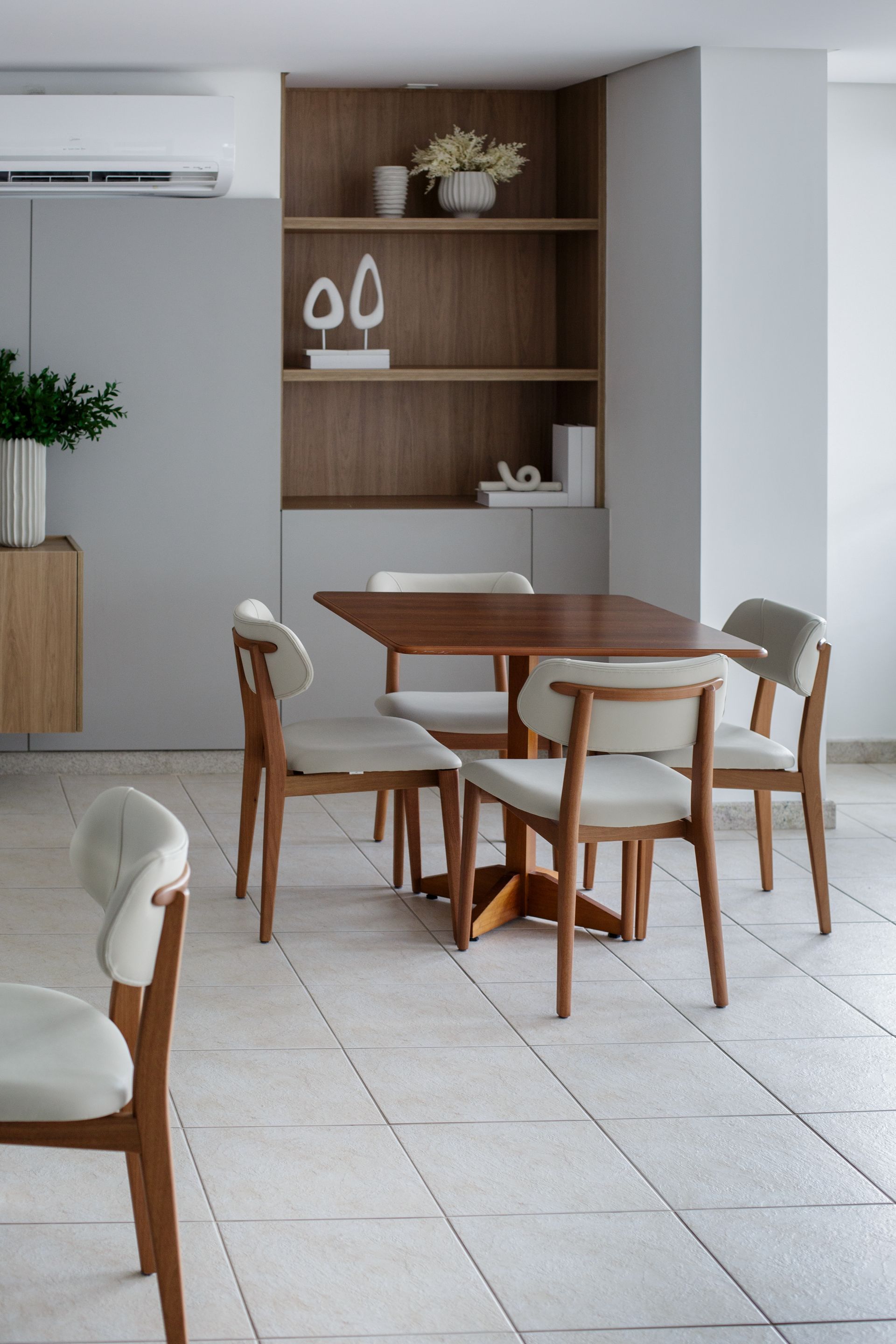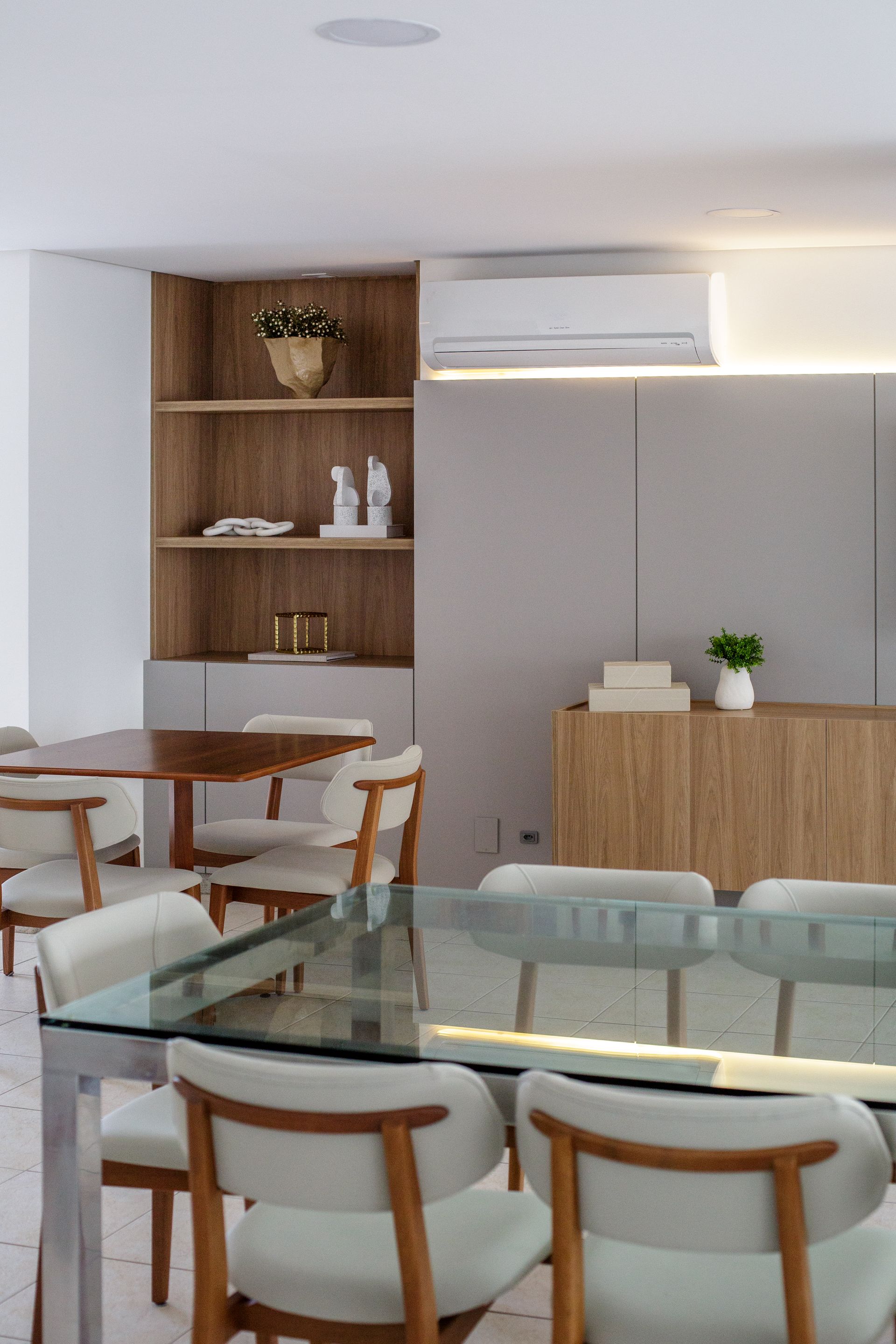 No salão de festas, a intervenção seguiu uma lógica semelhante, mas com maior liberdade de transformação. A necessidade inicial do espaço foi mantida, com a mesma quantidade de mesas e cadeiras, porém com mobiliário novo e uma paleta mais clara. A escolha respondeu ao desejo dos moradores de se afastar dos tons escuros dos móveis originais, sem perder praticidade para o uso frequente do salão.