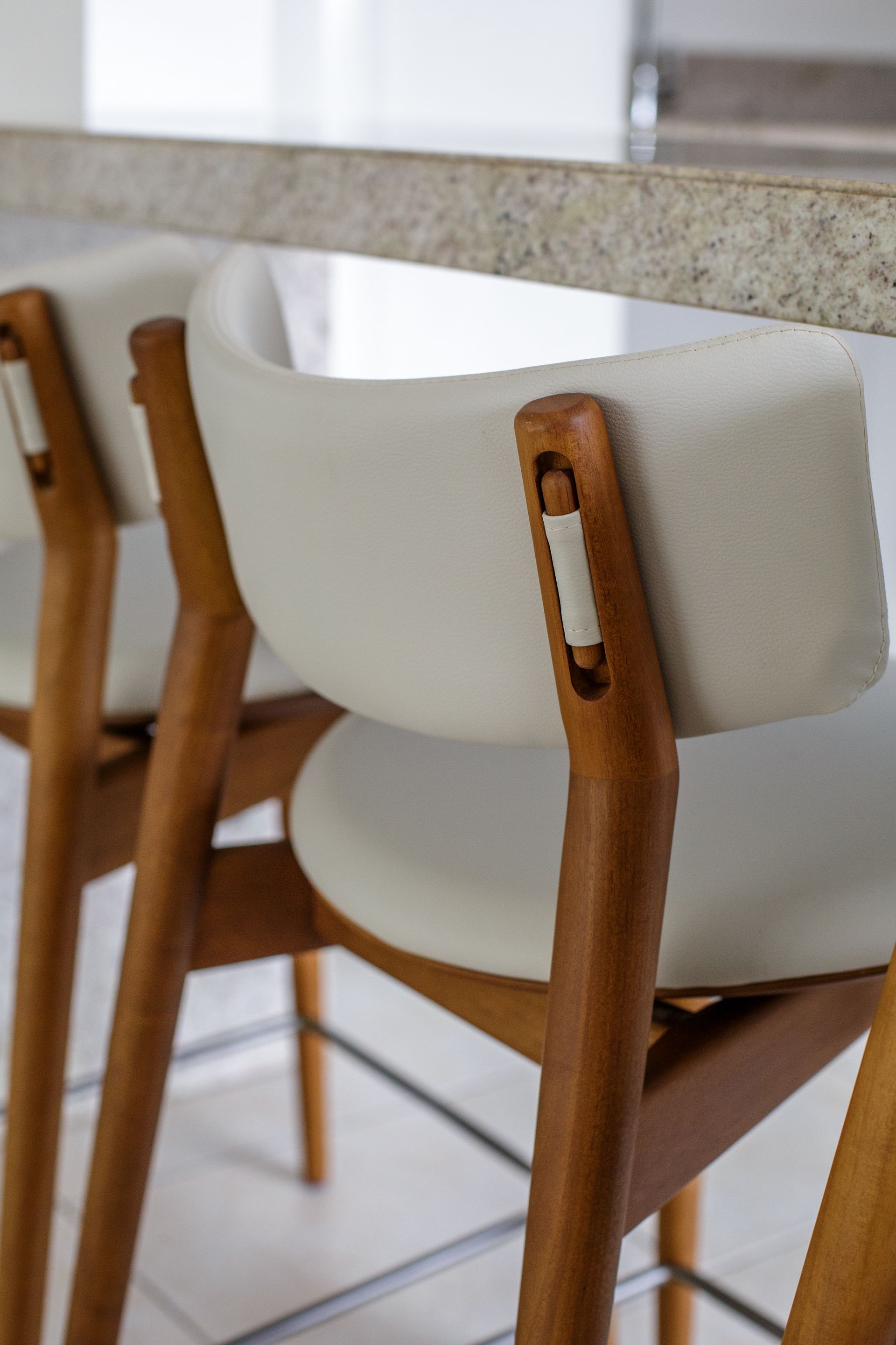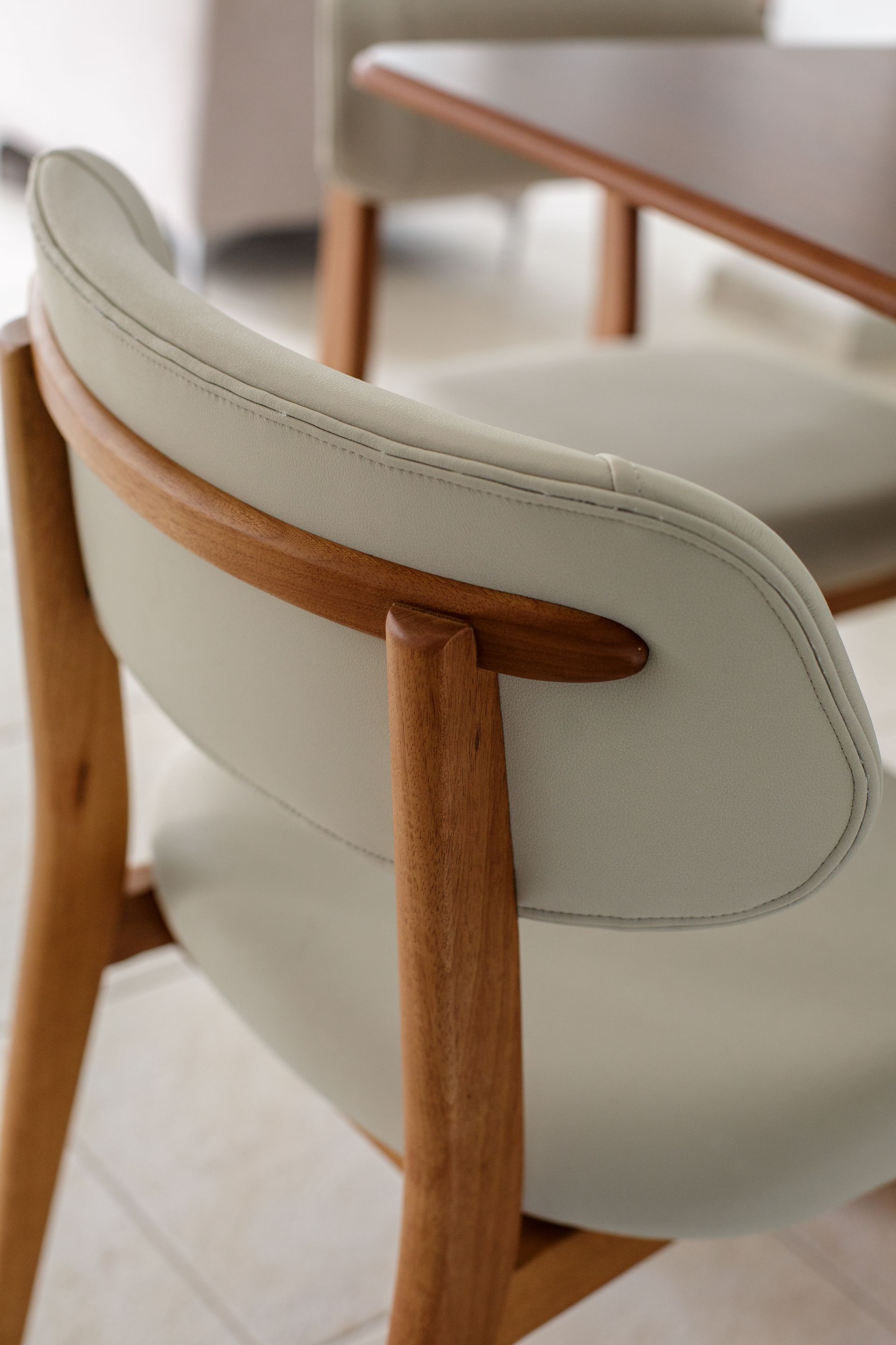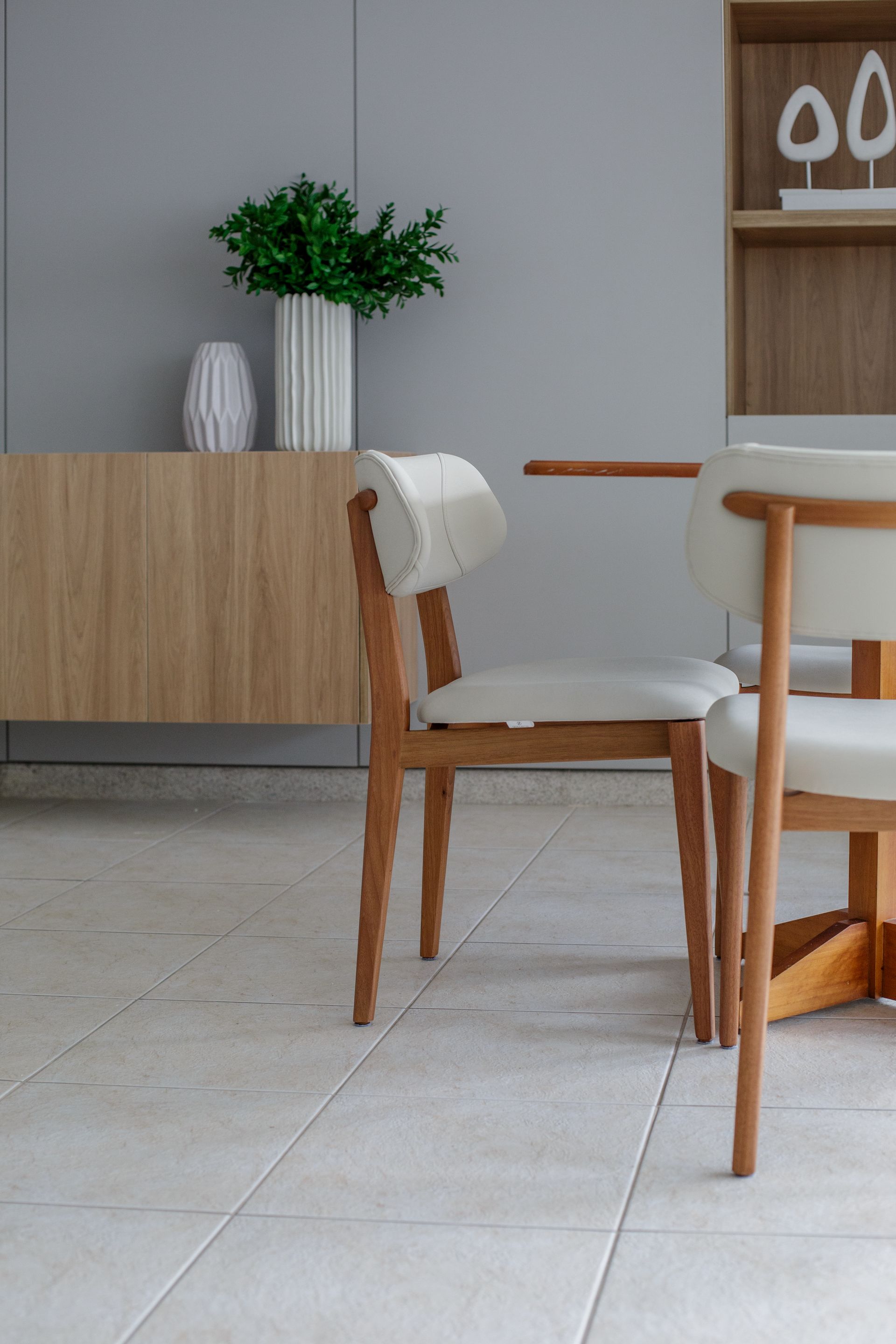 Para equilibrar uso coletivo, manutenção e aceitação entre diferentes moradores, Isabela optou por materiais de leitura segura e boa durabilidade. O couro aparece como uma escolha central, acompanhado por uma poltrona em tecido texturizado em tom de cinza médio. “Em condomínio, o projeto precisa conversar com gostos diferentes. O caminho foi buscar um resultado atual, mas sem tornar o espaço difícil de absorver no uso cotidiano”, afirma a arquiteta.