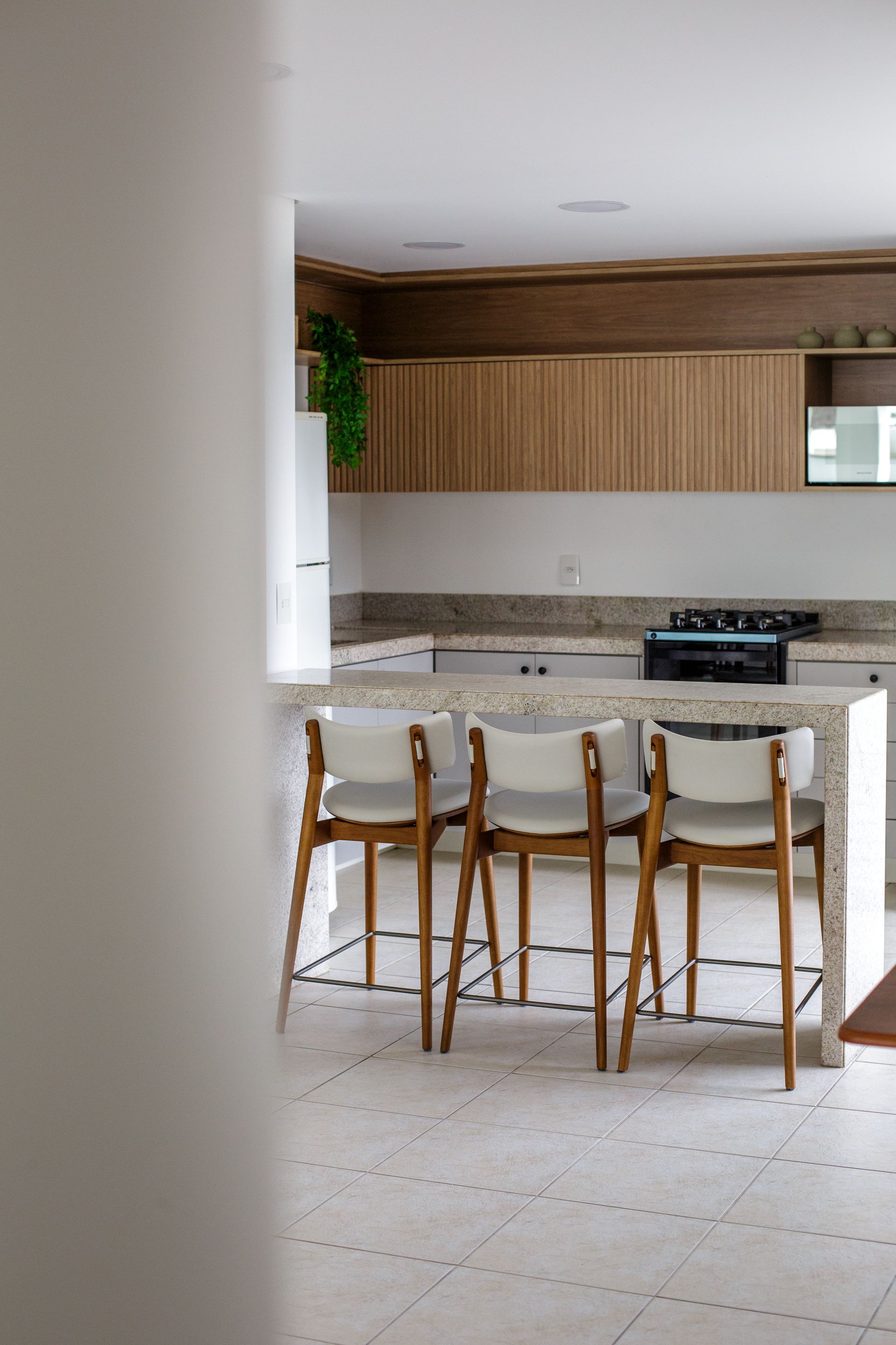 A marcenaria sob medida também teve papel importante nesse ambiente, com a criação de uma nova cozinha e de um painel com aparador. Esses elementos reorganizam visualmente o salão e dão suporte às atividades já consolidadas no cotidiano do condomínio, que utiliza o espaço de forma assídua.