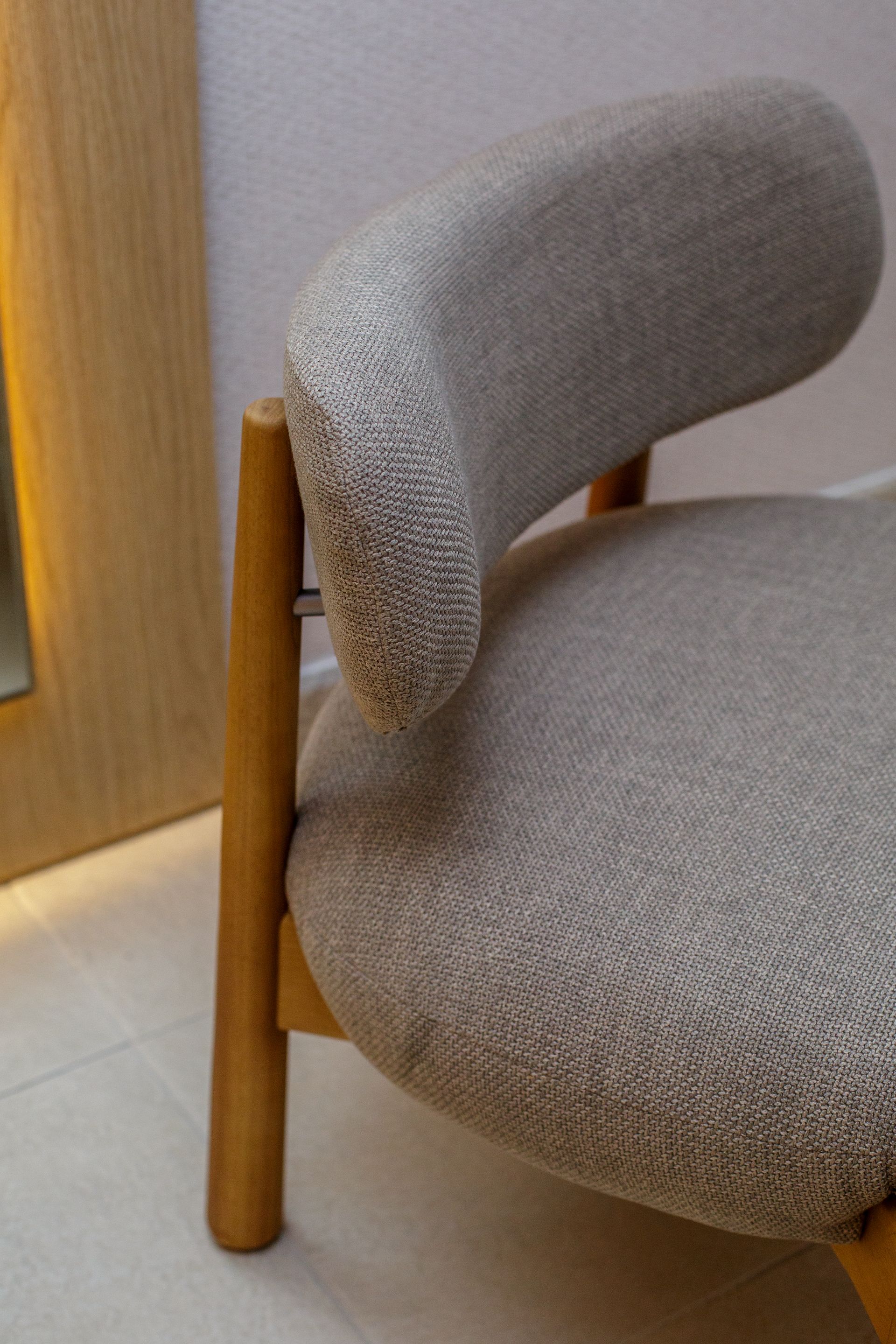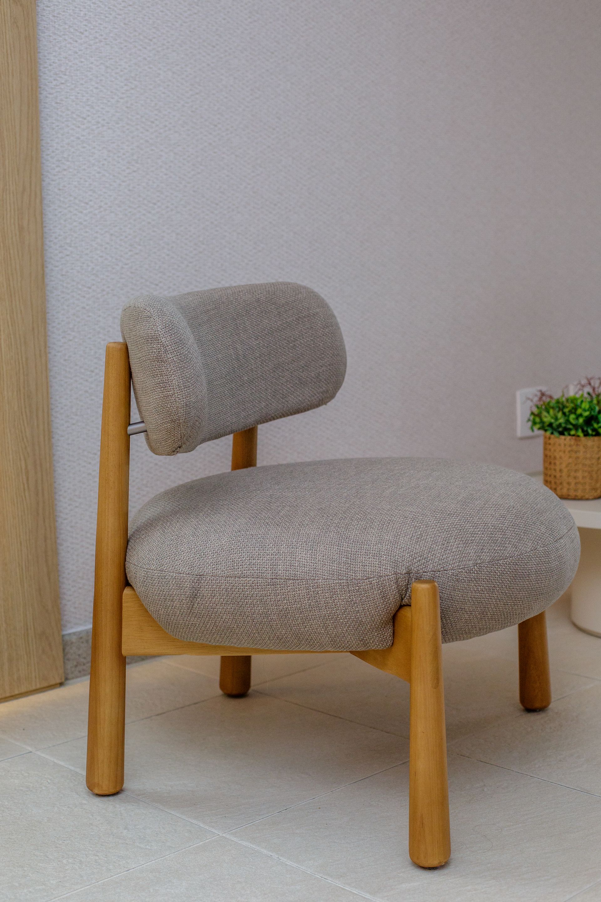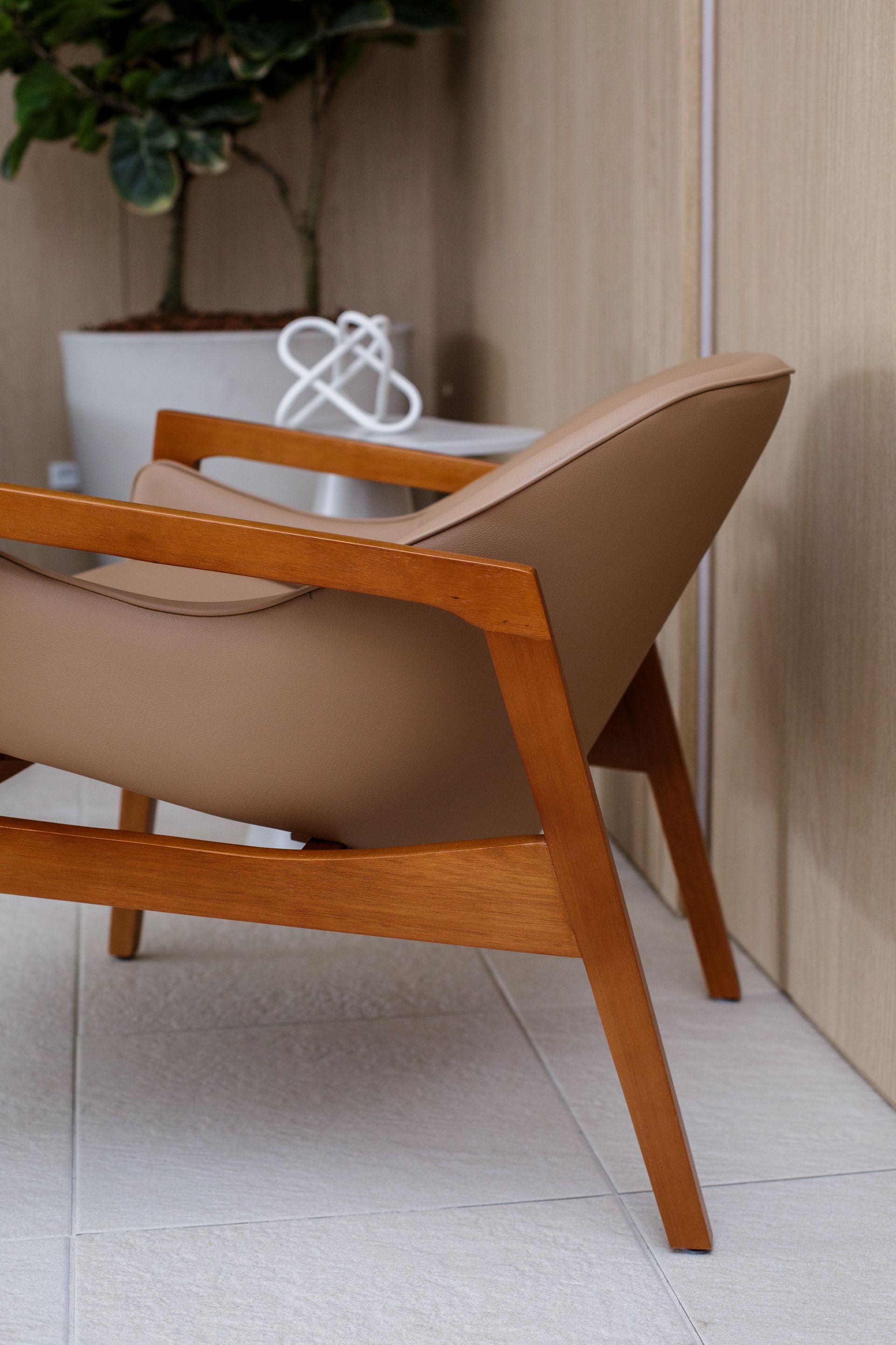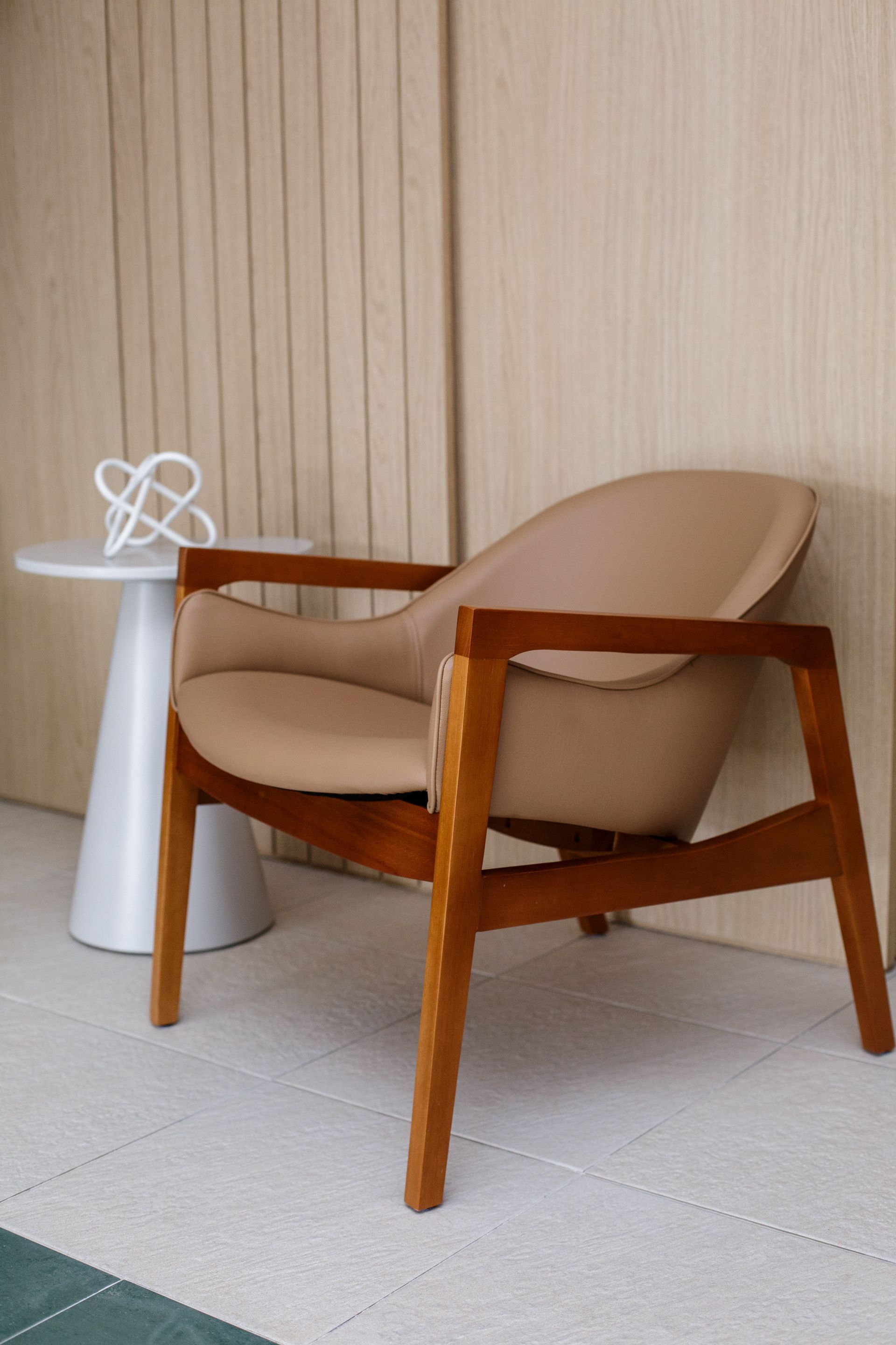 ContTi Home Design contribui para essa medida entre presença e discrição. Entre os itens escolhidos estão a cadeira Sit, a mesa lateral Luna, a banqueta Baia, assinada por Ibanez Razzera, a poltrona Pantalona, de Lorenzo Razzera, e a poltrona Maestra. O conjunto traz desenho contemporâneo e escala adequada ao hall, respeitando a função de circulação do ambiente.