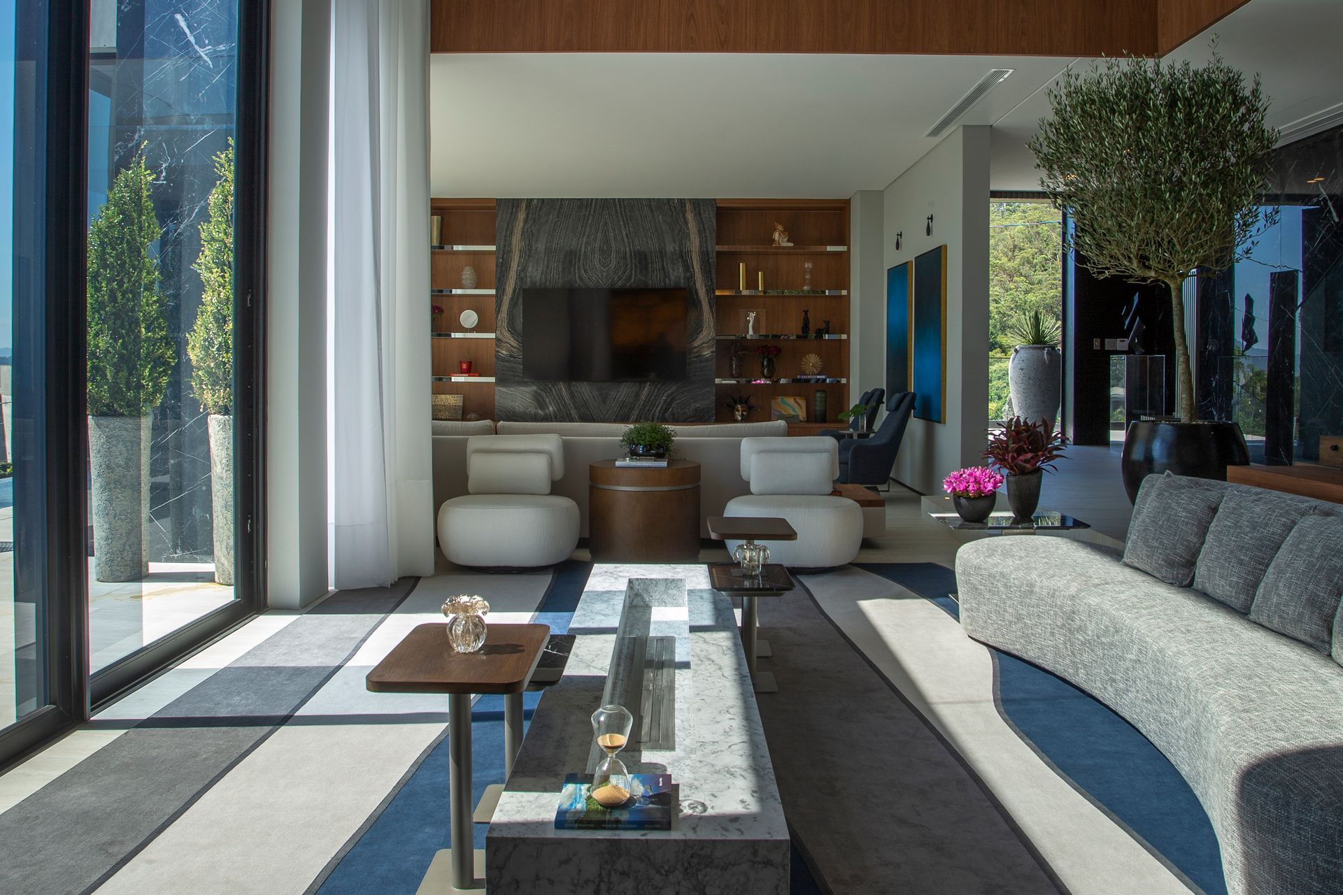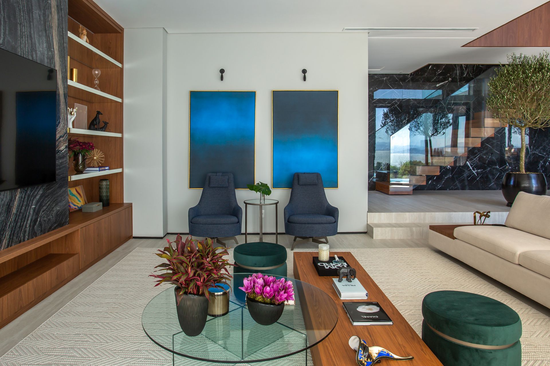 A arquitetura abre a casa para a paisagem com grandes vãos voltados ao mar e à Mata Atlântica, enquanto o interior trabalha com camadas de textura e contraste. Entram pedras naturais brasileiras e importadas, madeira natural em lâminas e pontos de destaque como a lareira em mármore Carrara, a cozinha com ônix White iluminado e o painel de TV em Nero Madeira. A paleta não segue um conjunto fechado: pedras claras e escuras e madeiras em diferentes tonalidades convivem com azuis pontuais, escolhidos para acompanhar o que a casa oferece de mais presente no dia a dia, a vista e o pôr do sol.