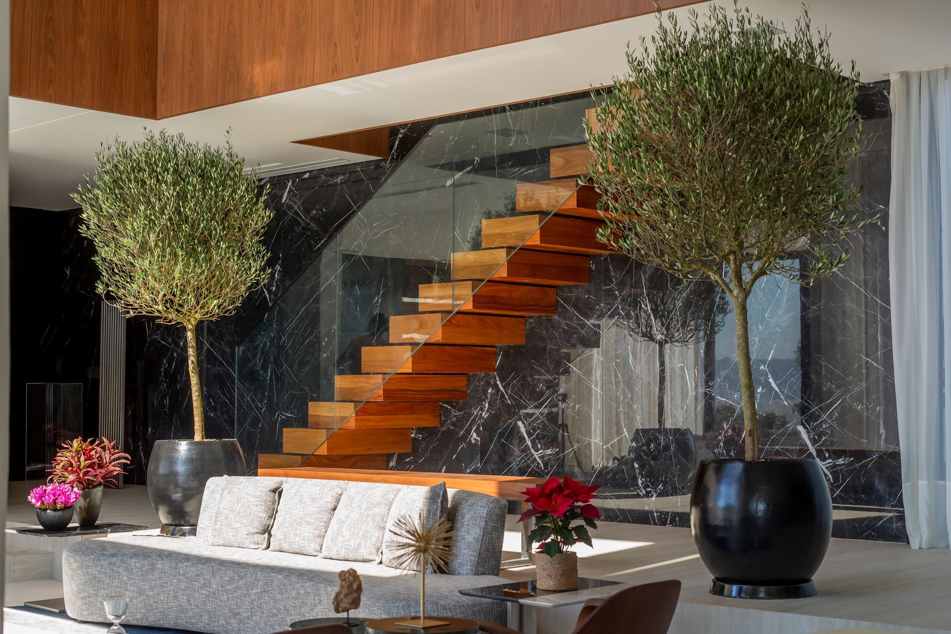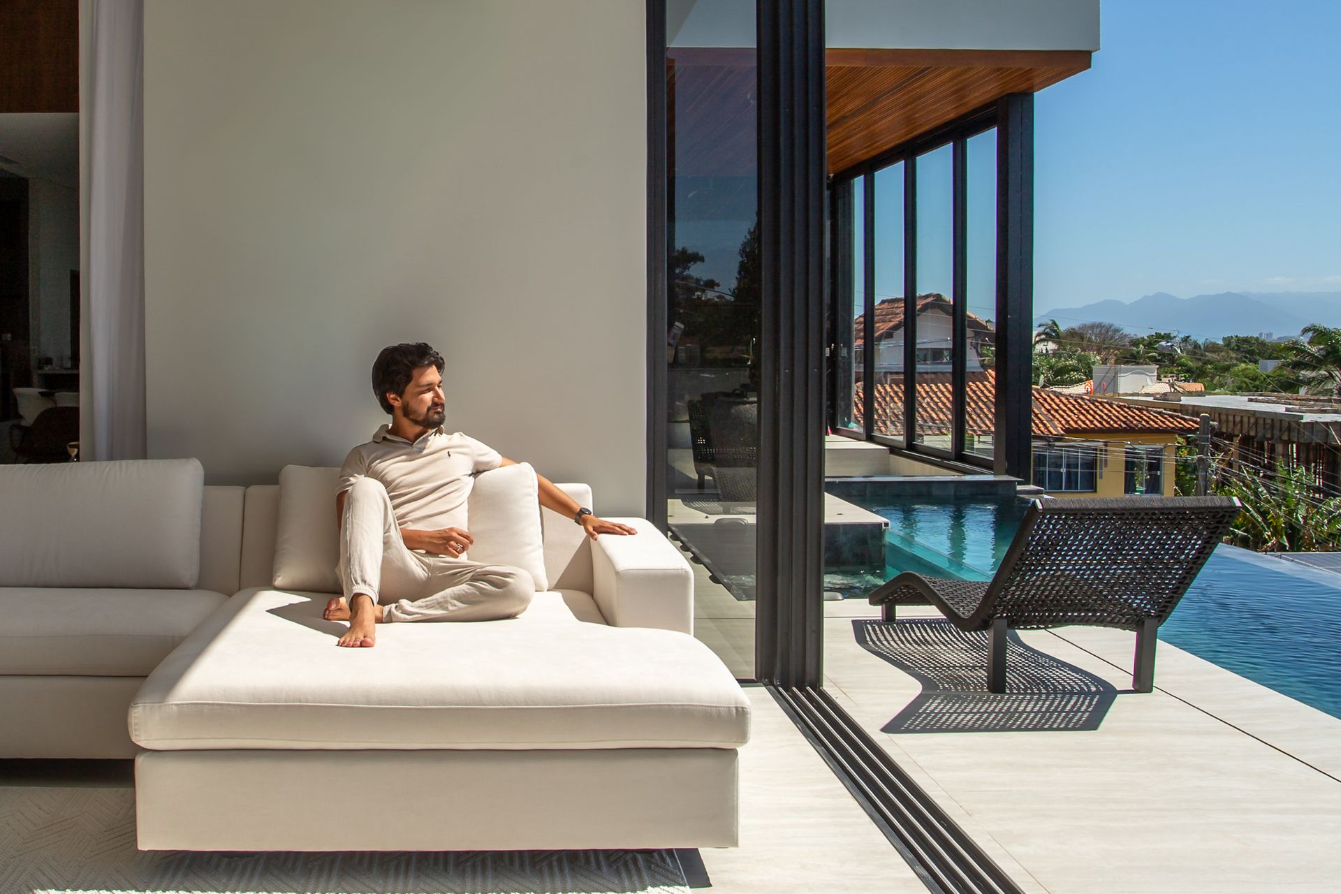 Com 1.000 m² de área útil e 1.300 m² no total, esta casa em Cacupé, em Florianópolis, foi desenhada do zero para um casal de médicos, na casa dos 35 anos, que gosta de receber amigos e família. O briefing pedia uma área social ampla, uma área de festas e uma piscina de borda infinita voltada para o mar. Segundo o arquiteto Antônio Couceiro, como a residência é grande e tem pé-direito alto, havia o receio de que os ambientes ficassem frios, o que levou à escolha de muita madeira e pedra natural para sustentar a sensação de acolhimento.