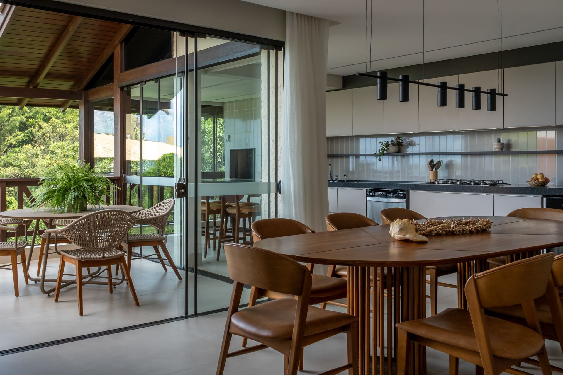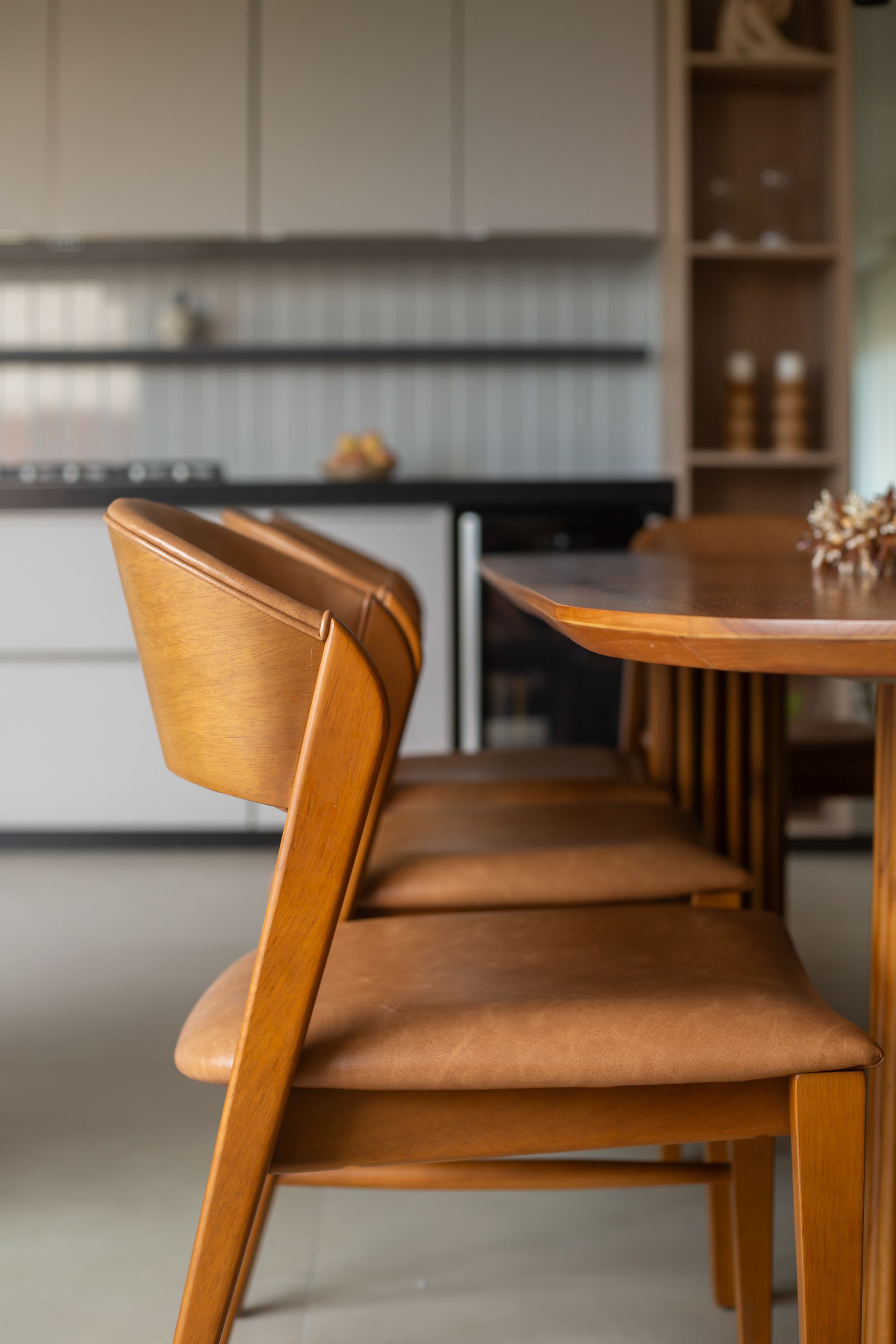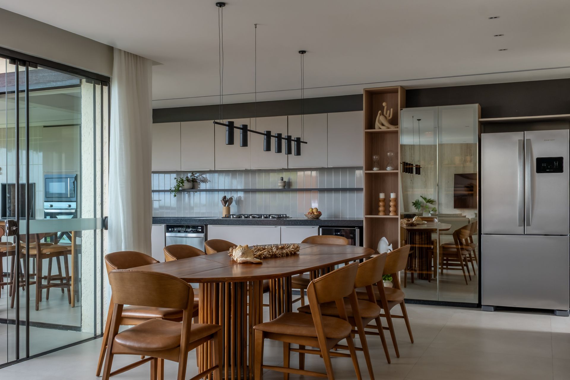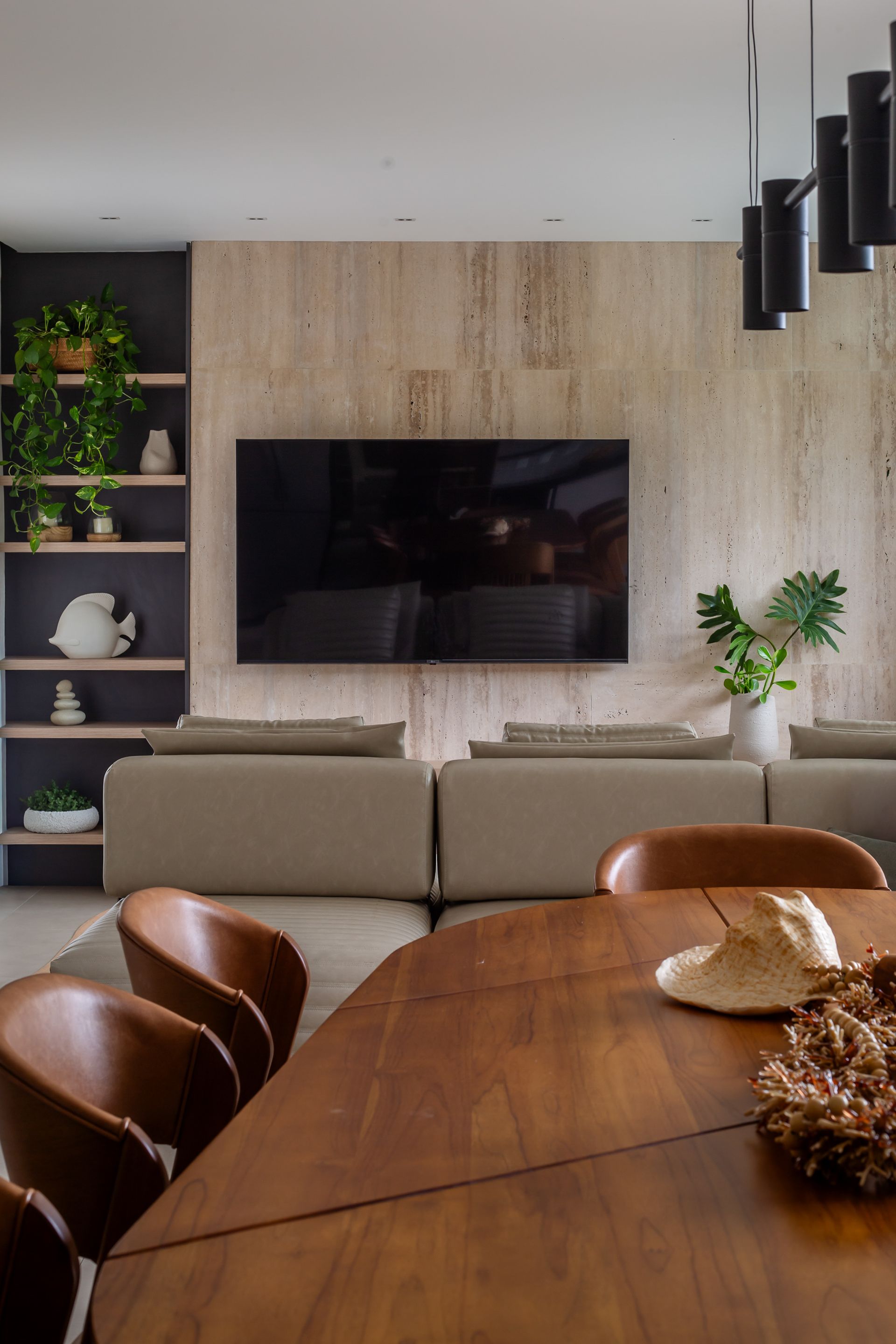 A escolha do mobiliário solto partiu do mesmo raciocínio: peças resistentes, de manutenção simples e capazes de organizar a planta integrada. Da ContTi Home Design, o projeto reúne um sofá elétrico pensado para funcionar em dois sentidos de uso, atendendo tanto ao momento de TV quanto ao apoio próximo ao jantar. A área de refeições foi estruturada com mesa de jantar, do Estudio Razzera, dimensionada para 10 lugares, e com a cadeira Lia, do designer Ibanez Razzera, reforçando a prioridade do encontro à mesa.
