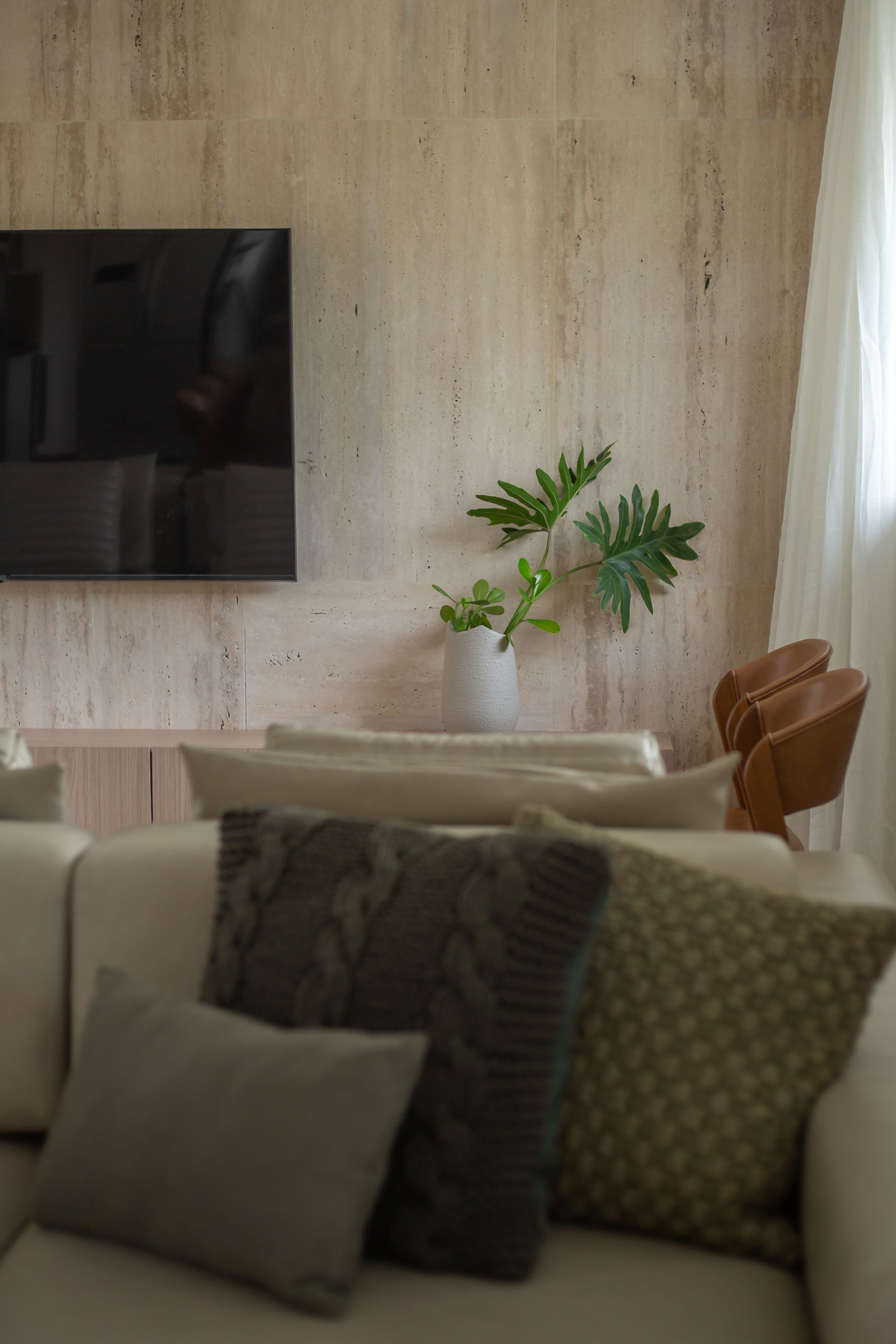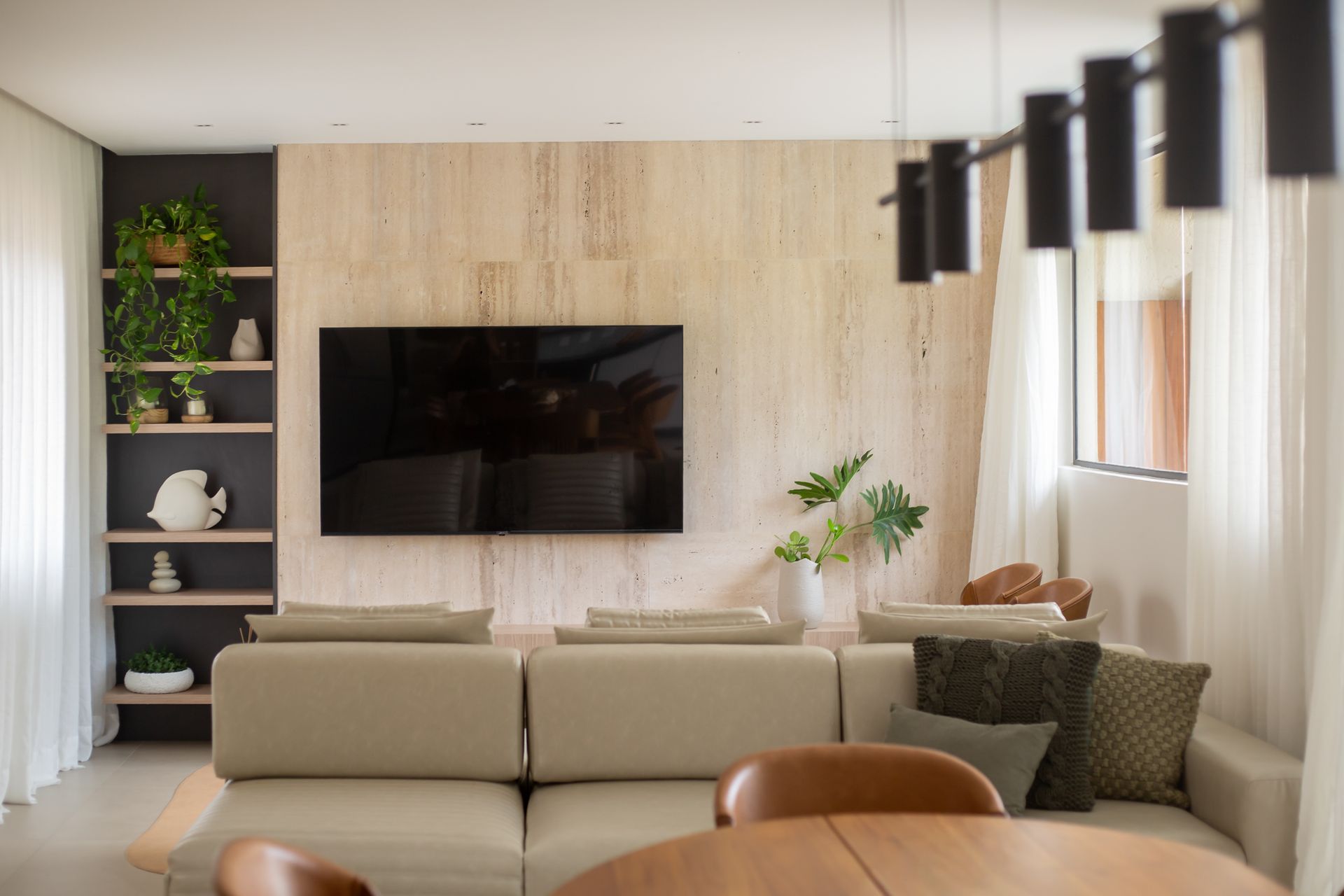 Nos acabamentos, a base clara organiza o interior: nude com pinceladas de amadeirado e grafite nos MDFs, contraste com a pedra Preto São Gabriel nas bancadas e painel da TV em travertino bruto. As cortinas off-white de linho filtram a luz e ajudam a manter o clima de casa de férias. A iluminação foi resolvida com perfis de LED e embutidos downlight no pavimento social, enquanto o ambiente íntimo recebeu plafons dentro do padrão do resort. Toda a marcenaria foi feita sob medida, incluindo o deck do spa e o painel da TV. A arquiteta também desenhou o tapete orgânico e colorido citado no projeto.