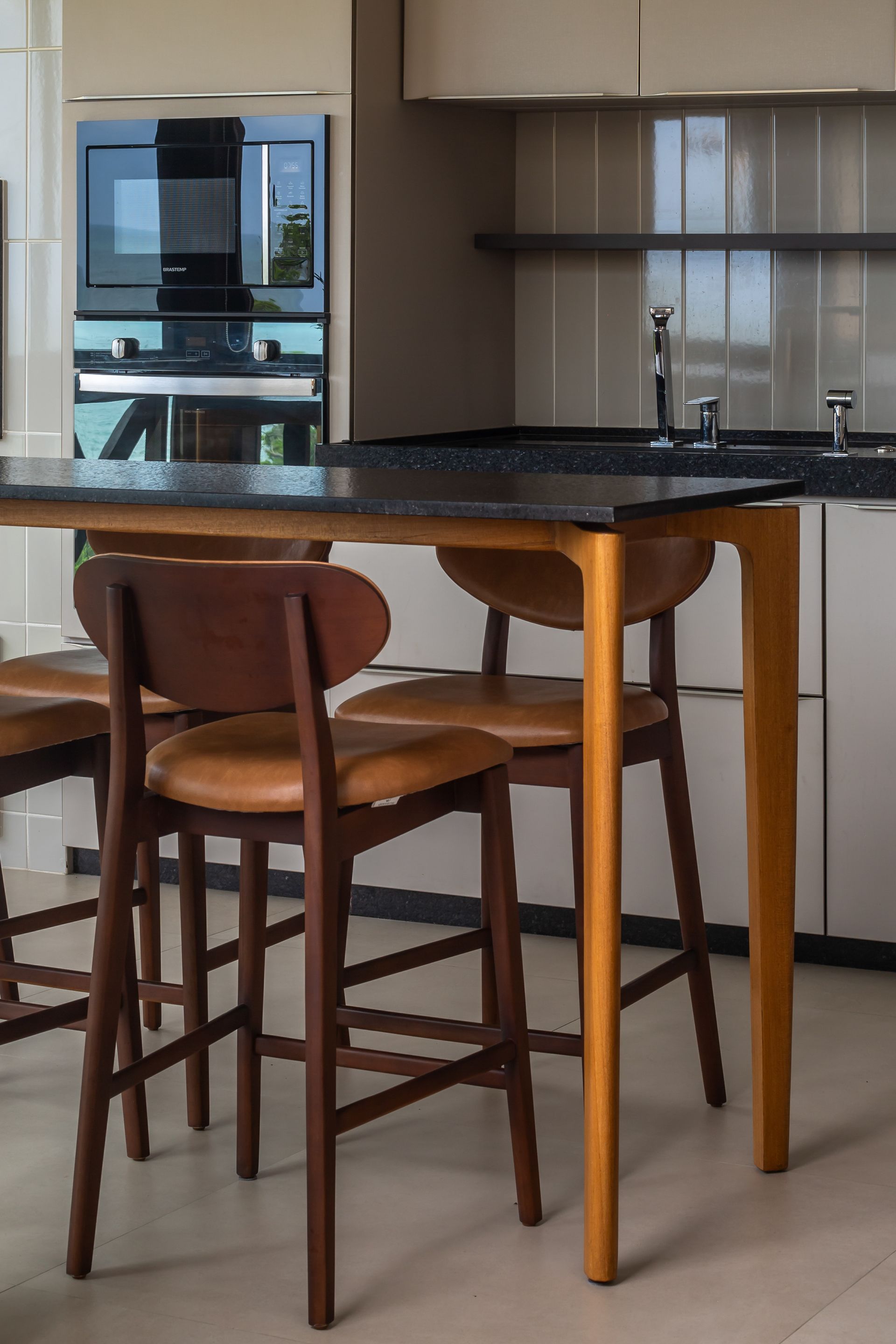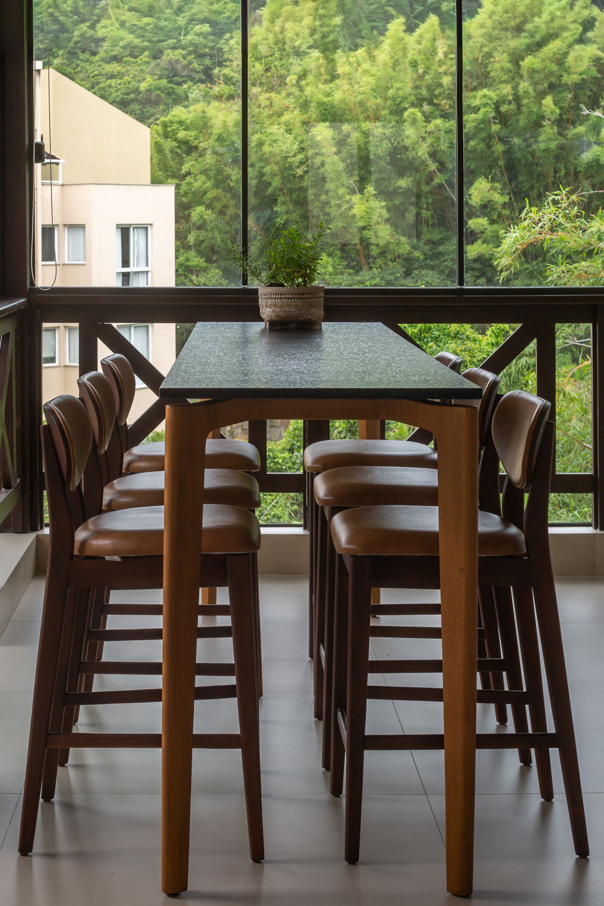 banqueta Aiko, adequada para refeições rápidas e uso constante. No terraço, a ambientação externa foi composta por