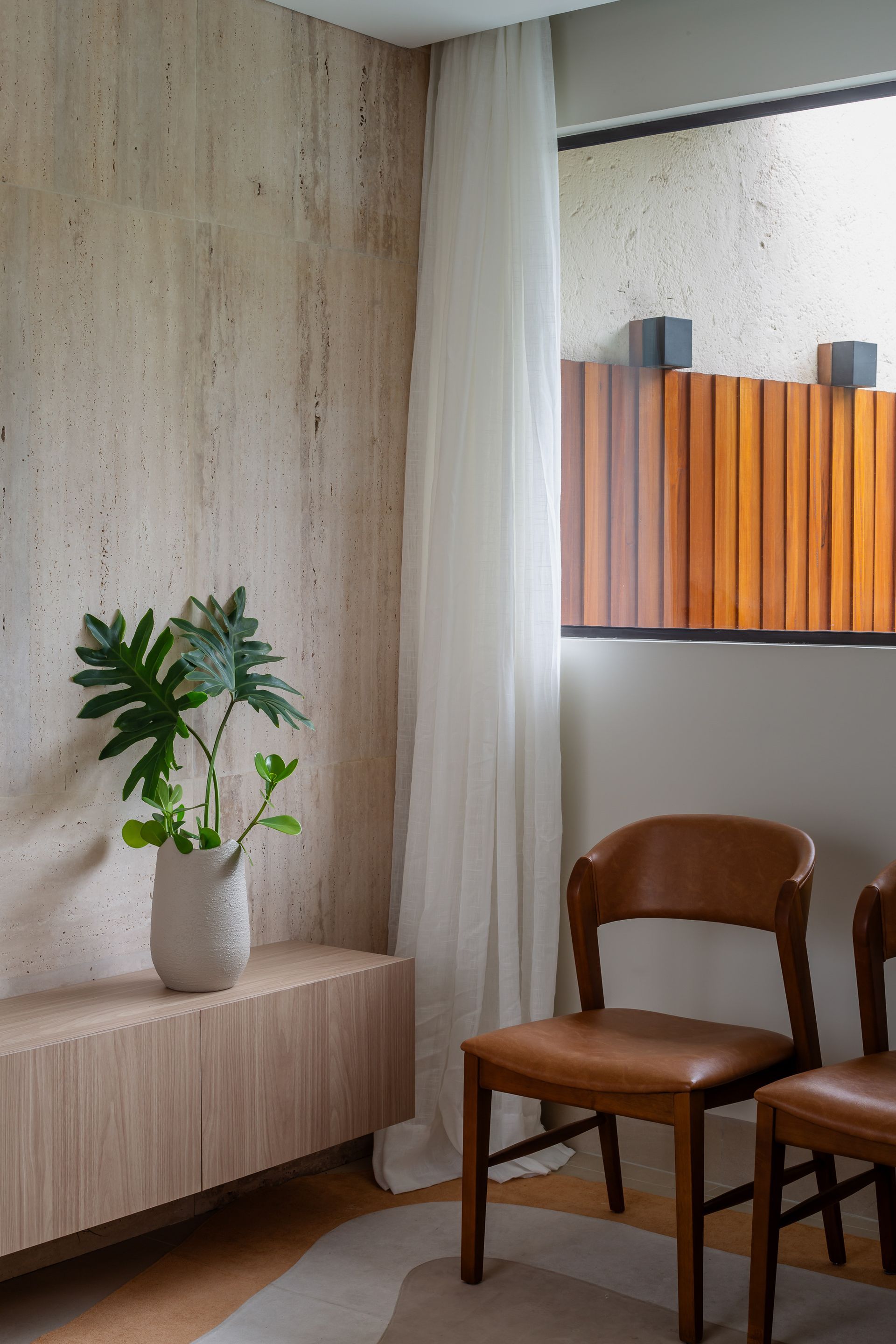 O resultado é um apartamento de temporada que troca a lógica do “padrão” por uma planta ajustada ao cotidiano real da família: cozinha e churrasqueira como centro operacional, jantar amplo como lugar de permanência e um terraço que deixa o spa entrar na rotina sem virar evento. “A ideia foi criar espaços integrados e leves, prontos para o desfrute”, resume a arquiteta.