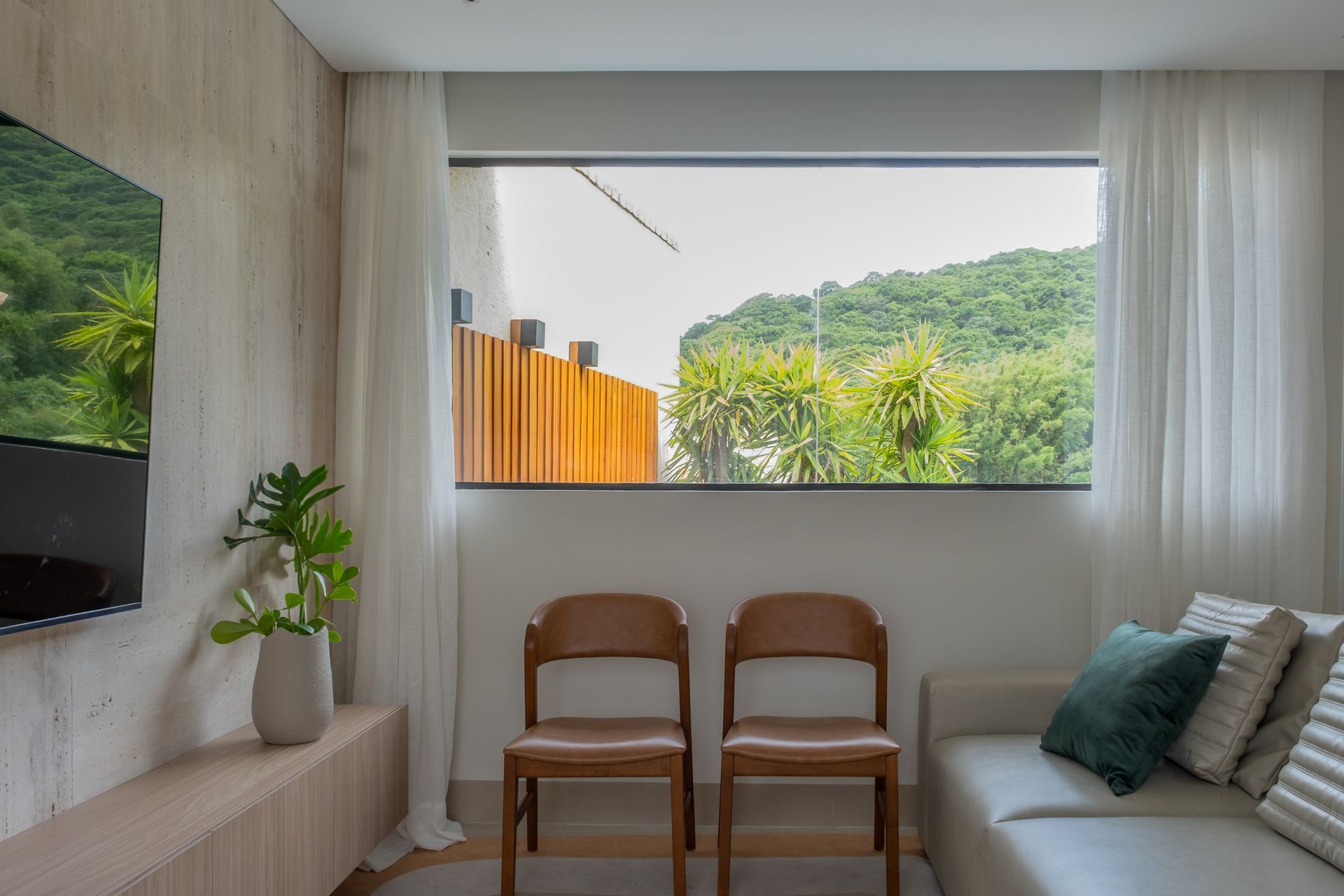 Em 177 m² de área útil, a arquiteta Bianca Schuch reformou o apartamento original do resort, criou quatro suítes e redesenhou a área social integrada, com terraço e spa.
