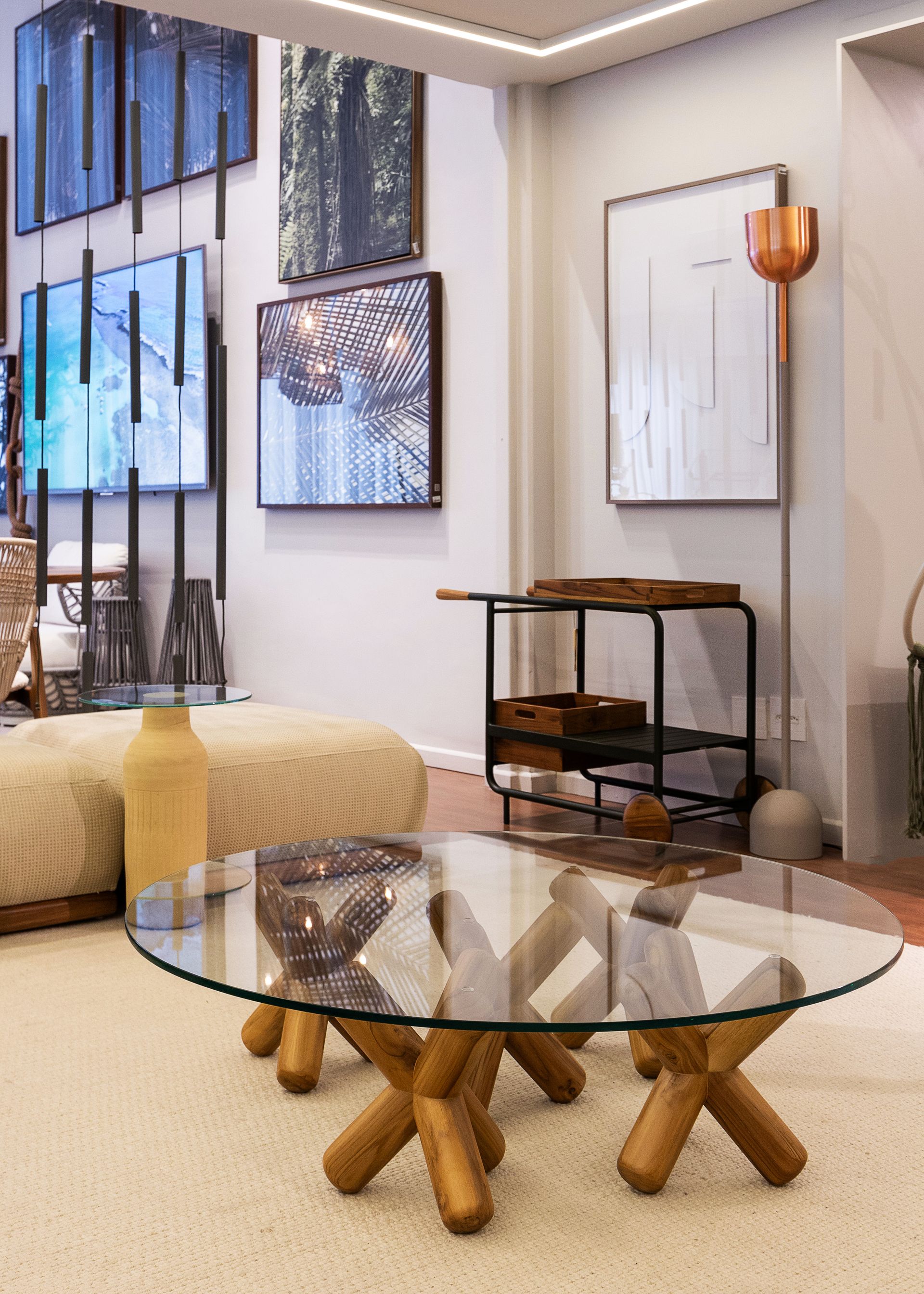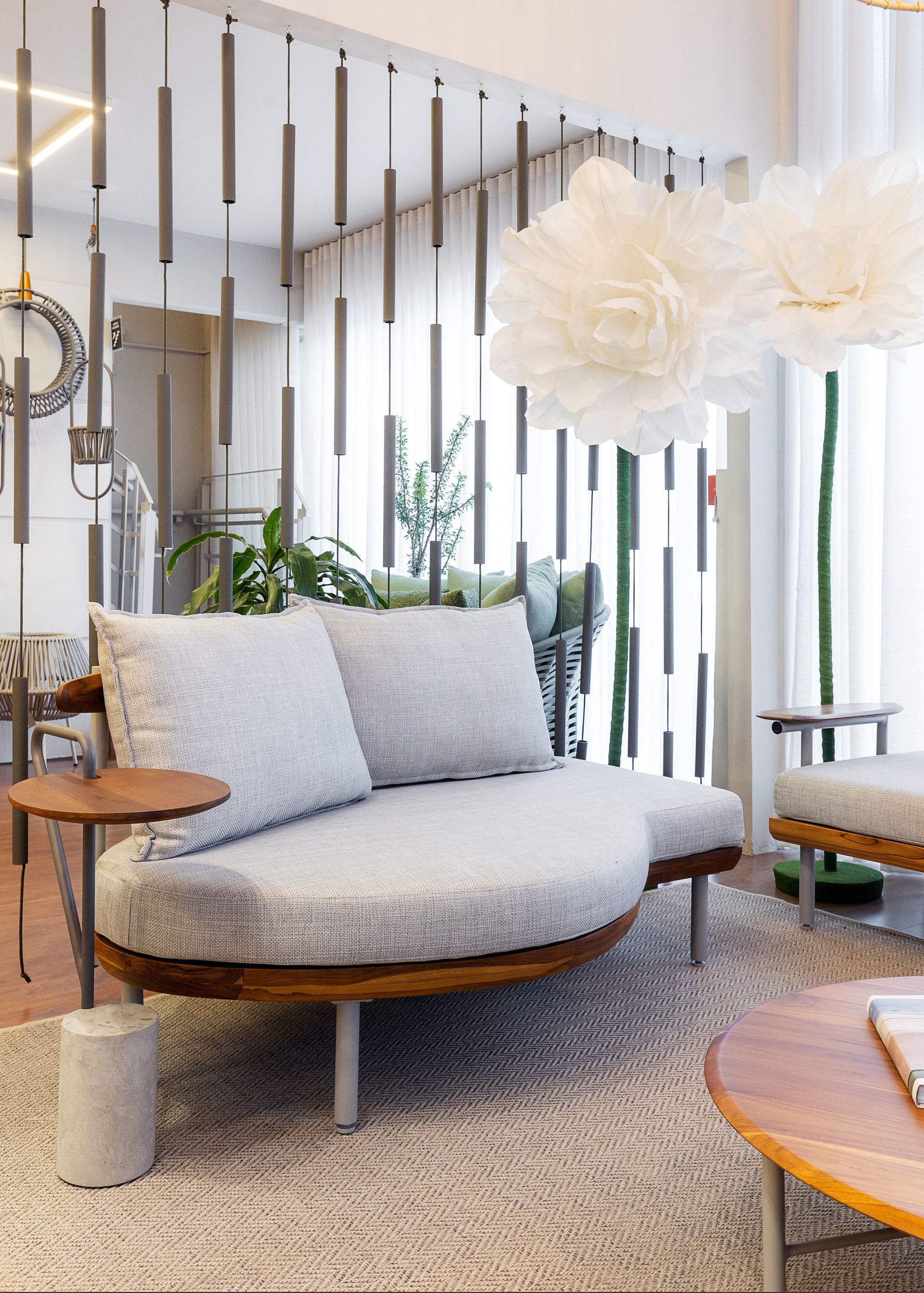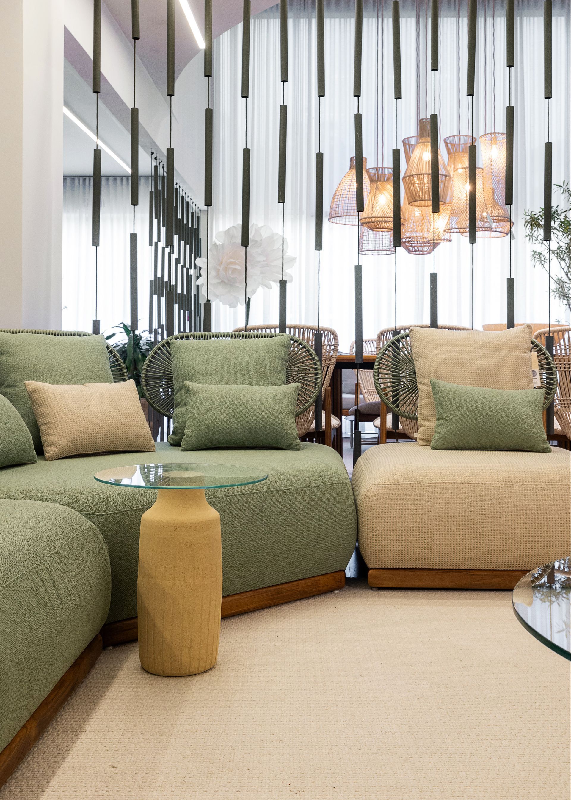 Ao lado do Dolce, outras criações ajudaram a dar vida e beleza ao espaço, como a mesa Guaimbê, a cadeira Lira e o carrinho bar Axys, todos criações de Ibanez Razzera, além da chaise Trancoso e do balanço Pérola, assinados por Alé Alvarenga e Marta Manente, respectivamente. Cada uma dessas pepças, juntas com outras do Studio Modalle, reforçaram o conceito de integrar a estética interna aos ambientes externos, proporcionando conforto e durabilidade.