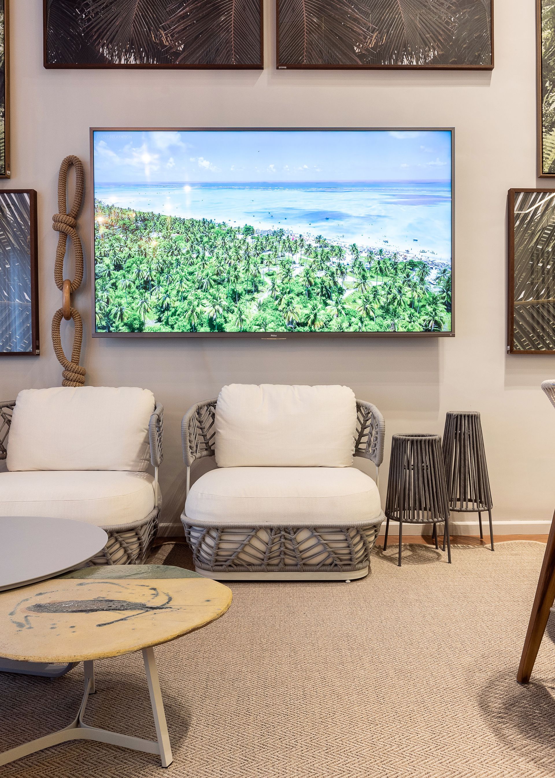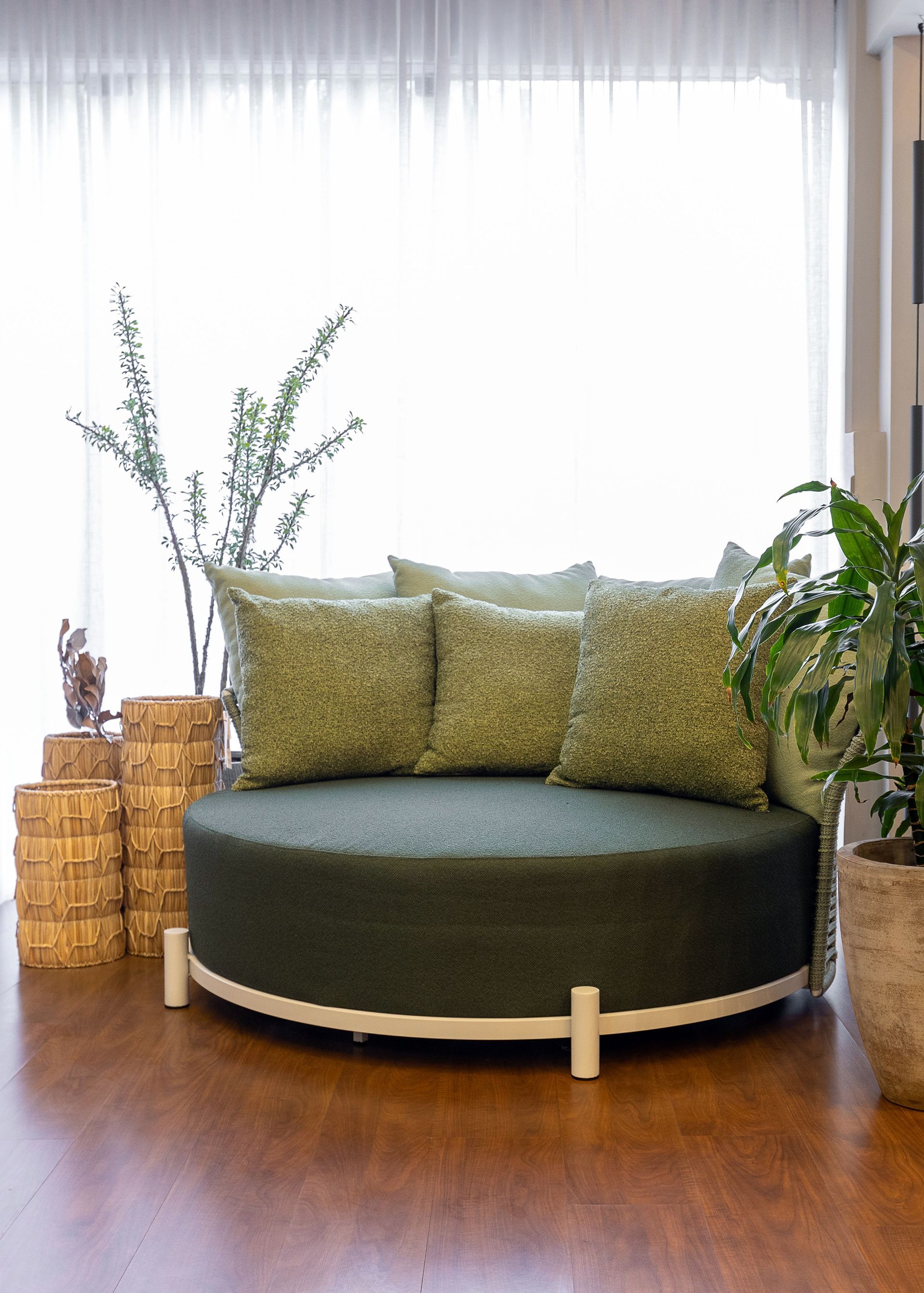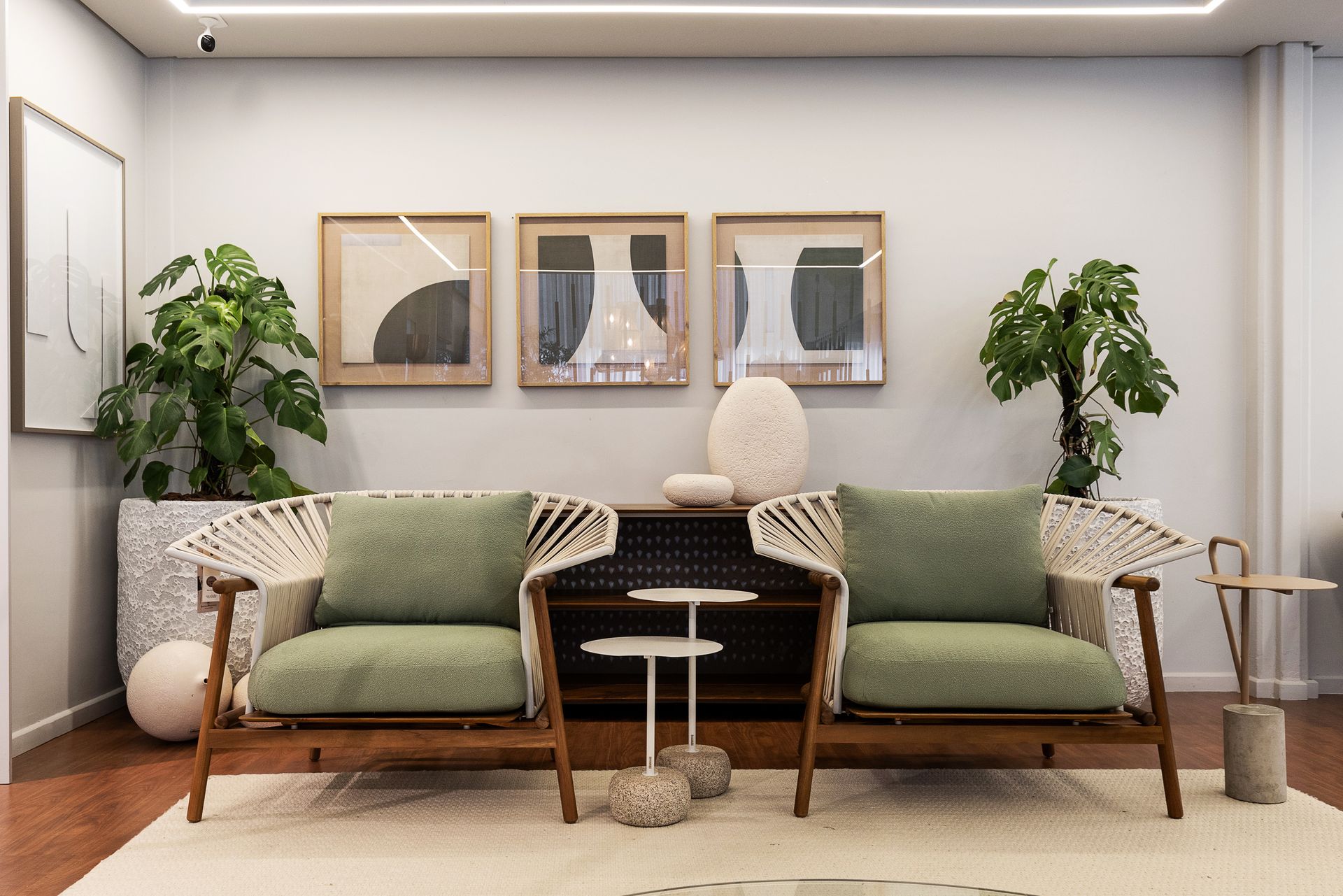 Ao lado do Dolce, outras criações ajudaram a dar vida e beleza ao espaço, como a mesa Guaimbê, a cadeira Lira e o carrinho bar Axys, todos criações de Ibanez Razzera, além da chaise Trancoso e do balanço Pérola, assinados por Alé Alvarenga e Marta Manente, respectivamente. Cada uma dessas pepças, juntas com outras do Studio Modalle, reforçaram o conceito de integrar a estética interna aos ambientes externos, proporcionando conforto e durabilidade.