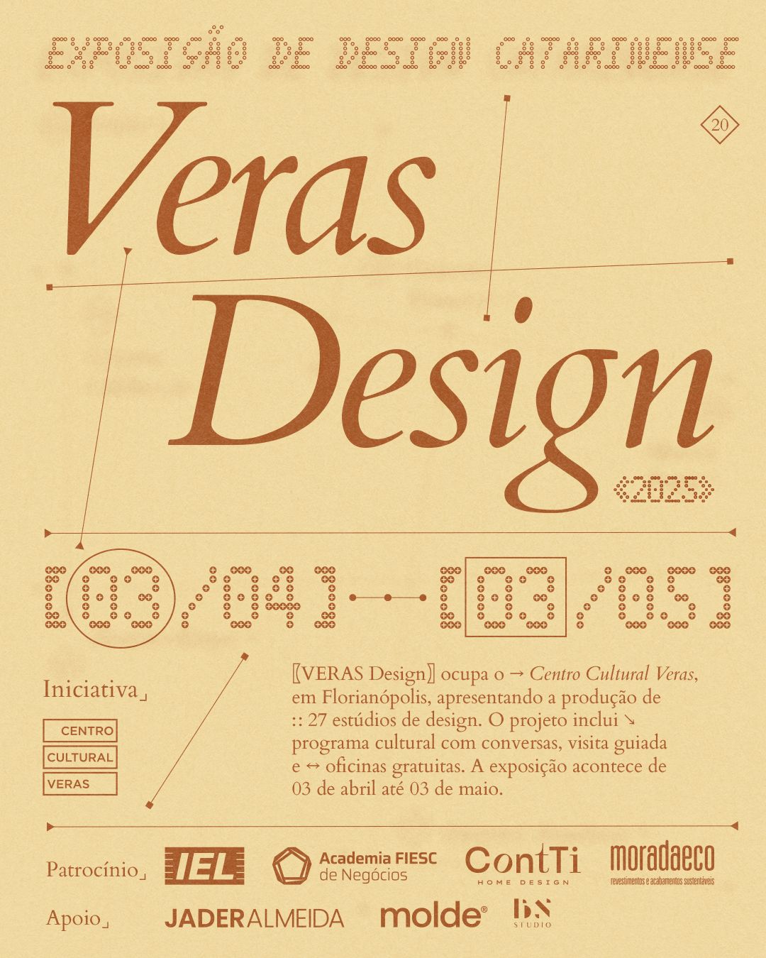 Ocupando os três pavimentos do Centro Cultural Veras até 3 de maio, a exposição oferece uma programação meticulosamente elaborada incluindo entrevistas online com criadores renomados, diálogos temáticos, visitas guiadas e oficinas práticas. Destaque para o tour especializado agendado para 5 de abril, às 11h, conduzido pelo trio curatorial composto por Celaine Refosco, Célio Teodorico e Simone Bobsin.