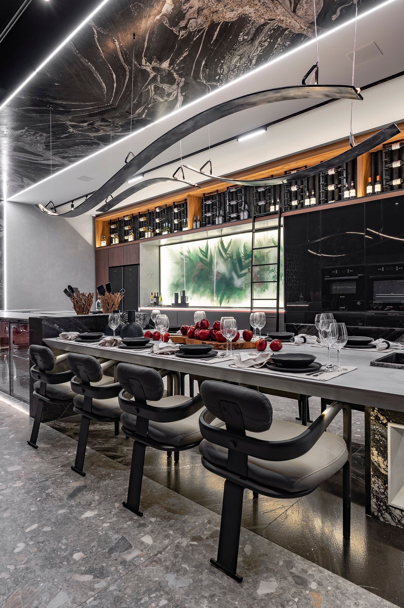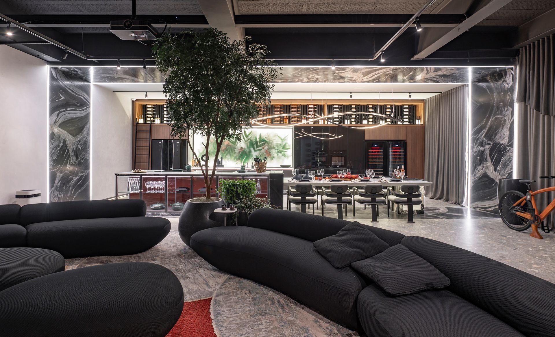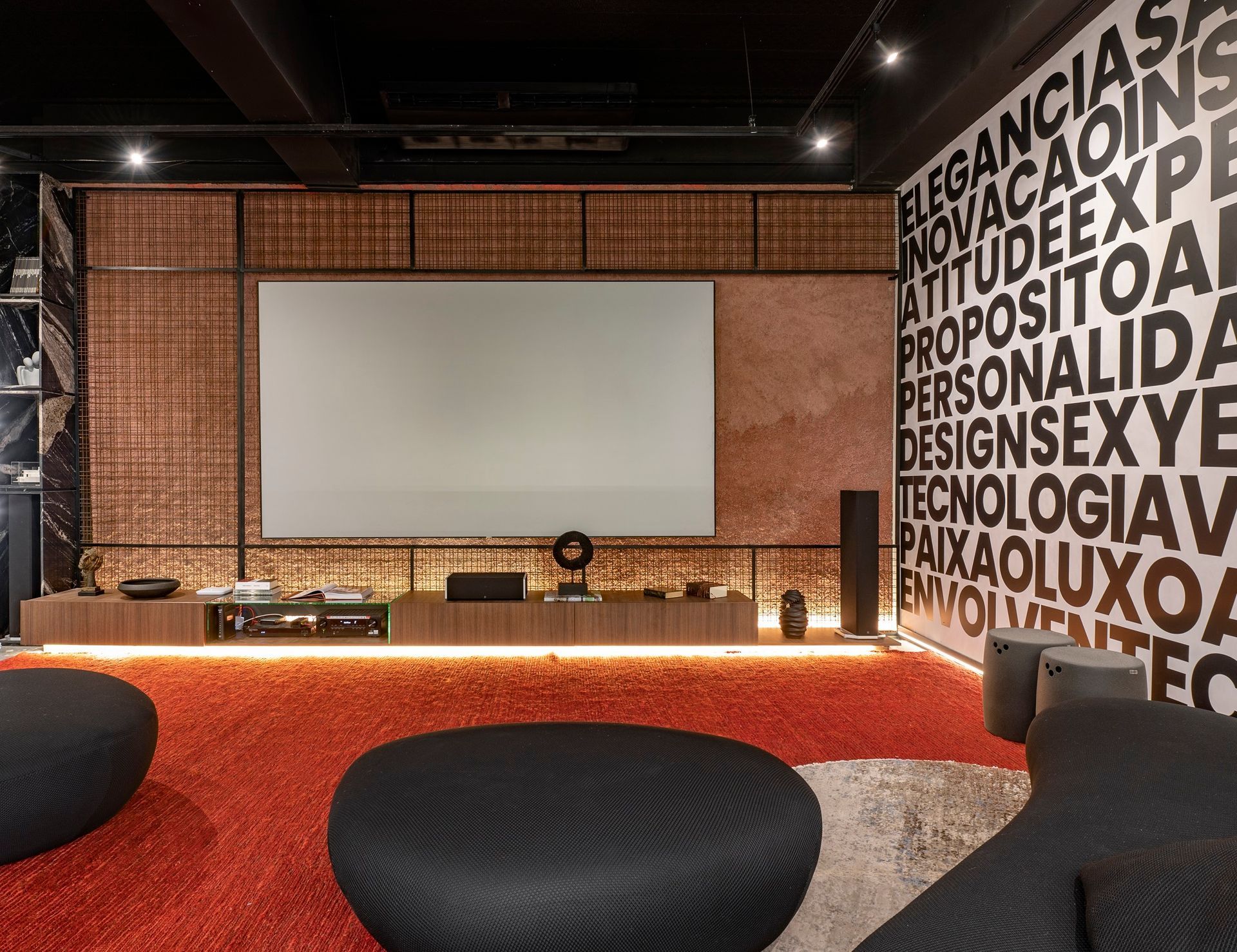 do Progetta Studio celebra a arte de receber, combinando um generoso living gourmet com toques industriais no décor. Uma adega em forma de biblioteca de vinhos exibe uma coleção de aproximadamente 90 rótulos da bebida. Recepcionar com estilo e degustar vinhos refinados torna-se ainda mais agradável com a presença da cadeira Stalk e dos sofás Fragmento, de Maurício Bomfim. O mobiliário contemporâneo e mezzo tecnológico inclui as mesas Safira, além da mesa de centro Float, da Ye Design, e a lateral Bend Flat, criada por Everton Visentini.