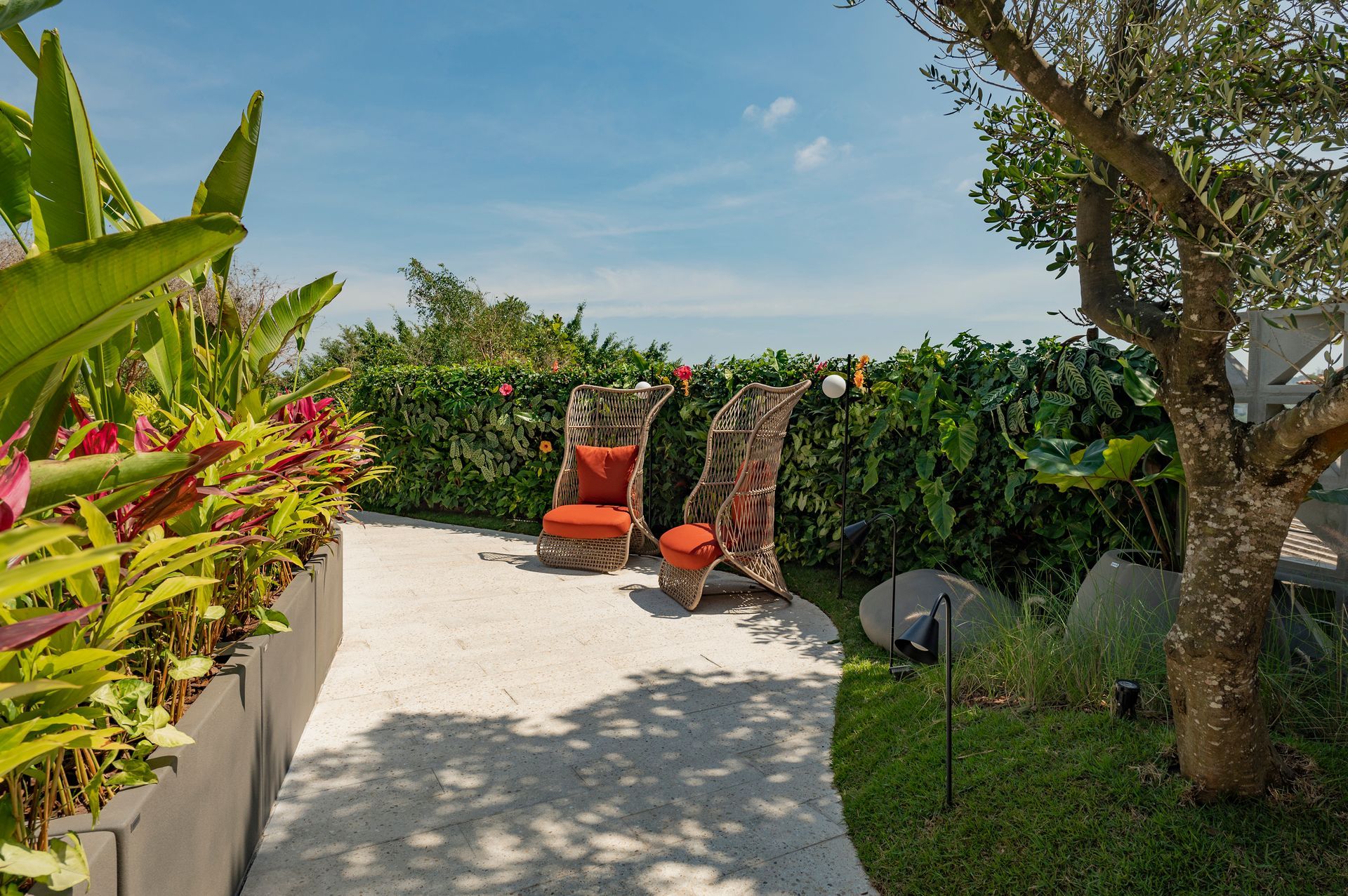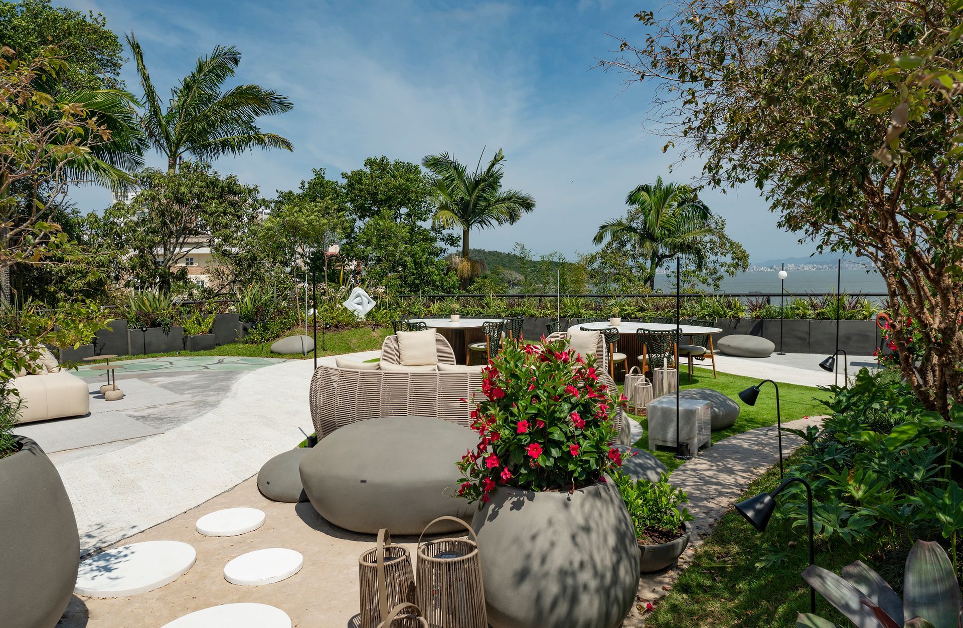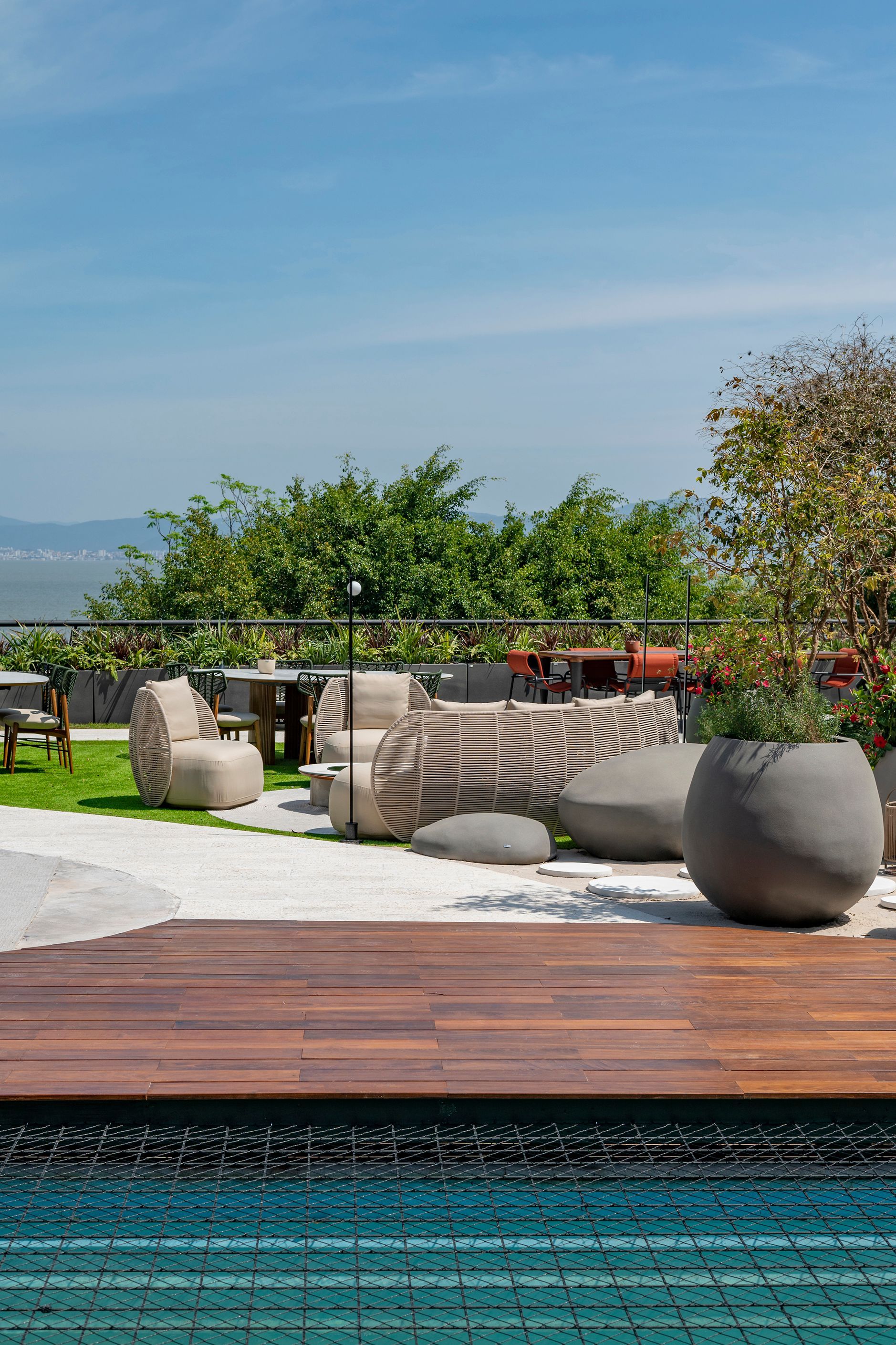 Terraço Floema, criado pelo grupo Le Nôtre, concentra-se na conexão com a natureza. Neste ambiente externo os profissionais criaram um paisagismo deslumbrante, um conforto ao corpo e a alma de quem passa por ali. Logo na entrada do jardim, encontram-se as poltronas Bendita e, aqui e ali, as poltronas modulares Maré, de Marta Manente. Este espaço de 400 m² foi inteiramente mobiliado em colaboração com a