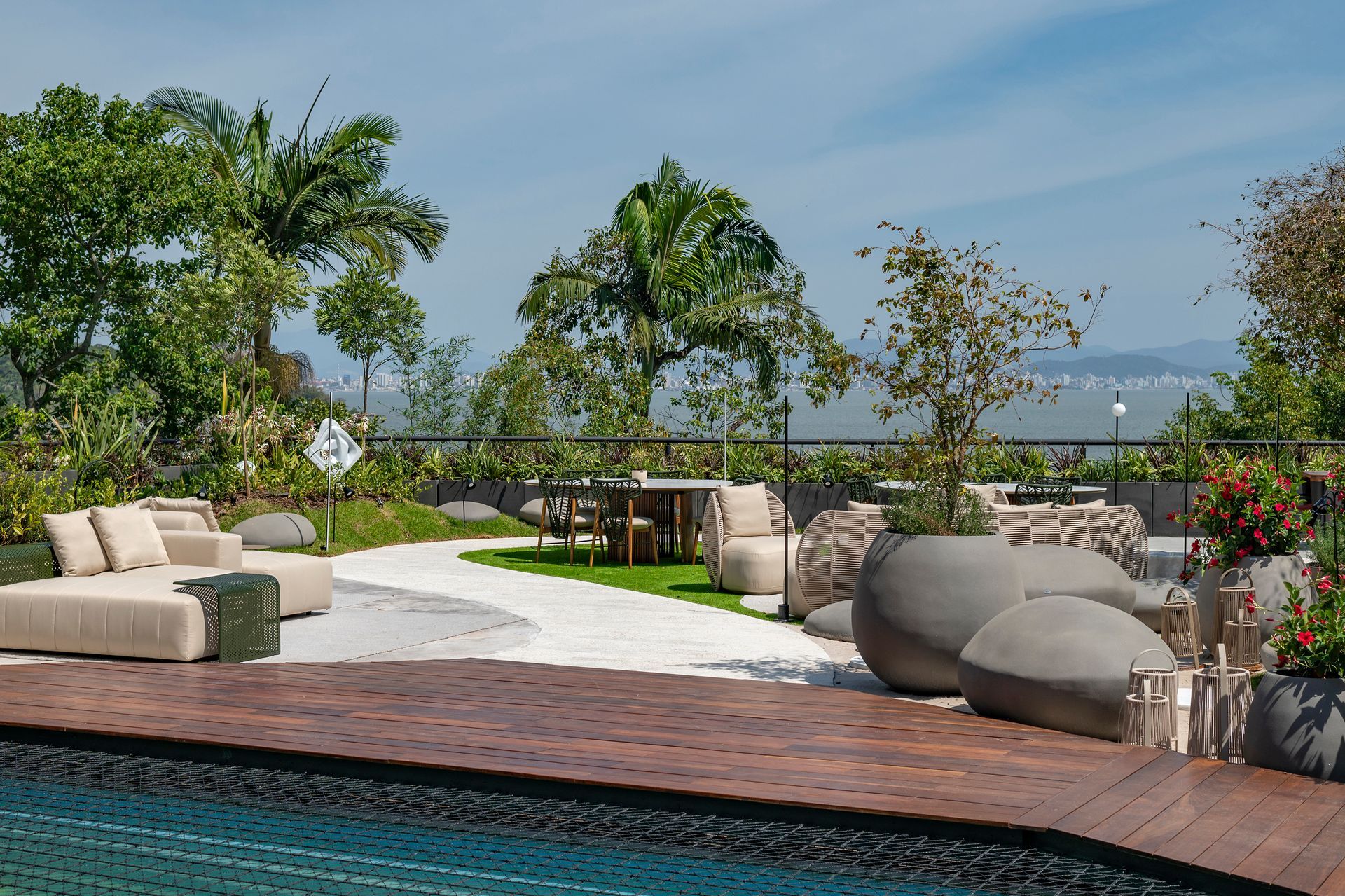 Contti. A mesa Faros, com design de Maurício Bomfim, foi estrategicamente posicionada com vista para o mar, enquanto o sofá Perlage, assinado por Manente, encontra-se cercado por jabuticabeiras e ladeado pelas mesas Azzure. A iluminação noturna é otimizada pelas nove luminárias Sulla, de Ibanez Razzera. Razzera também assina a chaise Oca e a mesa Marselle, rodeada pelas cadeiras Samambaia. É ou não é um convite a sentar e apreciar a paisagem deslumbrante combinada ao melhor do design nacional?