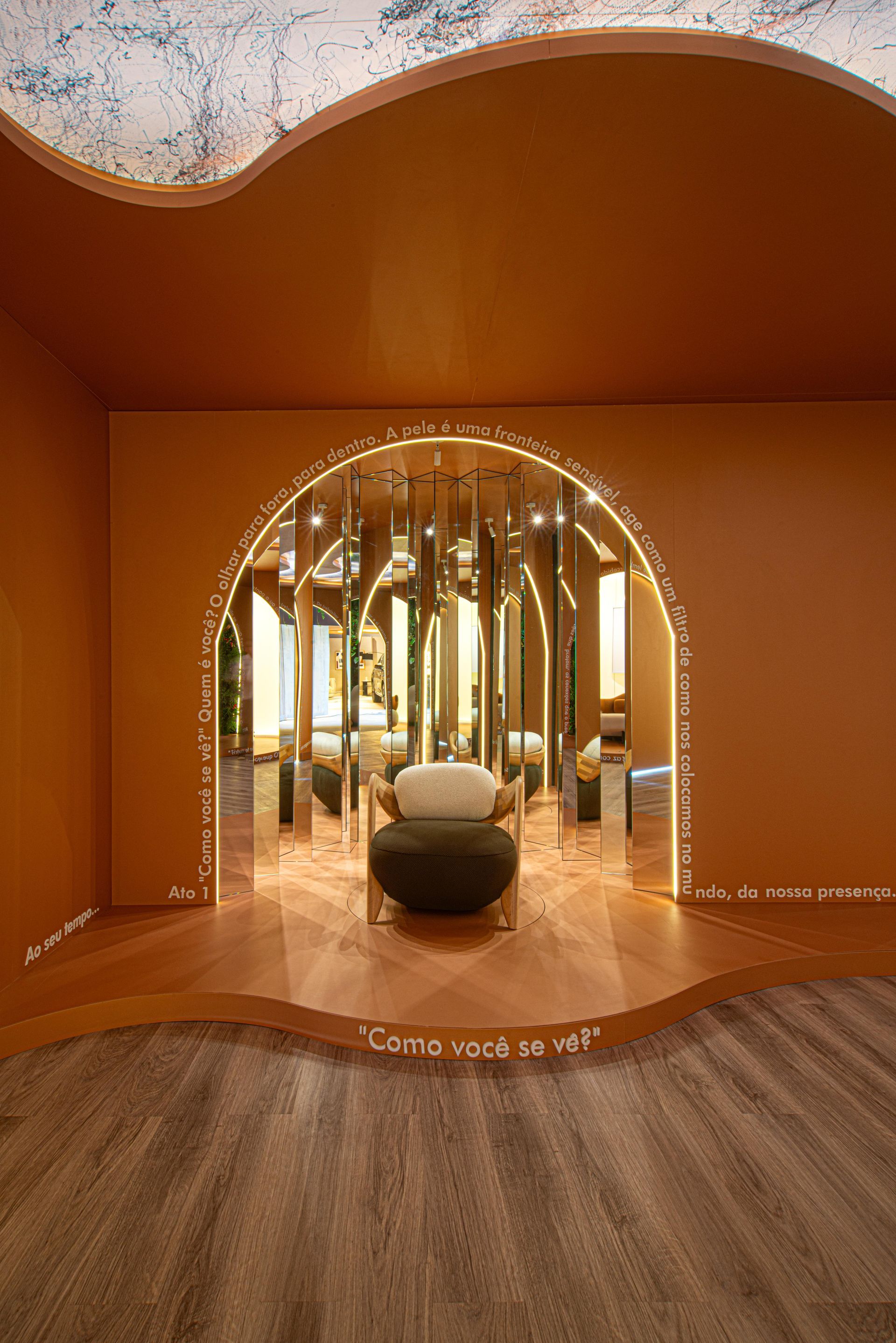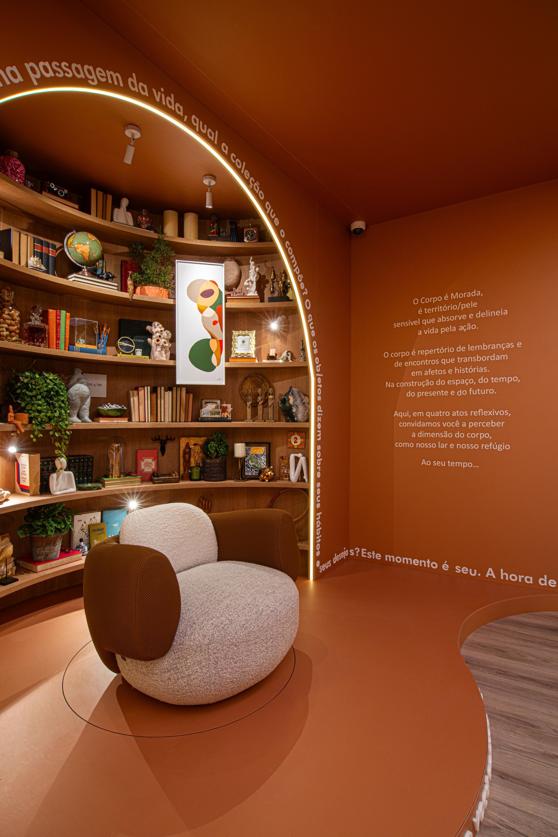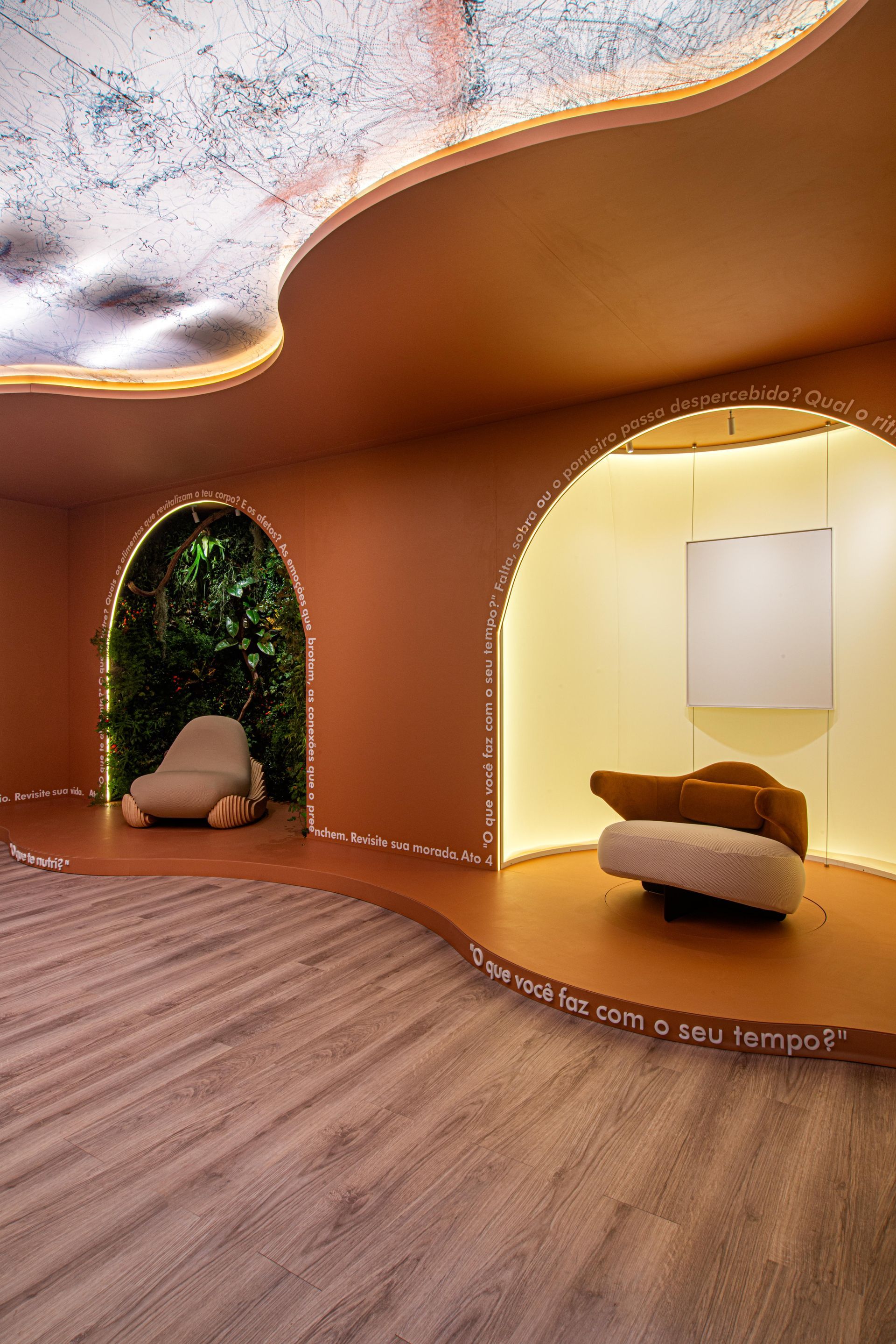 O Sinais do Tempo foi estrategicamente posicionado no hall de entrada como uma instalação artística. Neste espaço, composto por quatro mini-ambientes, a arquiteta Taiza Santos assume a responsabilidade de receber os visitantes e explorar o tema da mostra deste ano: Corpo & Morada. "Há uma dualidade intrigante entre o corpo ser nossa morada e, ao mesmo tempo, nossa morada ser onde residimos," explica a arquiteta. As poltronas orgânicas Kattu, Jaíba, Colo e Caipora, projetadas por Mauricio Bomfim, fazem parte dos quatro atos reflexivos que provocam questionamentos existenciais e incentivam os visitantes a reconectarem-se com seu eu interior.