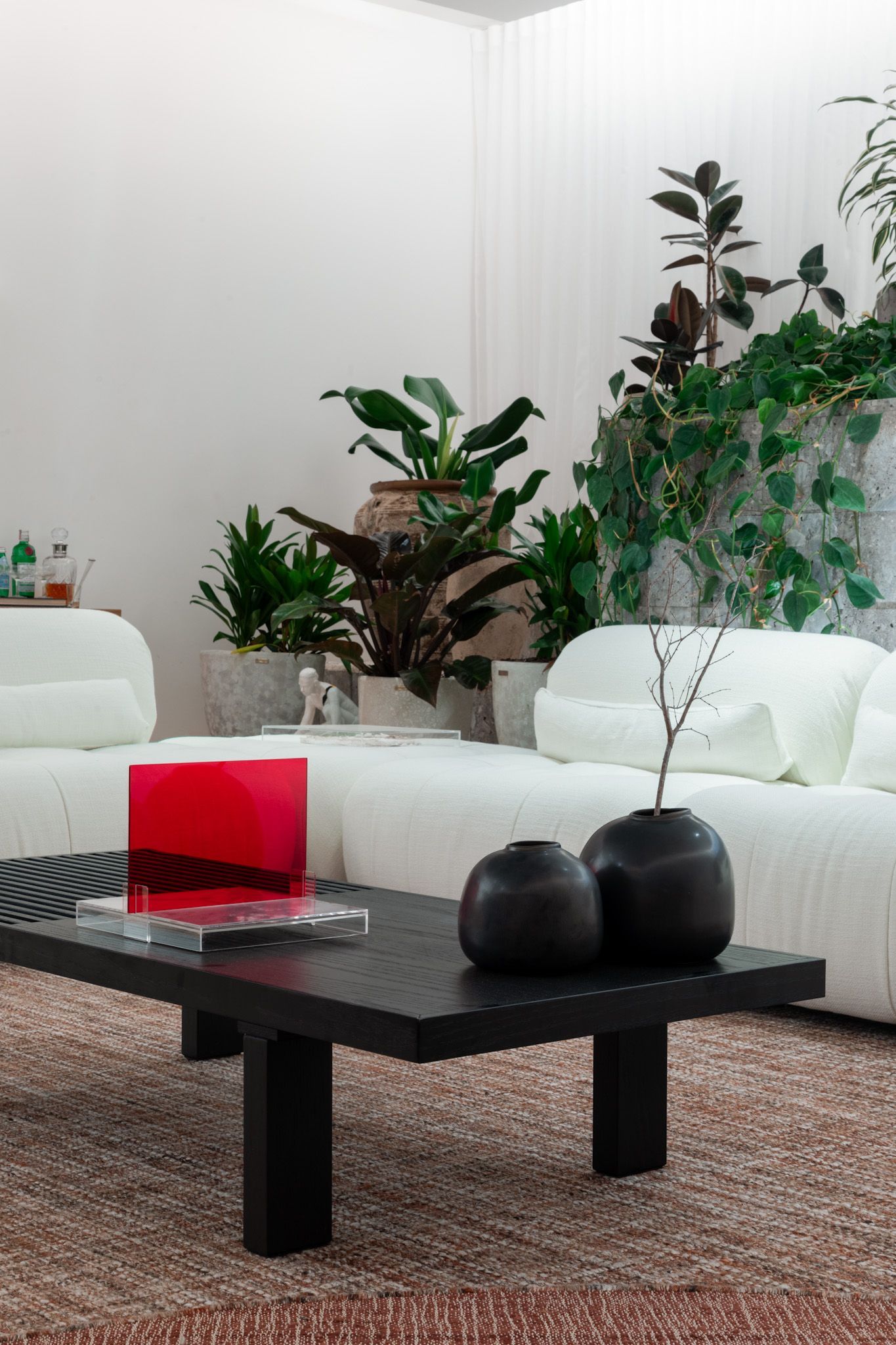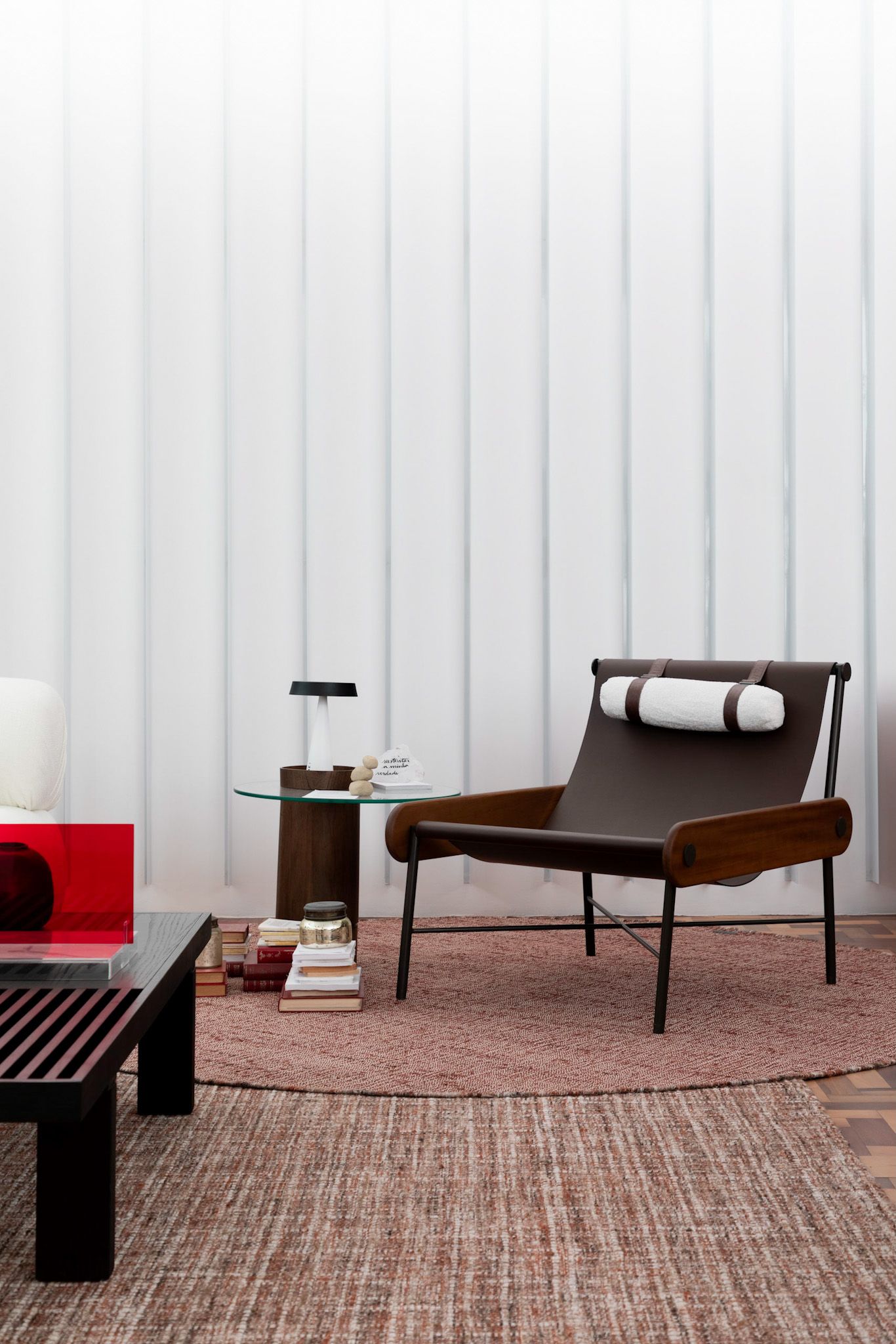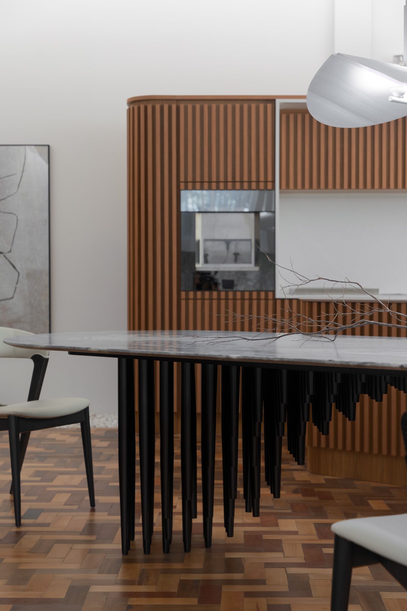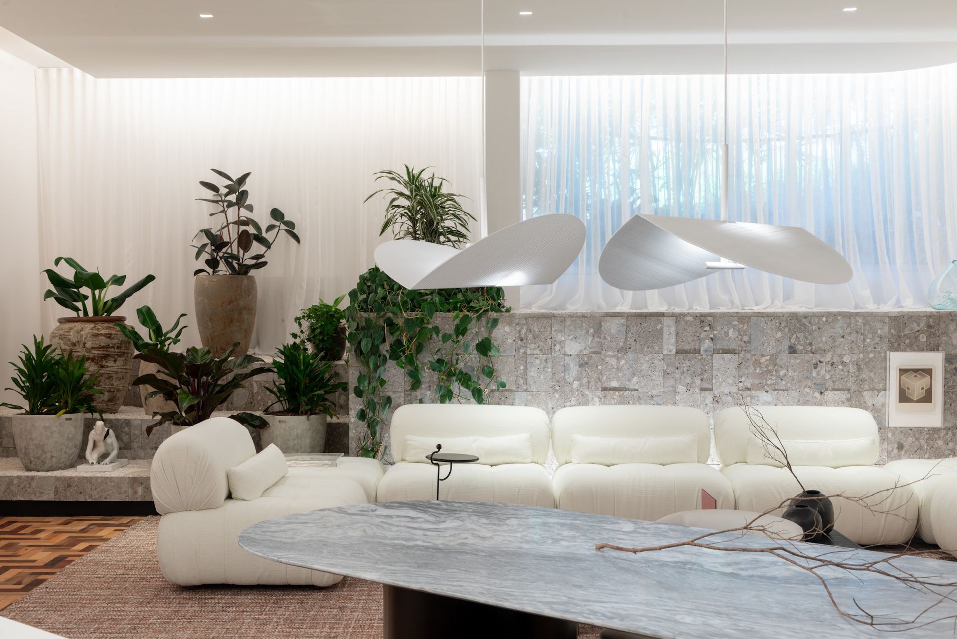 Que Seja Casa, elaborado pela arquiteta Bruna Sposito do Sum + Studio, é um ambiente de 94 m² dividido em cozinha, sala de jantar e sala de TV. Com tons neutros, mas contrastantes, o espaço harmoniza o sofá modular off-white Igarapé à mesa lateral órbita, de Lucas Azevedo, a poltrona Bella Dona desenhada por Giacomo Tomazzi, o conjunto de mesas de apoio Tauari e a poltrona Haus, de Bruno Faucz e a mesa Fases, assinada pela arquiteta e produzida pela madeira Nativa. A mescla de texturas é evidente no piso, composto por tacos de peroba e canela, reutilizados de uma obra anterior de Bruna. O resultado é um padrão "espinha de peixe" belíssimo e verdadeiramente especial.