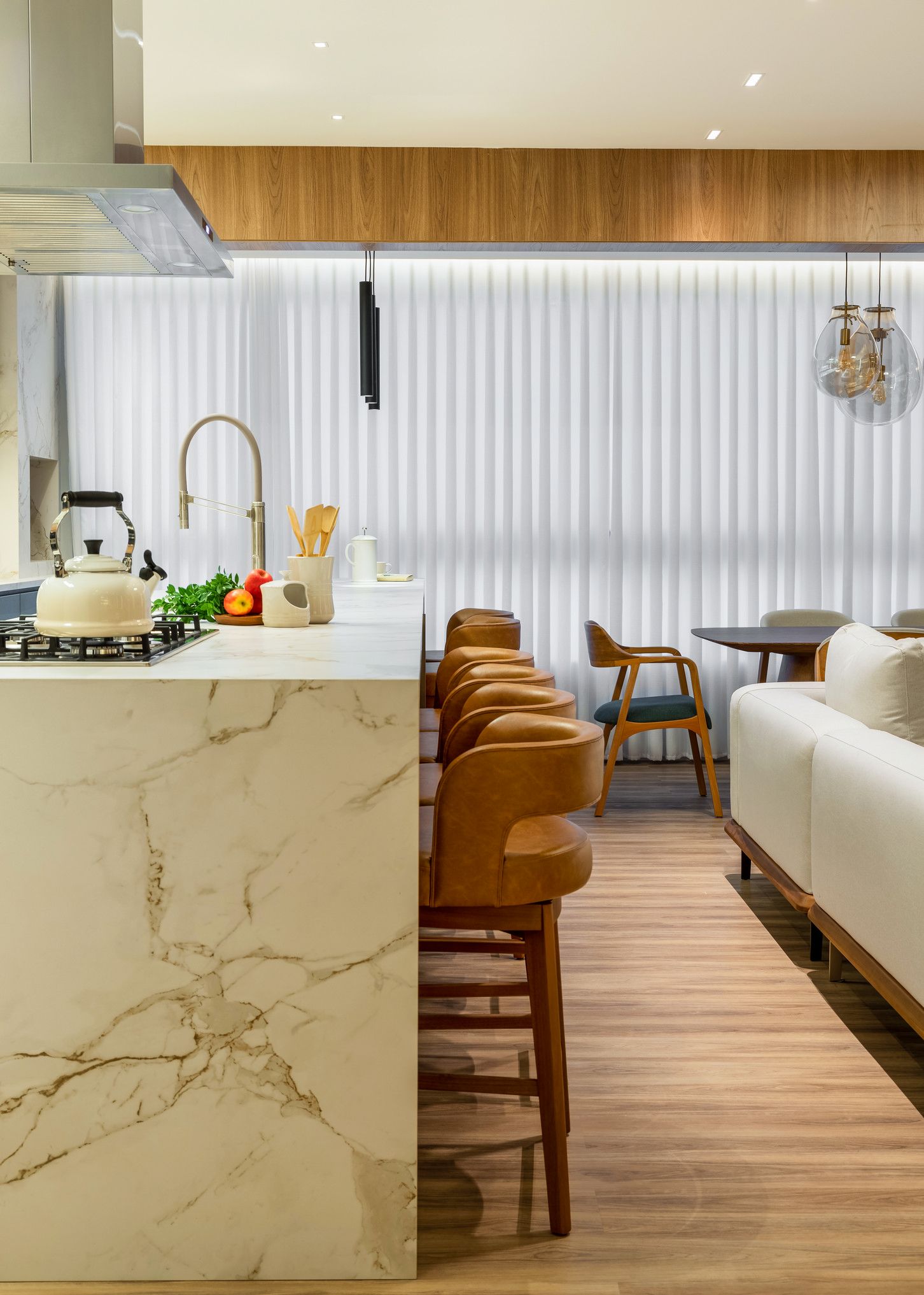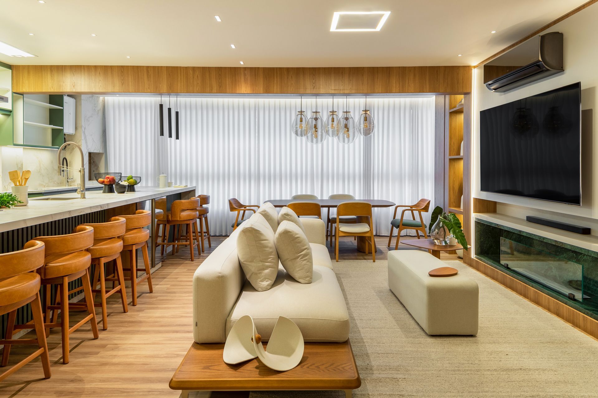 A integração total dos ambientes potencializa a convivência em um único eixo visual, adaptando-se aos diferentes usos do apartamento sem comprometer a organização. Para Franciele Fantini, o projeto reflete o desejo de criar uma casa que respeite o cotidiano da família e, ao mesmo tempo, revele plena identidade.