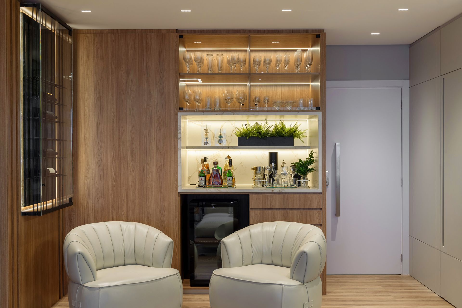 Cada escolha enfatiza a praticidade, sem abrir mão de uma estética atual. A presença generosa de luz natural permitiu incorporar a sacada ao espaço interno, ampliando a área social. A mudança da lavanderia para perto da entrada do apartamento liberou metragem na área central, conectando gourmet, jantar, living e adega em sequência visual harmônica — um detalhe que redefiniu o uso dos ambientes no cotidiano.
