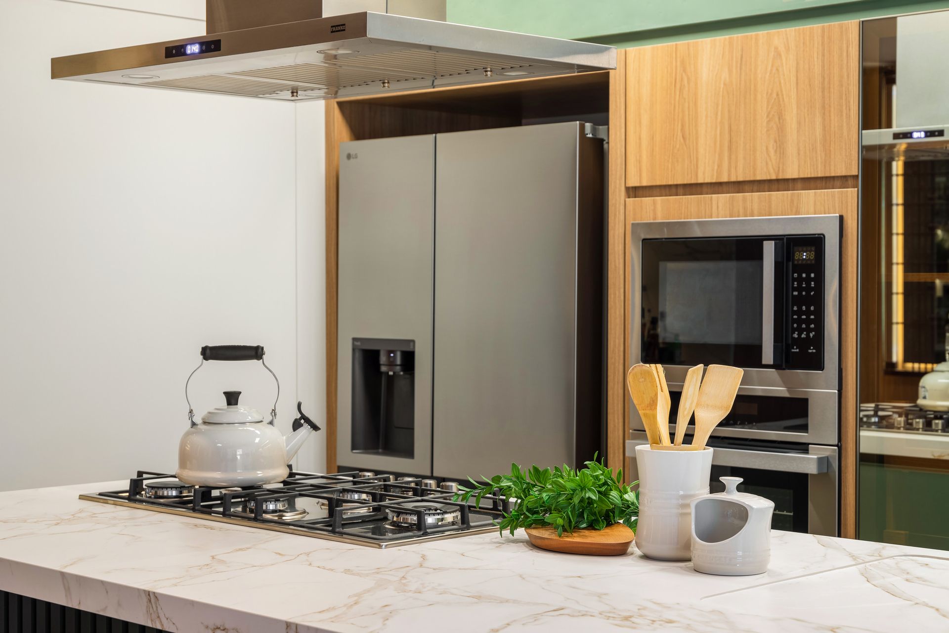 A seleção de acabamentos mescla texturas e tons para criar identidade própria: o MDF aparece em diferentes nuances de madeira e em um sofisticado verde, enquanto as bancadas ganham Dekton Entzo, conhecido pela resistência. Pontos de granito Verde Guatemala garantem destaque e autenticidade. Elementos como serralheria metálica e vidro dão leveza às divisões e o piso vinílico proporciona praticidade, integrando todos os ambientes em uma base coerente.
