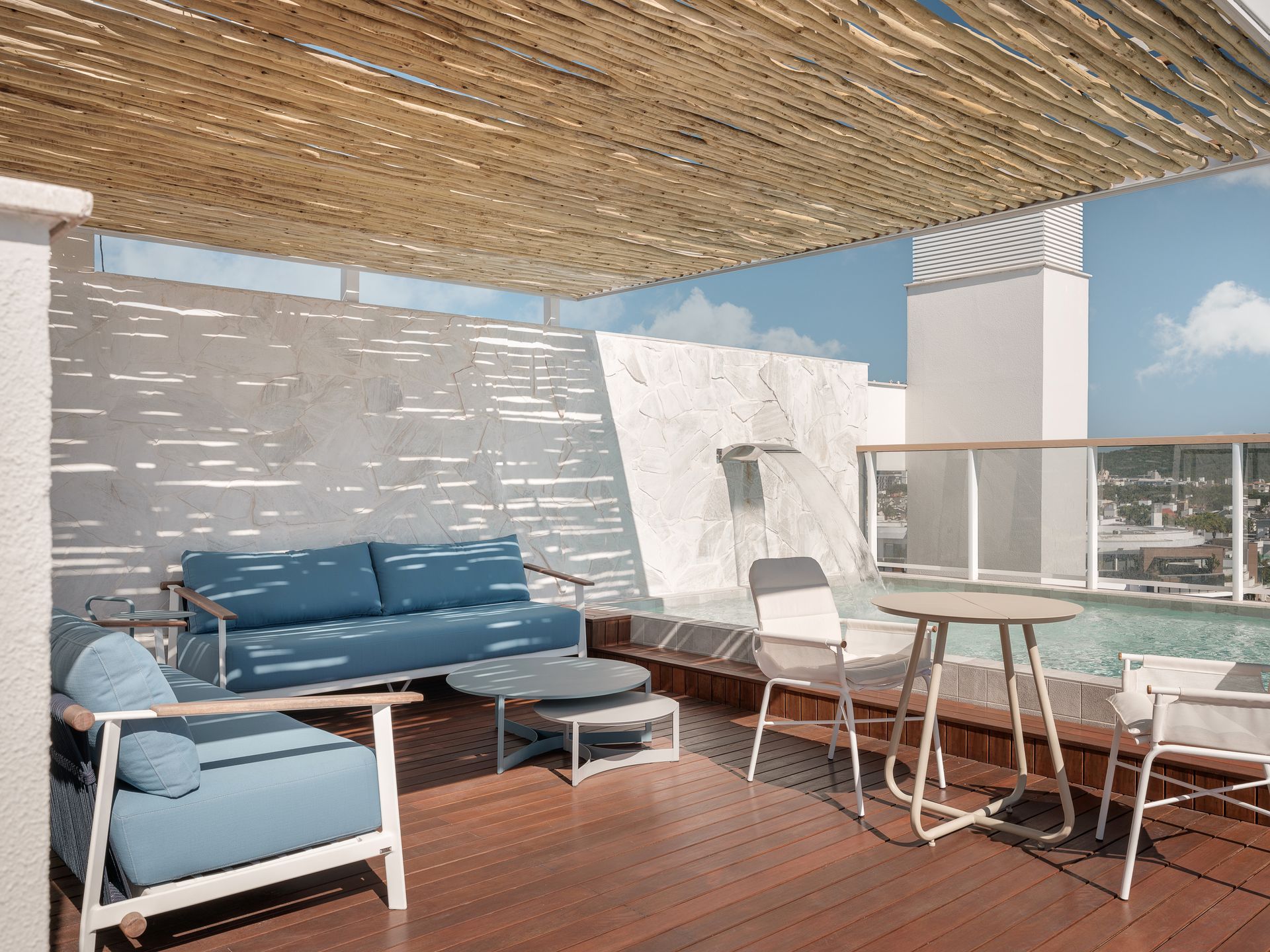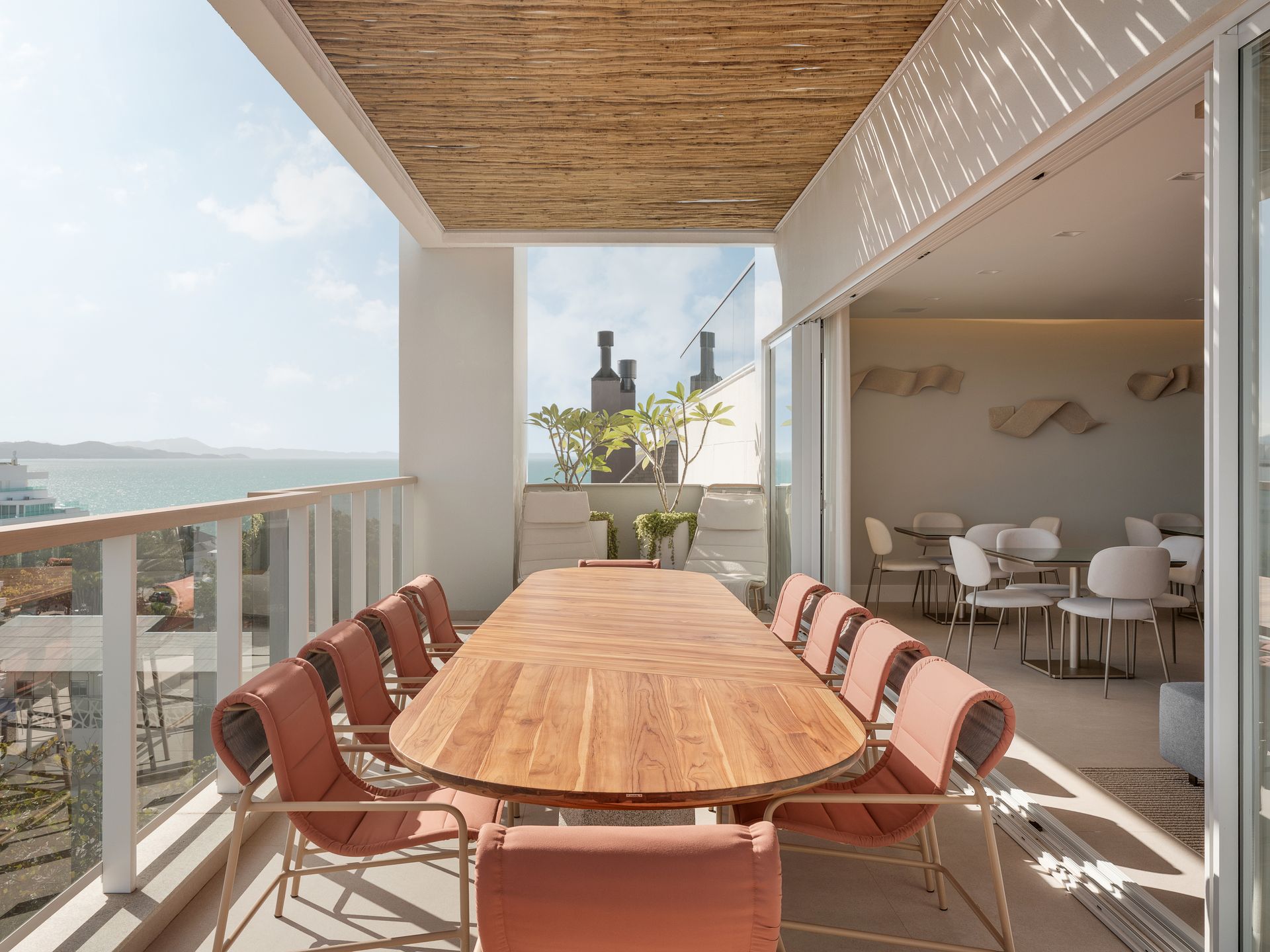 Enquanto lá fora o mar calmo proporciona a brisa perfeita para os moradores, cada ambiente do condomínio inspira-se nesta força da natureza.