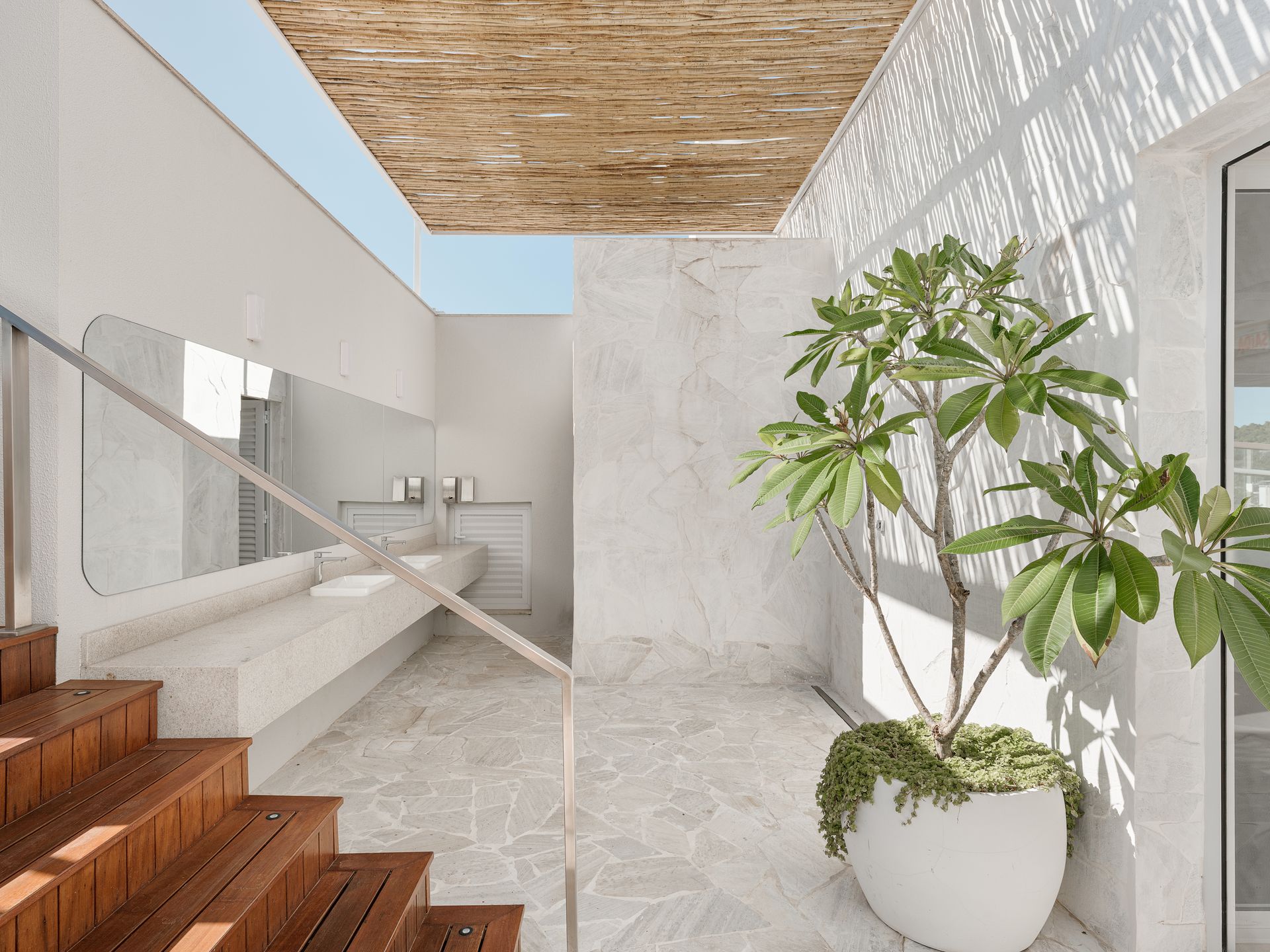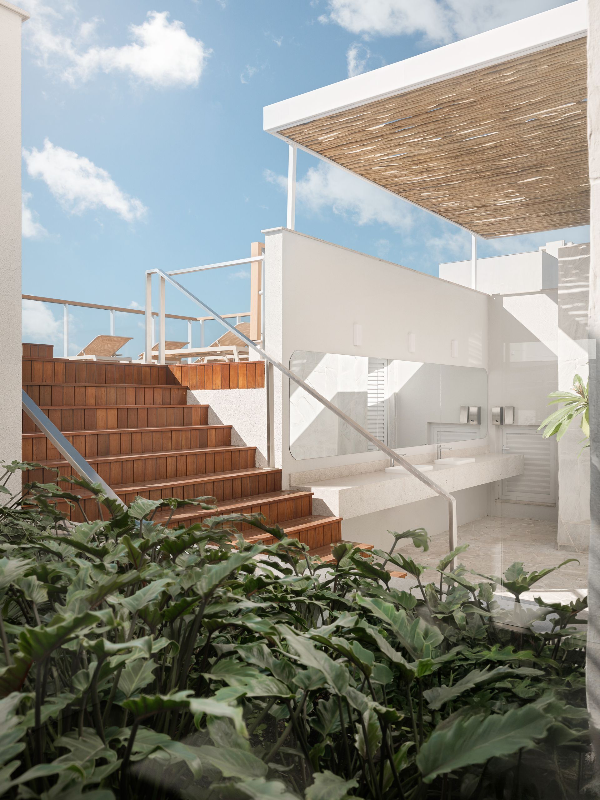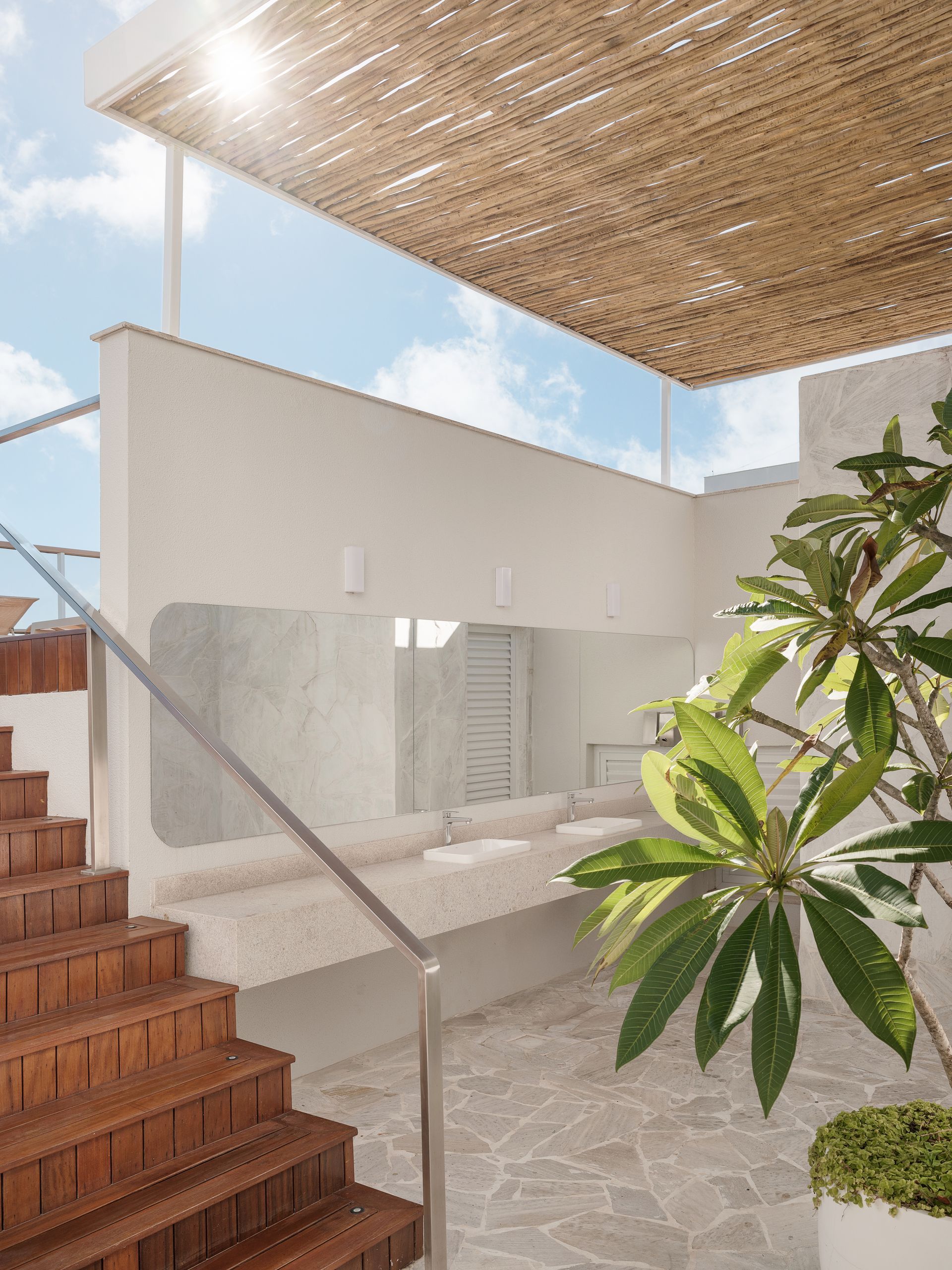 Na disposição, a setorização norteou o desenho. A chegada reserva um lavatório em pedra, biribas e vegetação tropical ao visitante. Uma escada distribui os fluxos: à direita aparecem as espreguiçadeiras; à esquerda, a piscina de raia se estende até uma área de prainha, esta última acompanhada de um amplo estar com móveis pautados nos tons do mar.