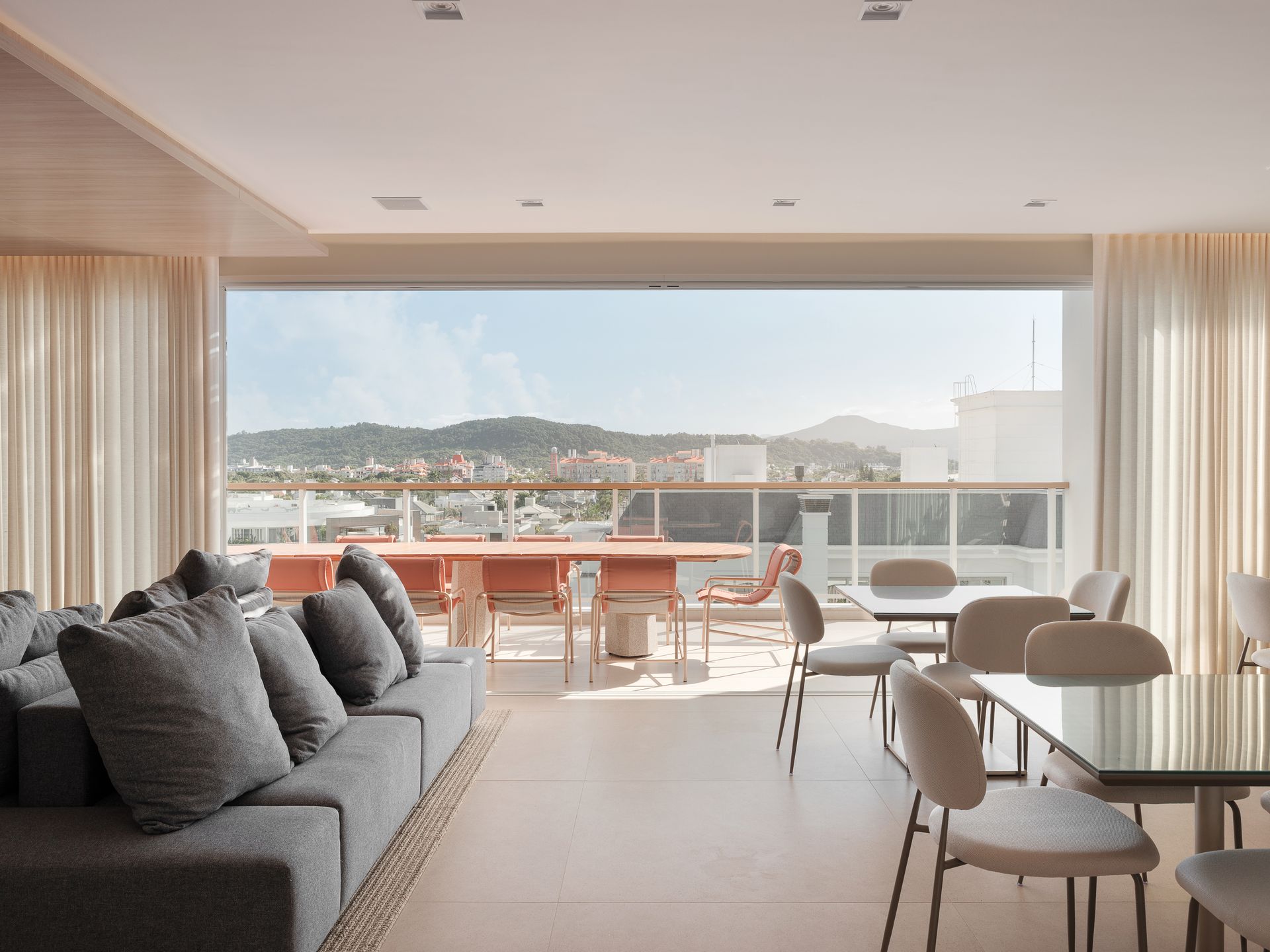 A proposta é criar uma conexão entre o ambiente natural e uma atmosfera praiana valorizada em destinos internacionais, trazendo para o Bellini um espaço de encontro integrado com a paisagem. “O conceito nasceu da própria paisagem de Jurerê”, explica Bohrz. “Buscamos tons claros, almofadados e volumes generosos, atentos à ideia de criar grandes mesas no espaço do salão de festas externo, para que moradores e convidados possam aproveitar a companhia e a vista de maneira descomplicada.”