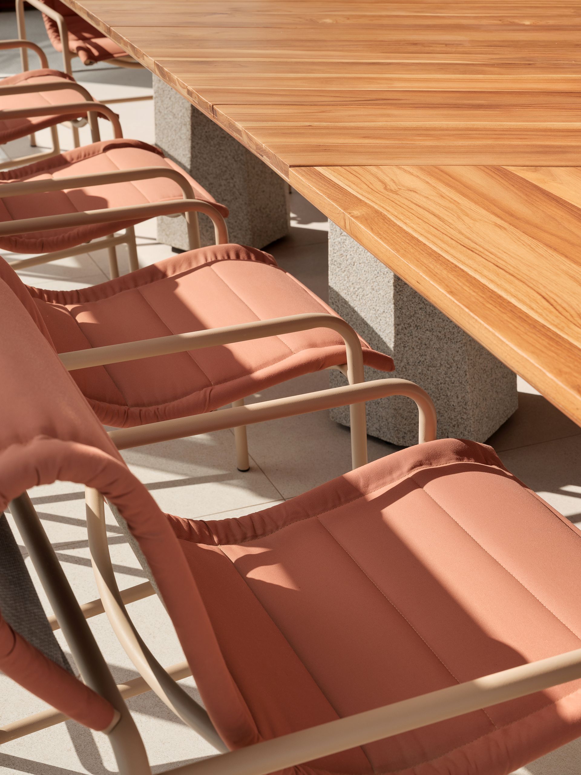 Materiais de fácil manutenção e longa durabilidade foram priorizados: tecidos tecnológicos para áreas externas, alumínio nas bases e madeiras maciças, escolhidas para aumentar a sensação tátil do espaço. “É fundamental trabalhar com fornecedores e equipes de confiança. Só assim conseguimos garantir um resultado de qualidade e tranquilidade para quem vai viver o projeto”, comenta o arquiteto.