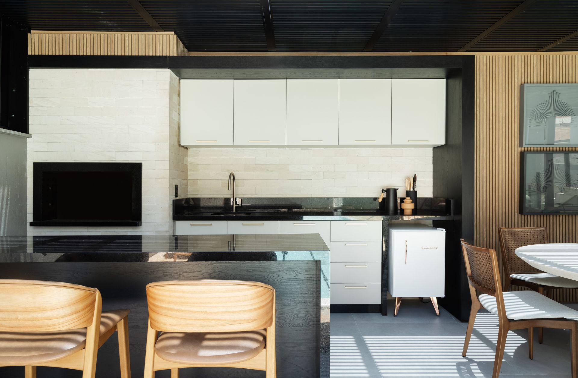 O espaço gourmet, uma extensão ao ar livre da casa, oferece um cenário perfeito para momentos de lazer e entretenimento. Equipado com churrasqueira e mobiliário de design, como o trio de banquetas Lia, criação de Ibanez Razzera, este ambiente é a prova da habilidade de Gabriela em criar espaços que celebram tanto a funcionalidade quanto a estética, incluindo a presença inspiradora de obras de arte, como a obra Cocares, do artista plástico João Betti, e o quadro da coleção Mono Giraud, da artista portenha Mono, consagrada mundialmente.