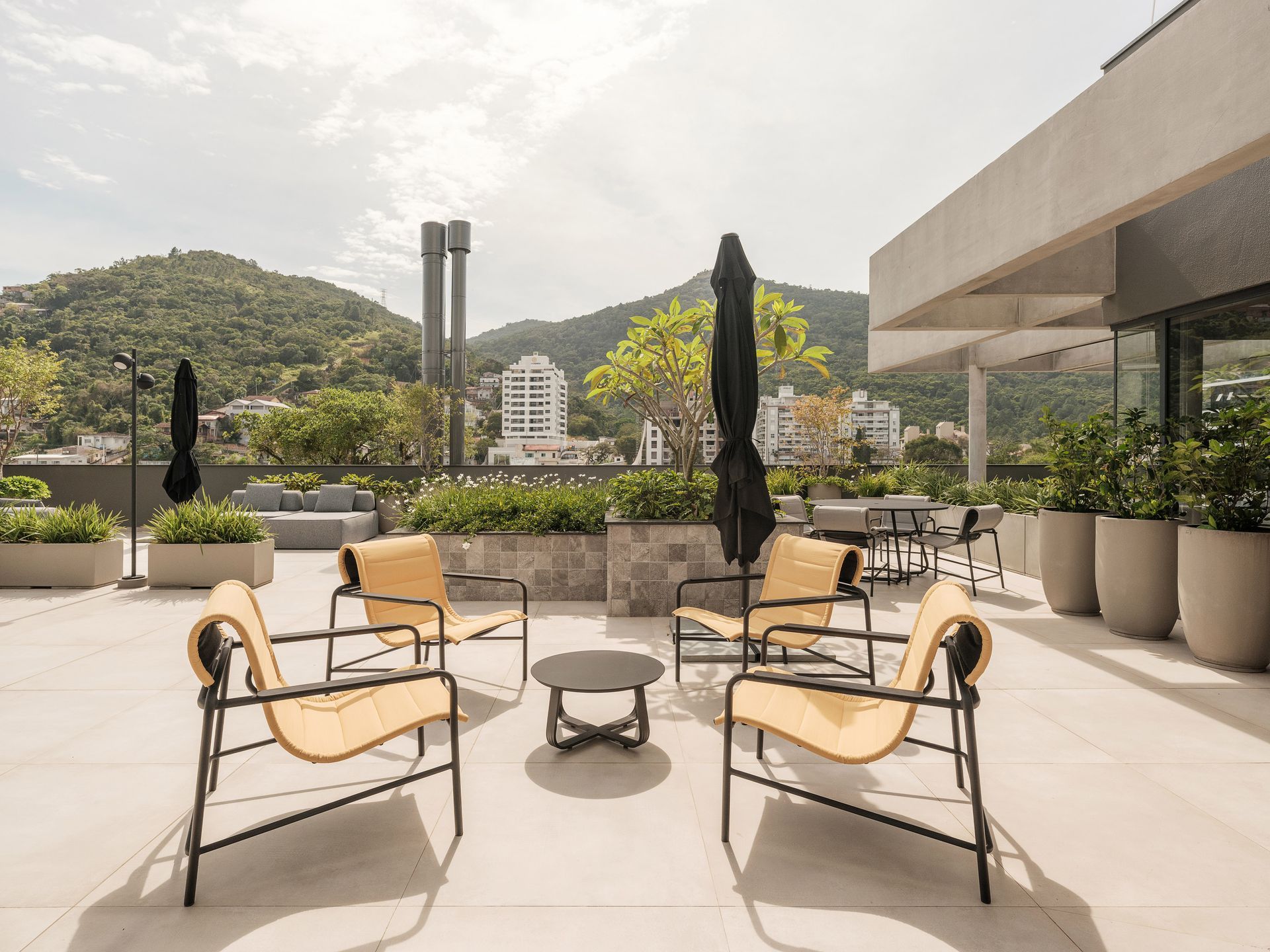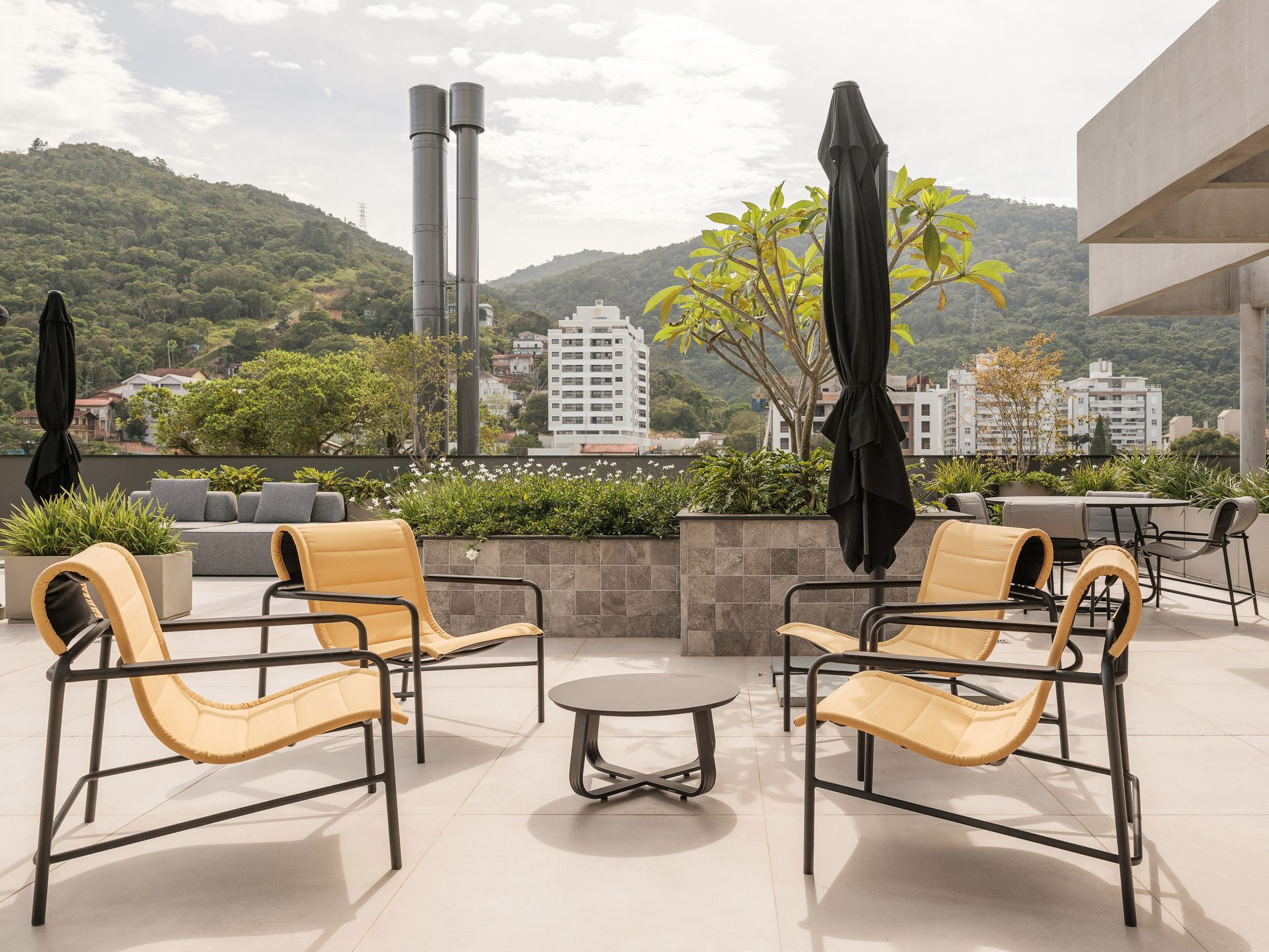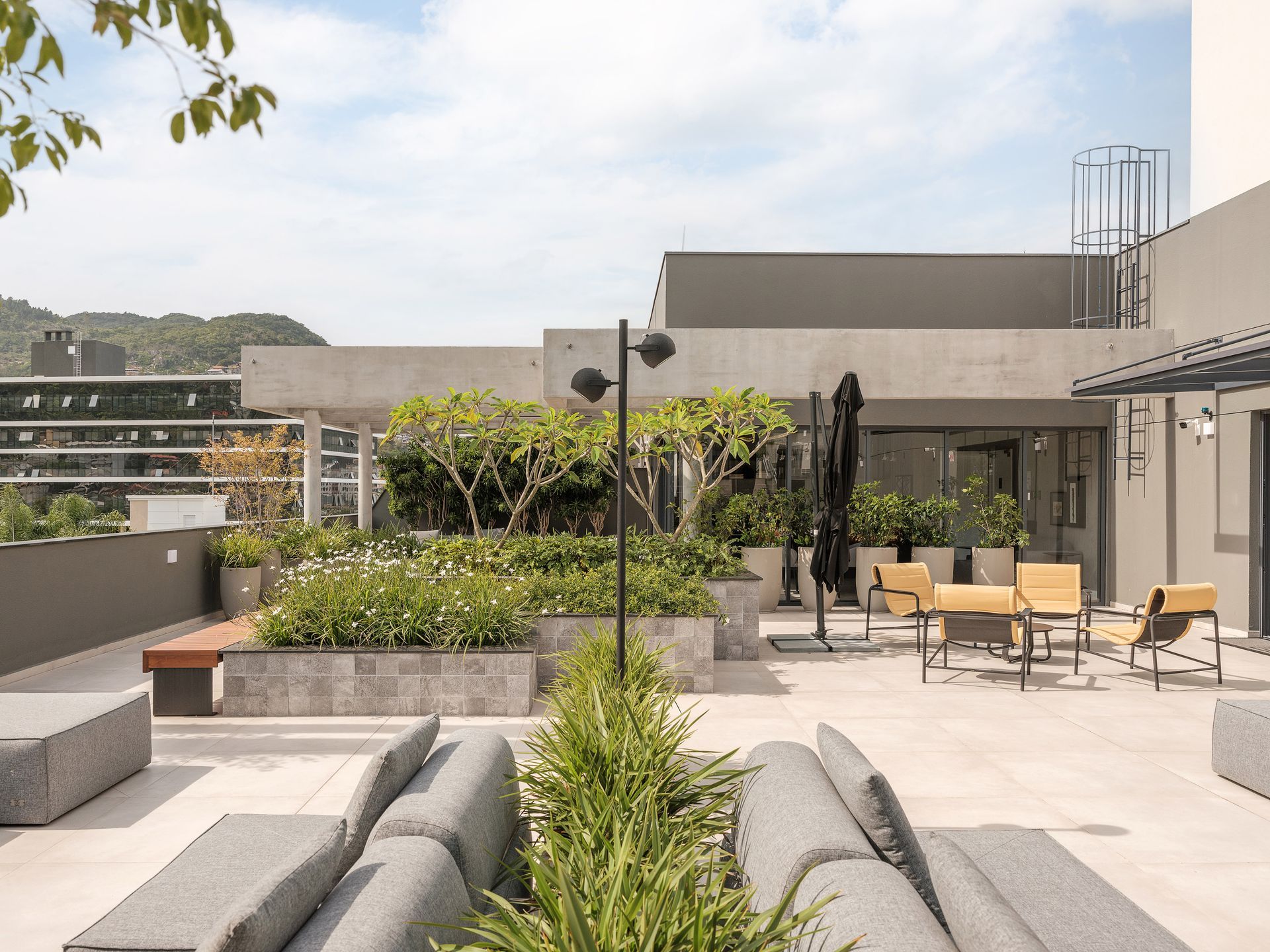 Parte do mobiliário solto das áreas comuns é do acervo da ContTi Home Design, reforçando unidade estética e coerência material. No Ático, o ambiente é composto pela Poltrona Coral, pela Mesa Aura e pelo Sofá Rio. Na Área Gourmet, aparecem o Sofá Carmel, a Poltrona Breeze, de Maurício Bomfim, a Mesa de Jantar Asti, as Cadeiras Luci e as Mesas Uni. No Sky Bar, localizado na cobertura, foram especificados a Cadeira Chanel, a Mesa Uni e o Sofá Casual.