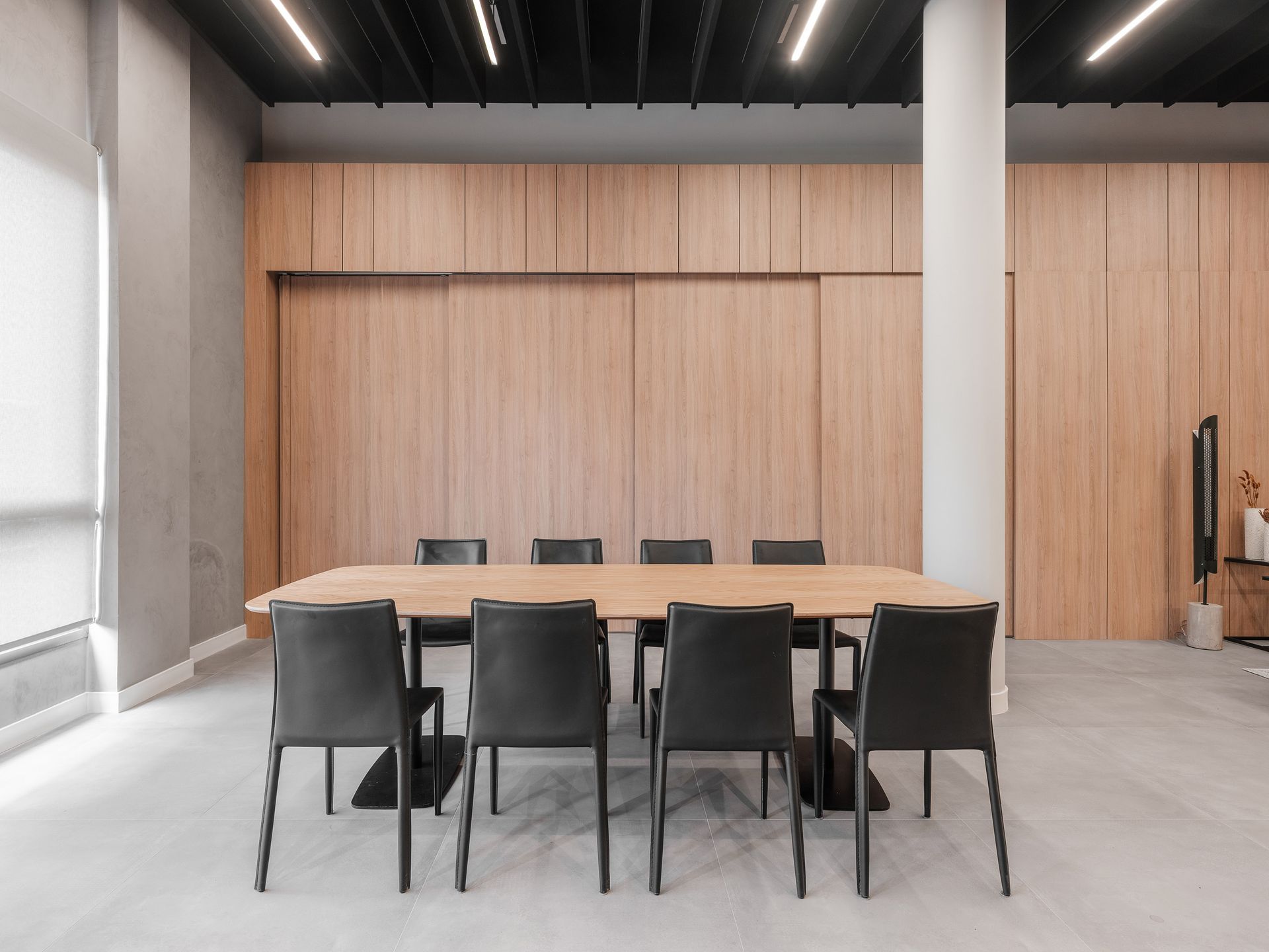 No térreo, o hall de entrada se destaca pelo pé-direito generoso e pela presença de uma divisória composta por sucessivas camadas de telas metálicas. O elemento organiza os diferentes usos do pavimento sem compartimentar excessivamente, permitindo que os ambientes se relacionem visualmente. A escolha dos materiais e da paleta cromática revela o conceito que orientou todo o projeto: o First foi pensado desde a origem como um produto imobiliário de perfil tecnológico. Preto, cinza, amarelo e metal aparecem de forma consistente, definindo identidade e ritmo aos espaços.