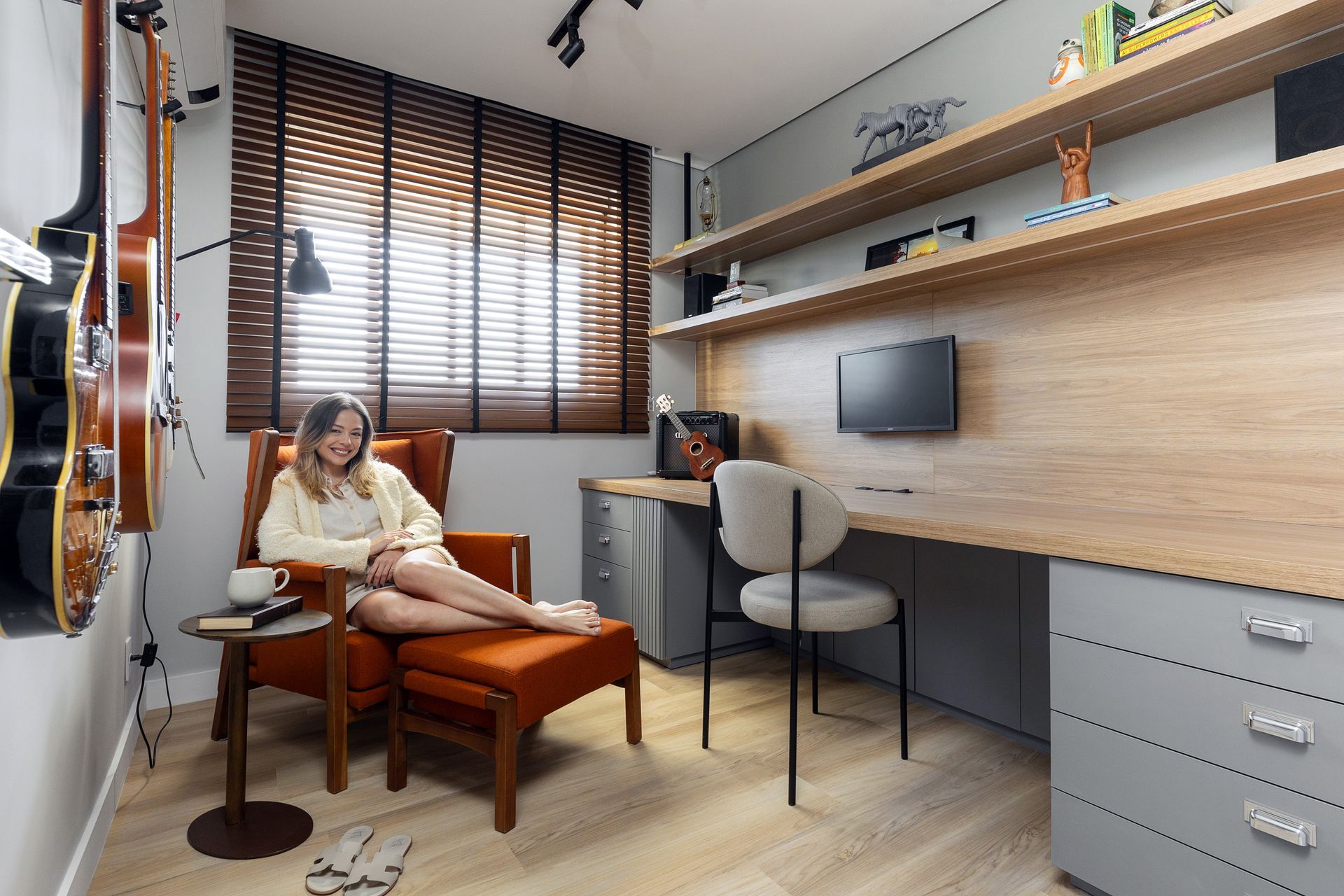 Na escolha dos materiais e acabamentos, a madeira desempenhou um papel central, trazendo calor e aconchego aos espaços. A paleta de tons neutros, presente em toda a área social, reforça essa sensação acolhedora, enquanto os detalhes em serralheria preta adicionam um toque contemporâneo e ousado, refletindo a personalidade dos proprietários. Já o home office/sala de música adota tons mais escuros e marcantes, criando um ambiente intimista e inspirador.