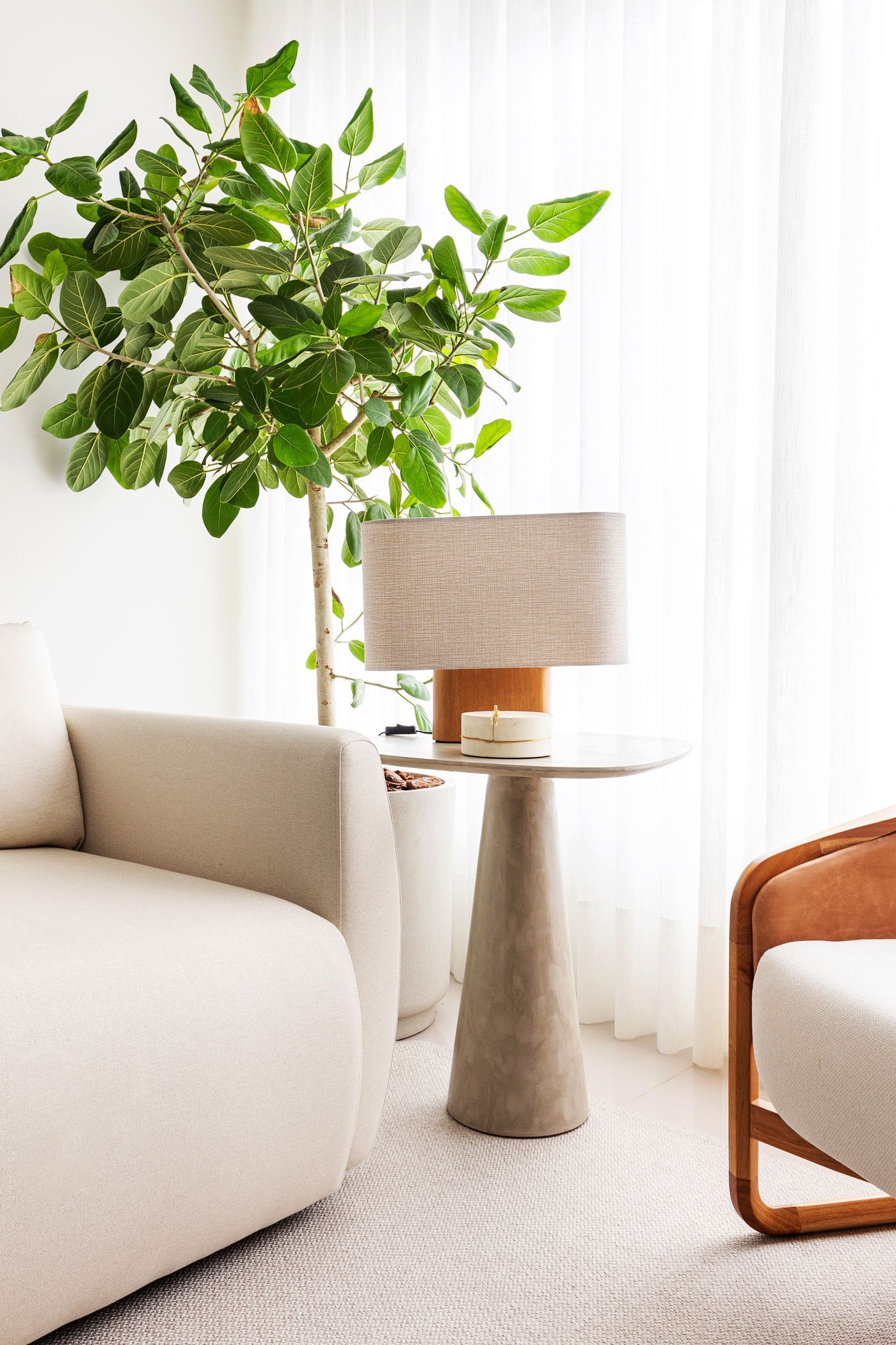 O apartamento possui duas suítes, um lavabo, área de serviço e cozinha, além de um belo living integrado, que abriga dois ambientes: a sala de estar e a de jantar. É nesse espaço que estão os móveis selecionados na Contti Home Design.