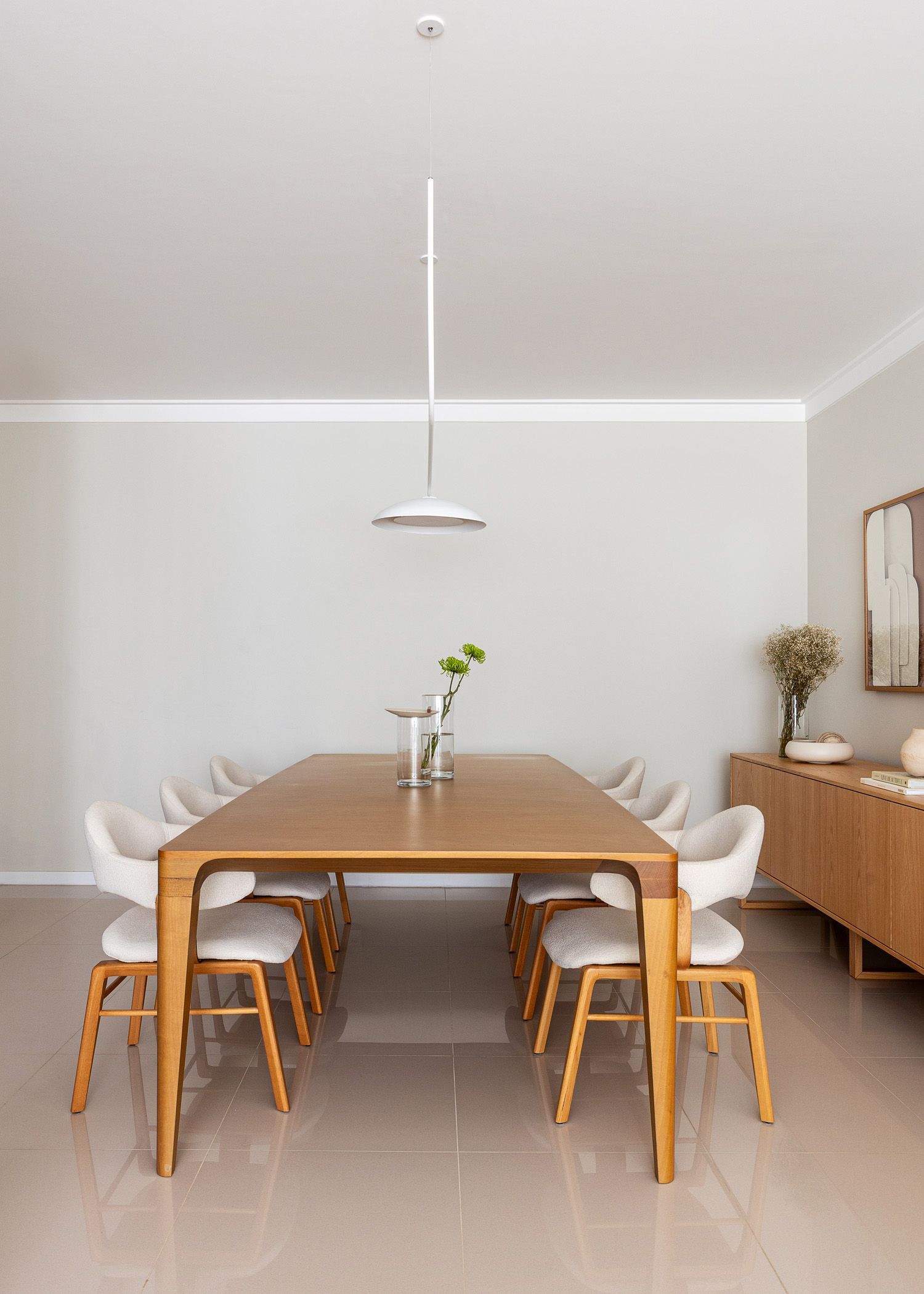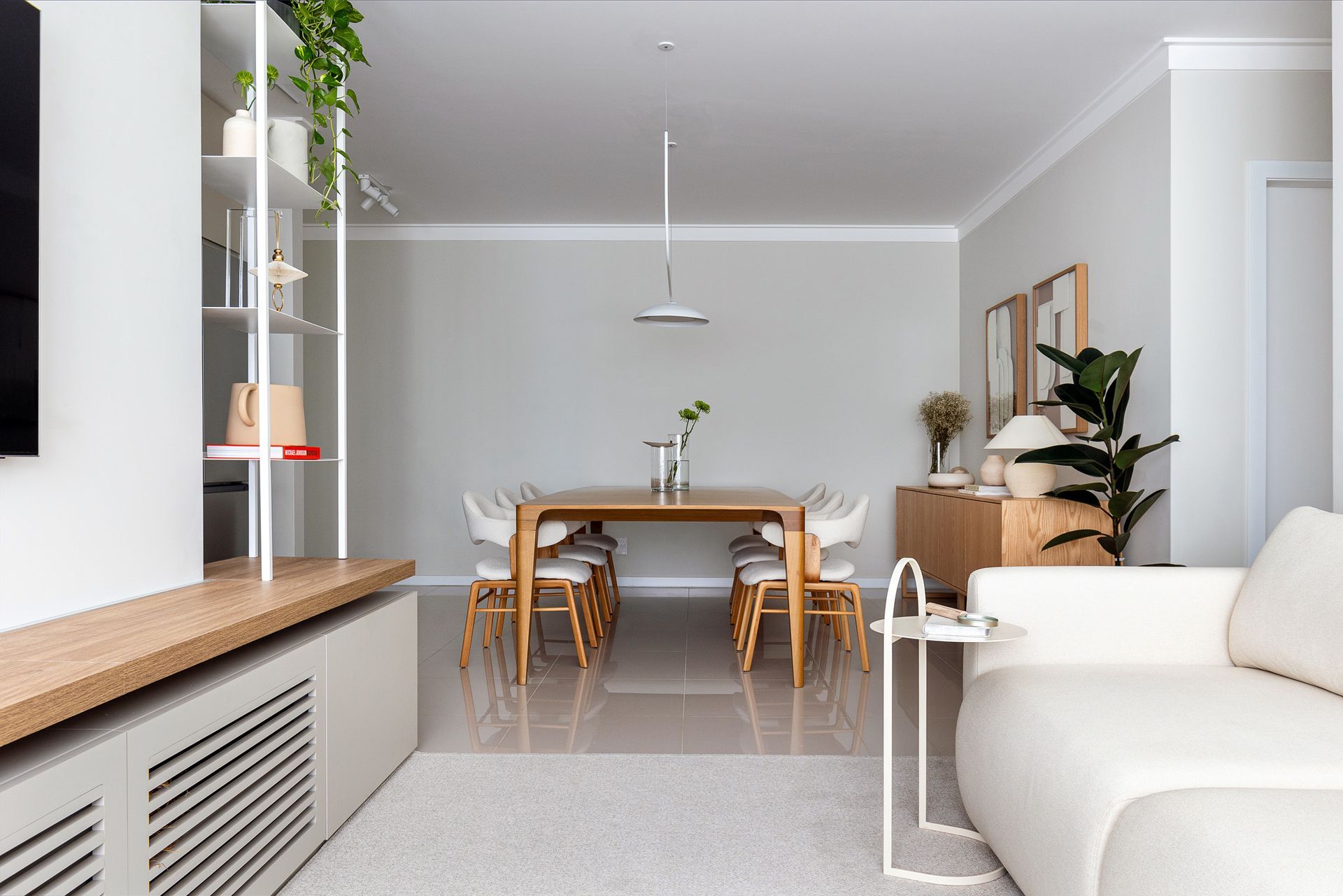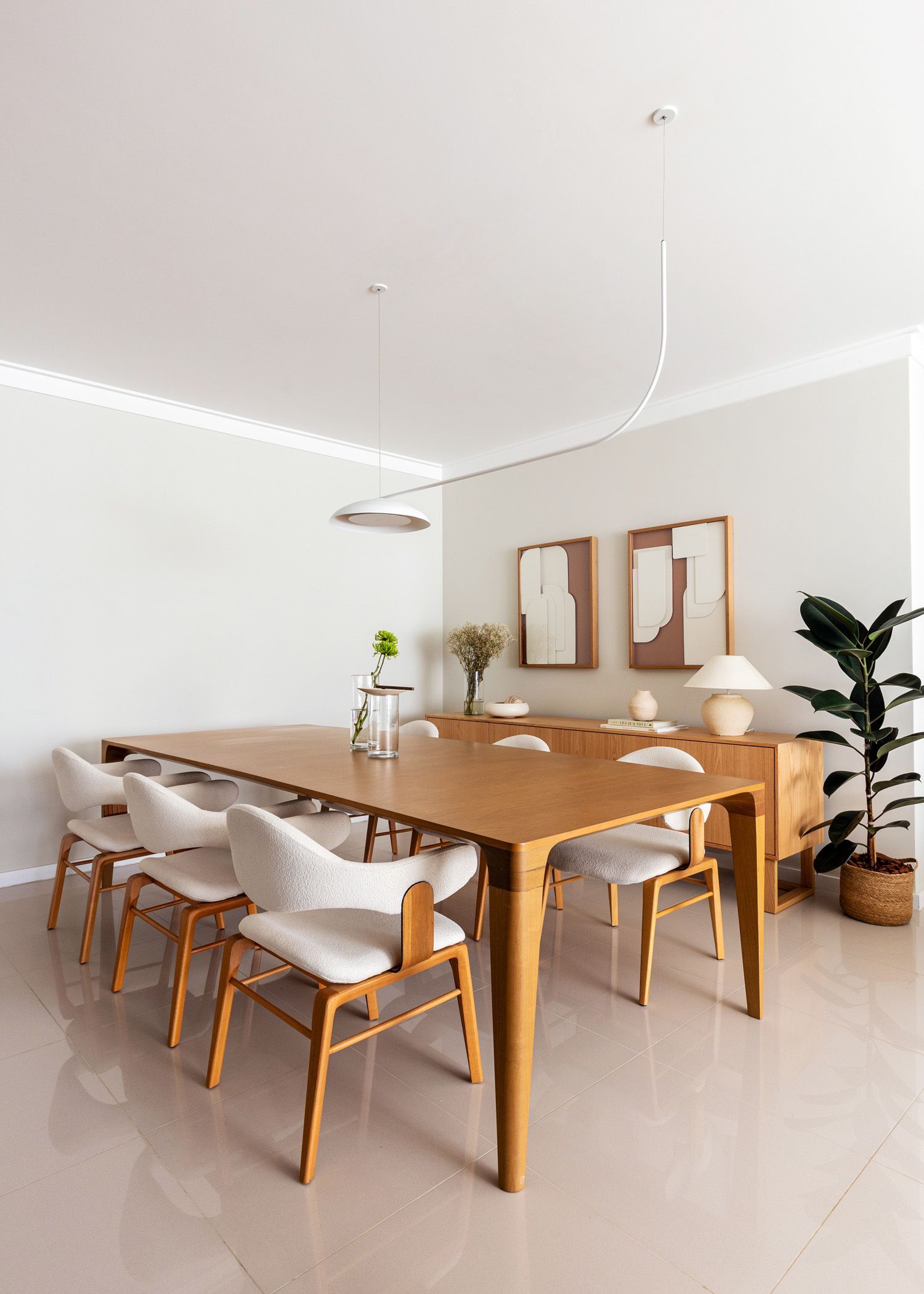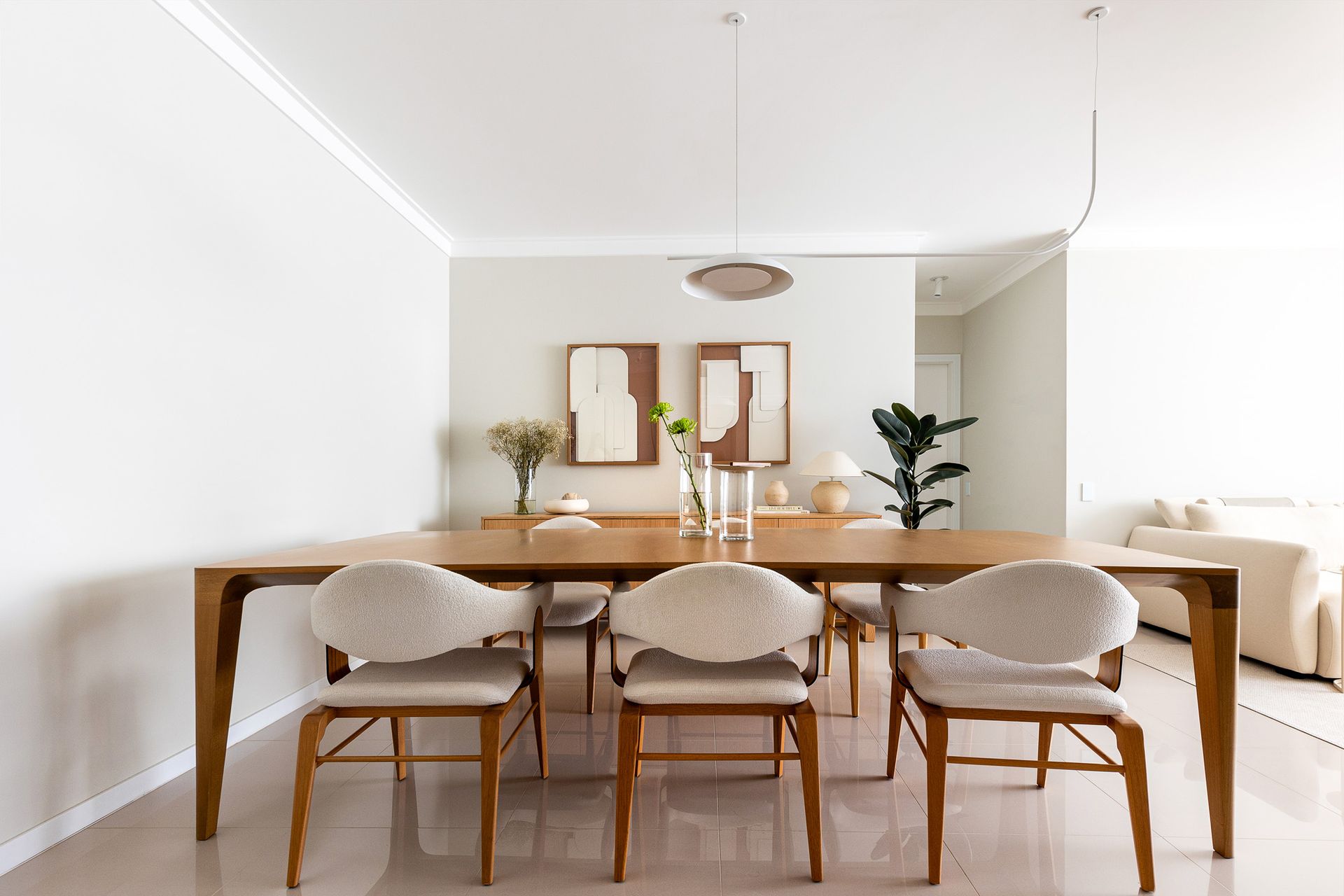A arquiteta Maria Eduarda Brandão assinou a transformação completa de um apartamento de 90 m², seguindo as diretrizes minimalistas de um cliente que buscava investir em móveis soltos com design diferenciado. O proprietário, um empresário solteiro com um filho adolescente, desejava um espaço leve, luminoso e ideal para receber amigos, especialmente para jantares.