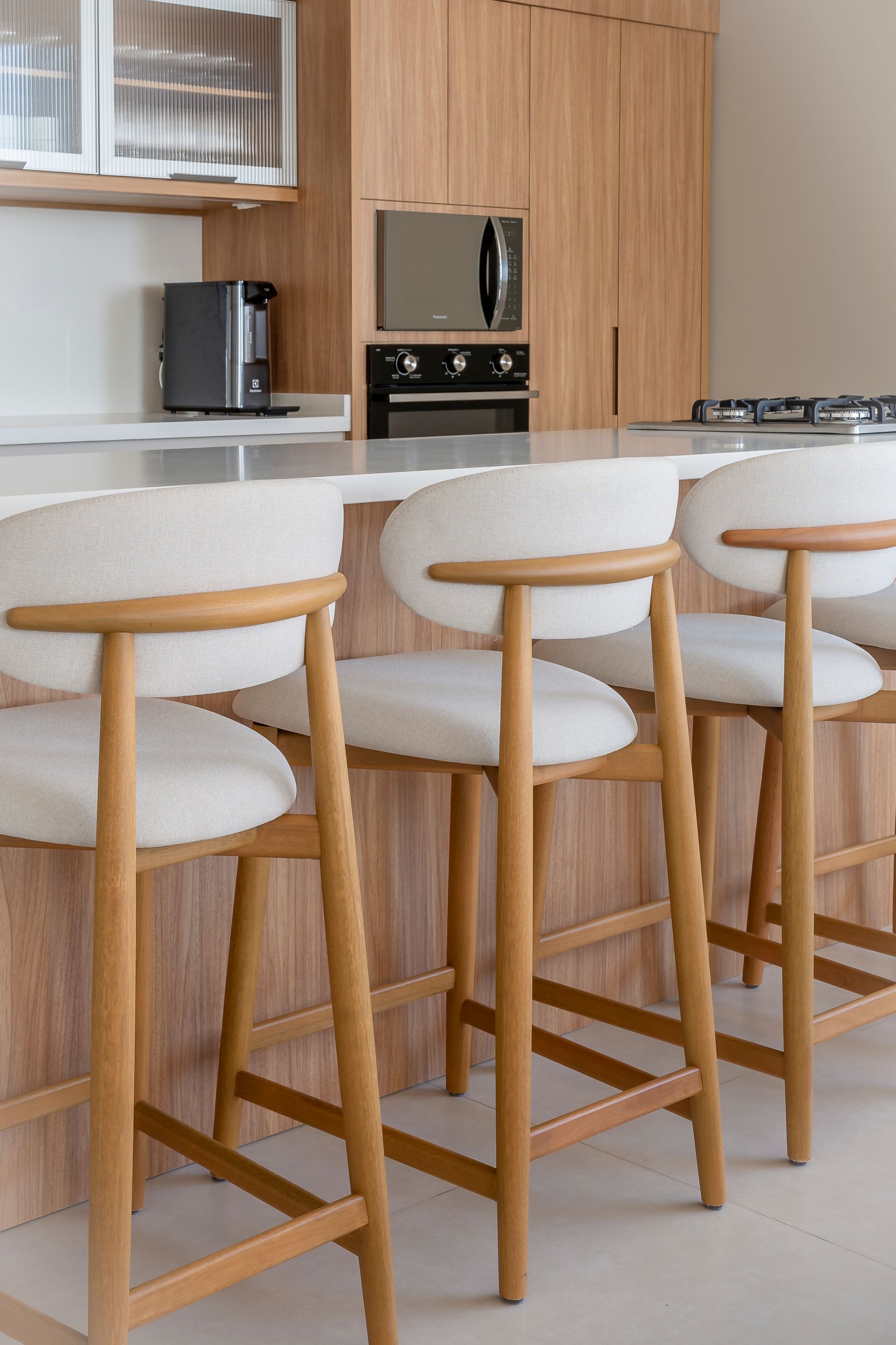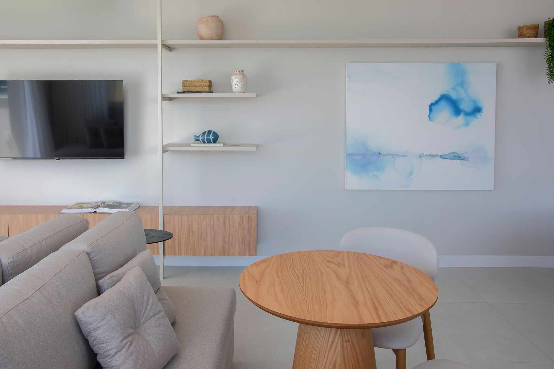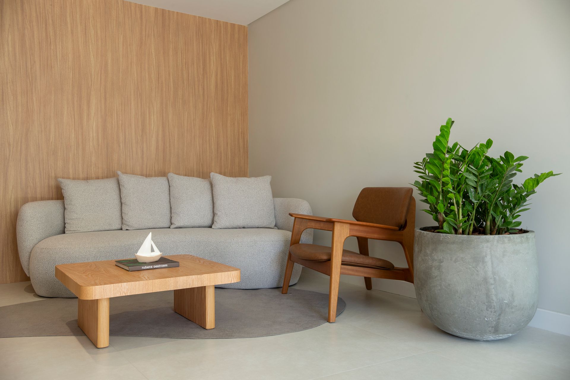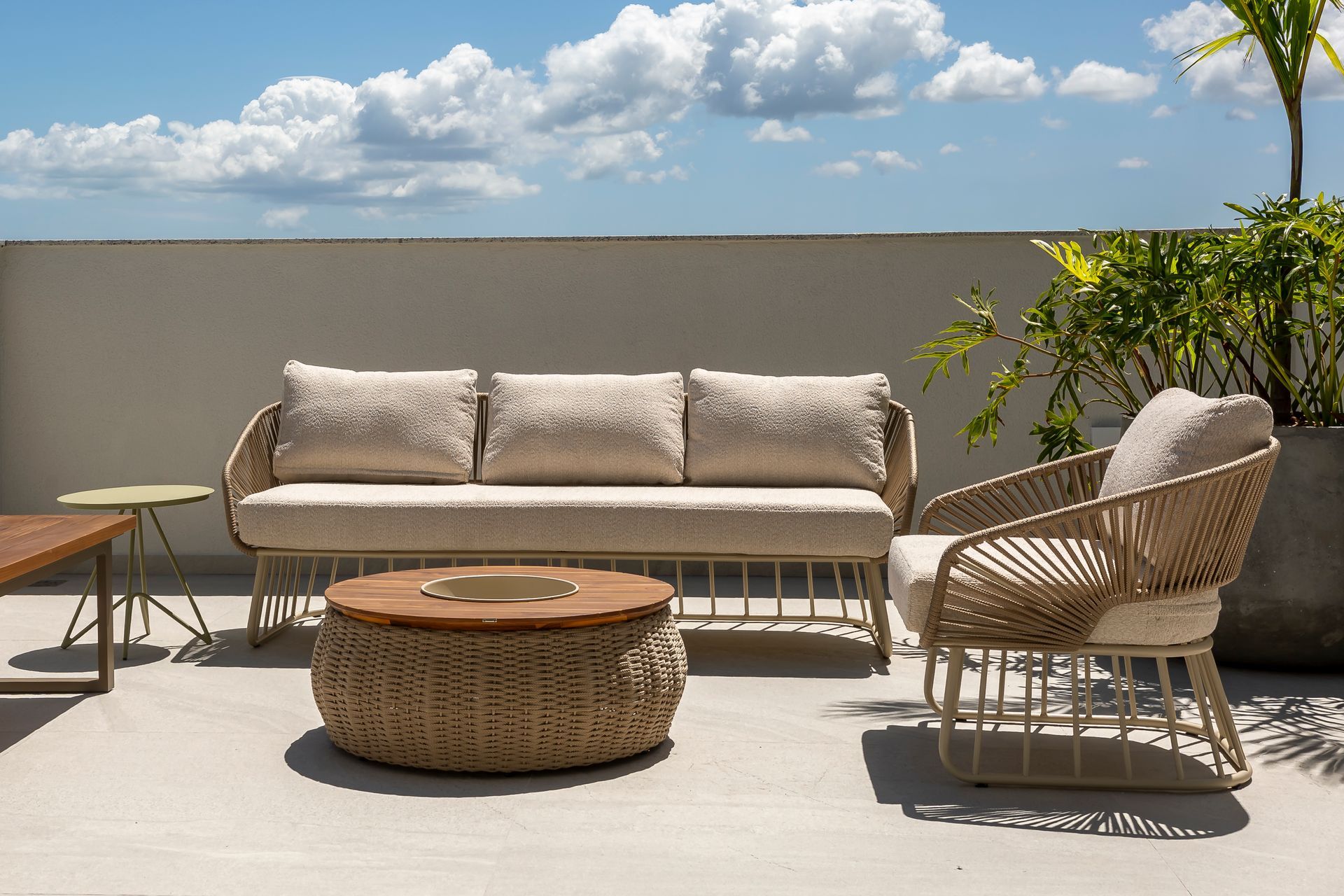 A materialidade segue um vocabulário contido e coerente com o entorno. Madeira natural em tonalidades claras aparece como elemento protagonista, combinada a tecidos pensados para uso externo que equilibram resistência e conforto ao toque. A paleta cromática atua com discrição - areias, cremes e azuis suaves - reforçando a ideia de continuidade entre o interior dos apartamentos e as áreas comuns. Além da aparência, a seleção dos revestimentos do mobiliário levou em conta a exposição às intempéries e a facilidade na manutenção.