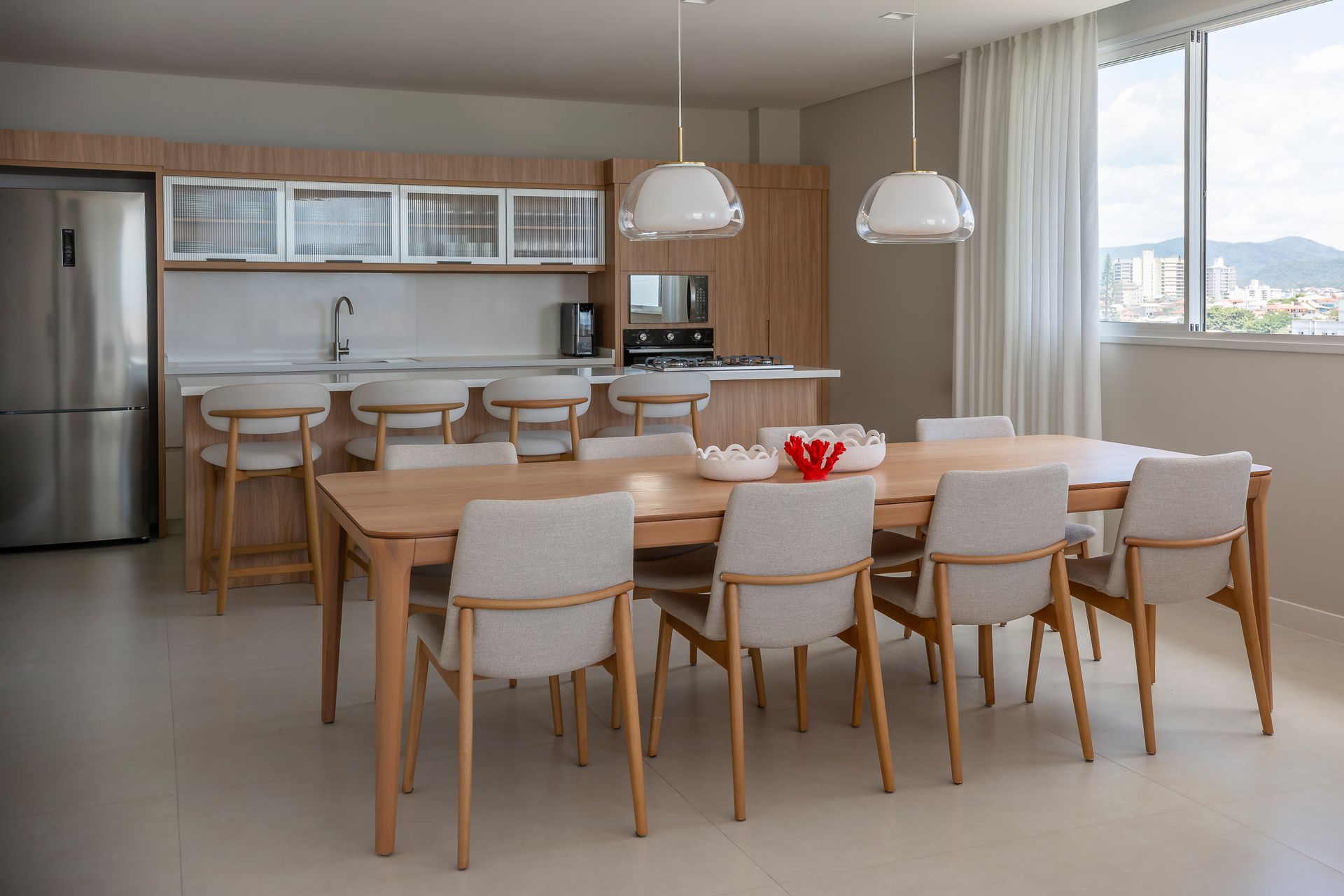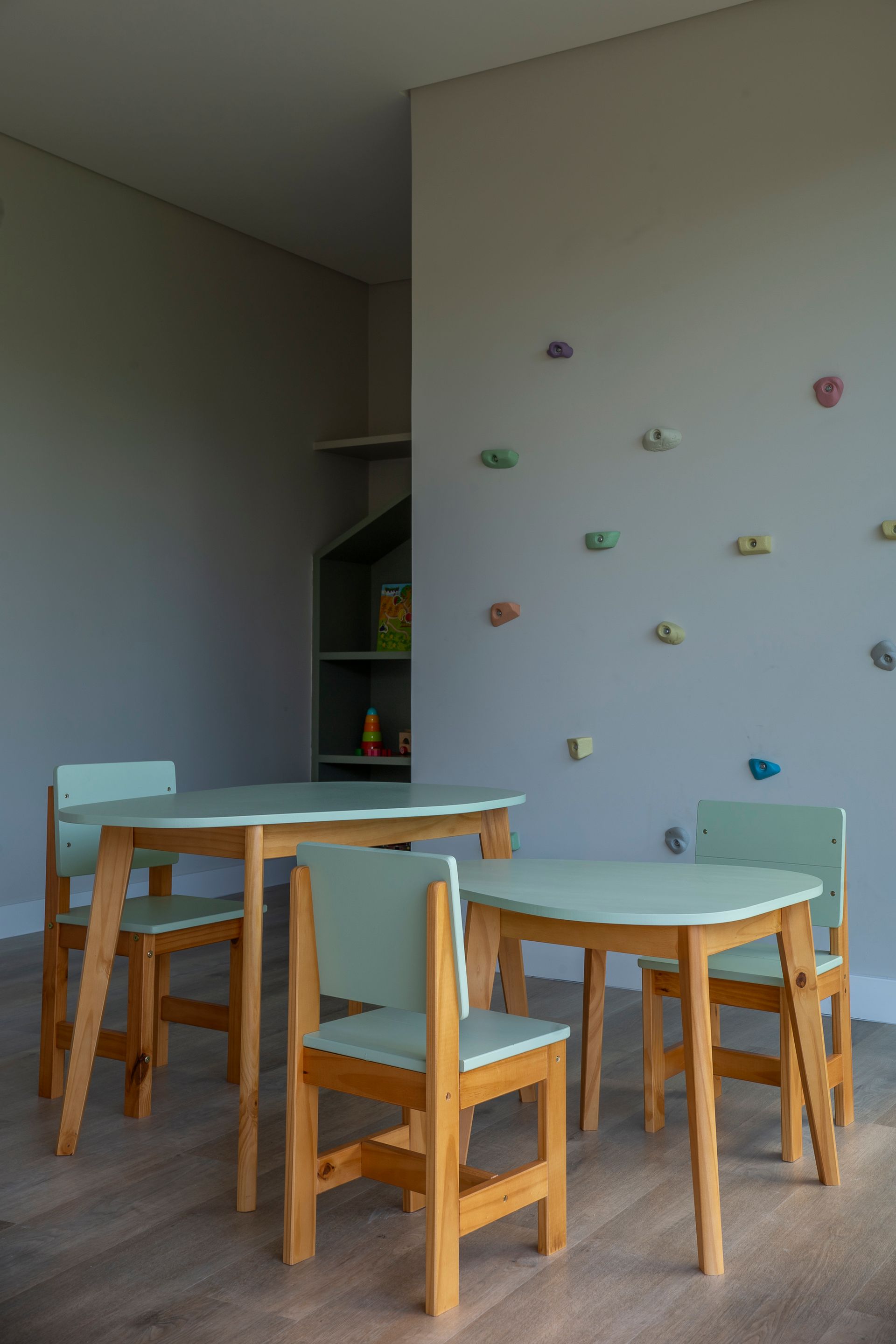 O arranjo das peças responde às diferentes necessidades dos moradores: configurações para encontros informais, espaços junto à academia e à piscina pensados como equipamentos de saúde e bem‑estar, áreas para refeições coletivas e momentos de leitura ou descanso diante da vista. A brinquedoteca, destinada à diversão dos pequenos, também funciona como espaço de convivência familiar. A modularidade dos sofás e a leveza das banquetas permitem adaptação rápida dos ambientes a eventos variados, mantendo sempre coerência estética e conforto. O projeto das áreas comuns do Mirá assina uma leitura doméstica do espaço coletivo. Segundo as arquitetas, a prioridade foi oferecer espaços acolhedores, duráveis e conectados à paisagem, onde o mobiliário, escolhido com atenção técnica e estética, define usos e convites à permanência.