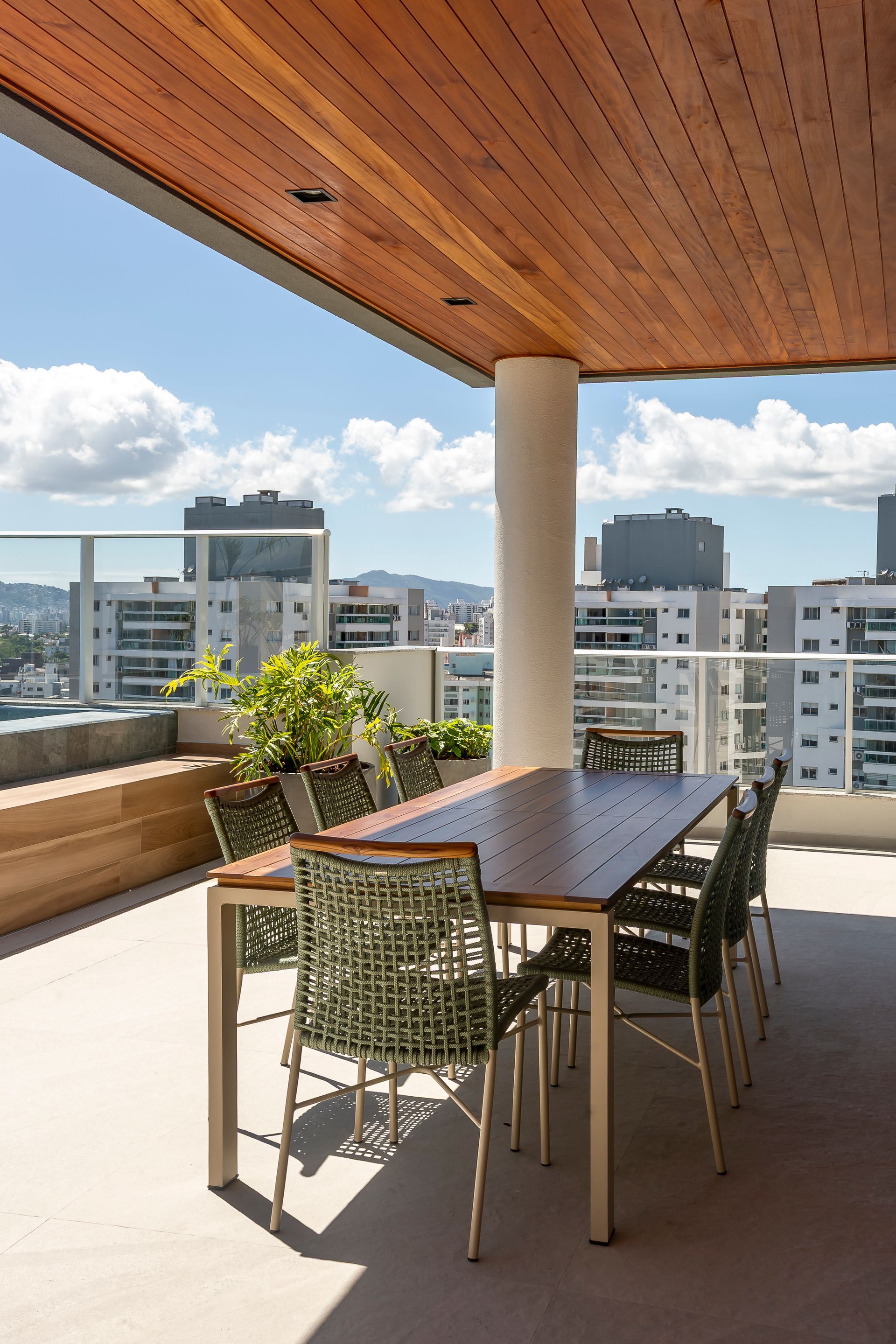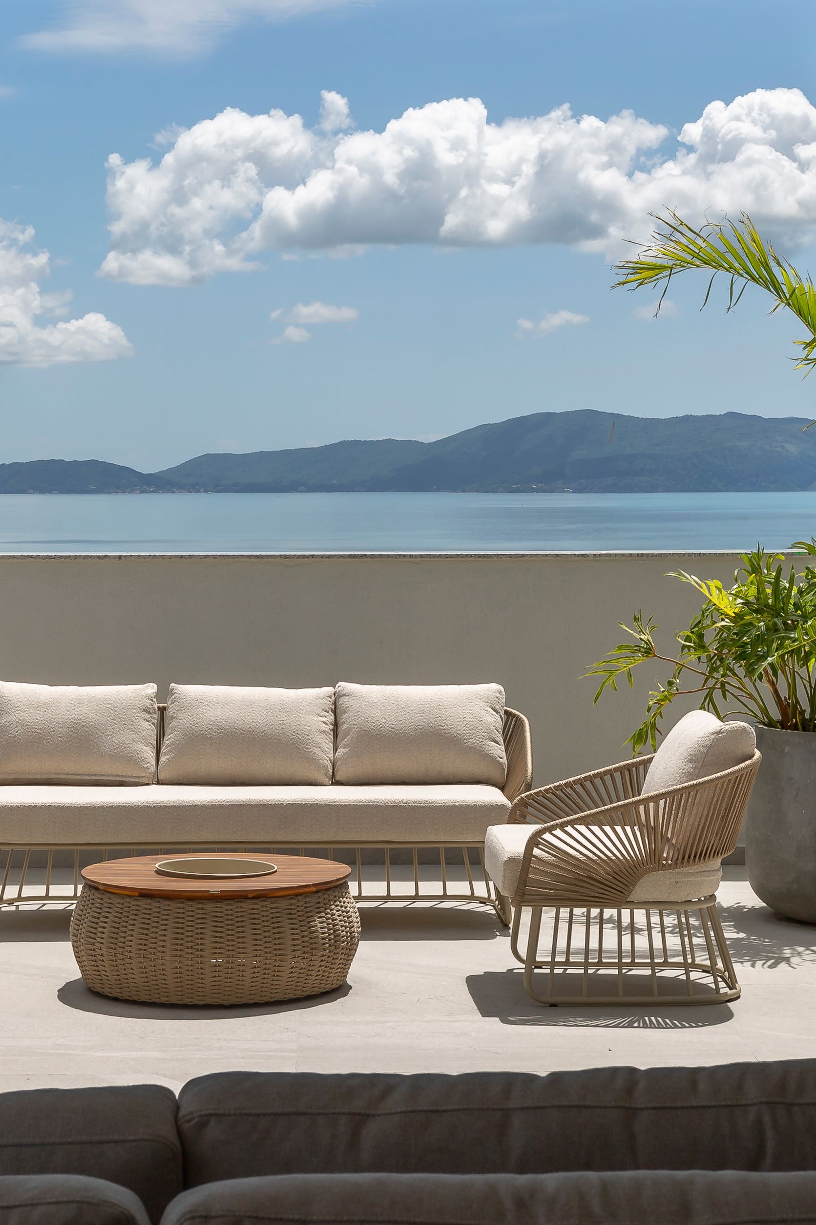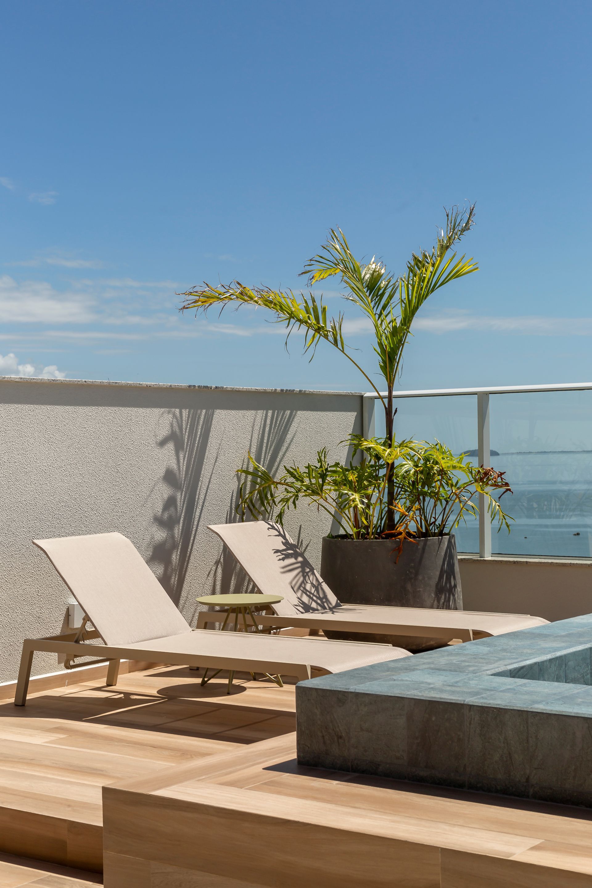 O projeto parte da ideia de que áreas coletivas devem ser vividas diariamente. Com isso em mente, as áreas externas e de convivência foram desenhadas com plantas que privilegiam fluxos claros e flexibilidade: zonas de estar e jantar delineadas por móveis soltos, caminhos amplos para circulação e pontos de contemplação direcionados à paisagem marítima. A decisão da construtora de valorizar a vista do mar definiu o fio condutor do projeto; sobre essa base, as arquitetas organizaram os espaços para que a paisagem seja sempre protagonista.