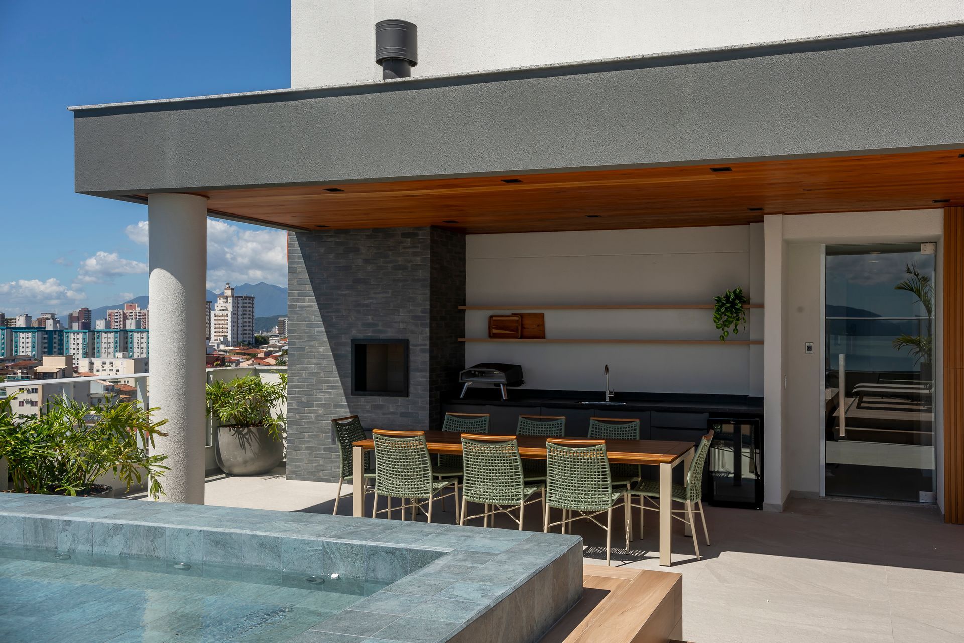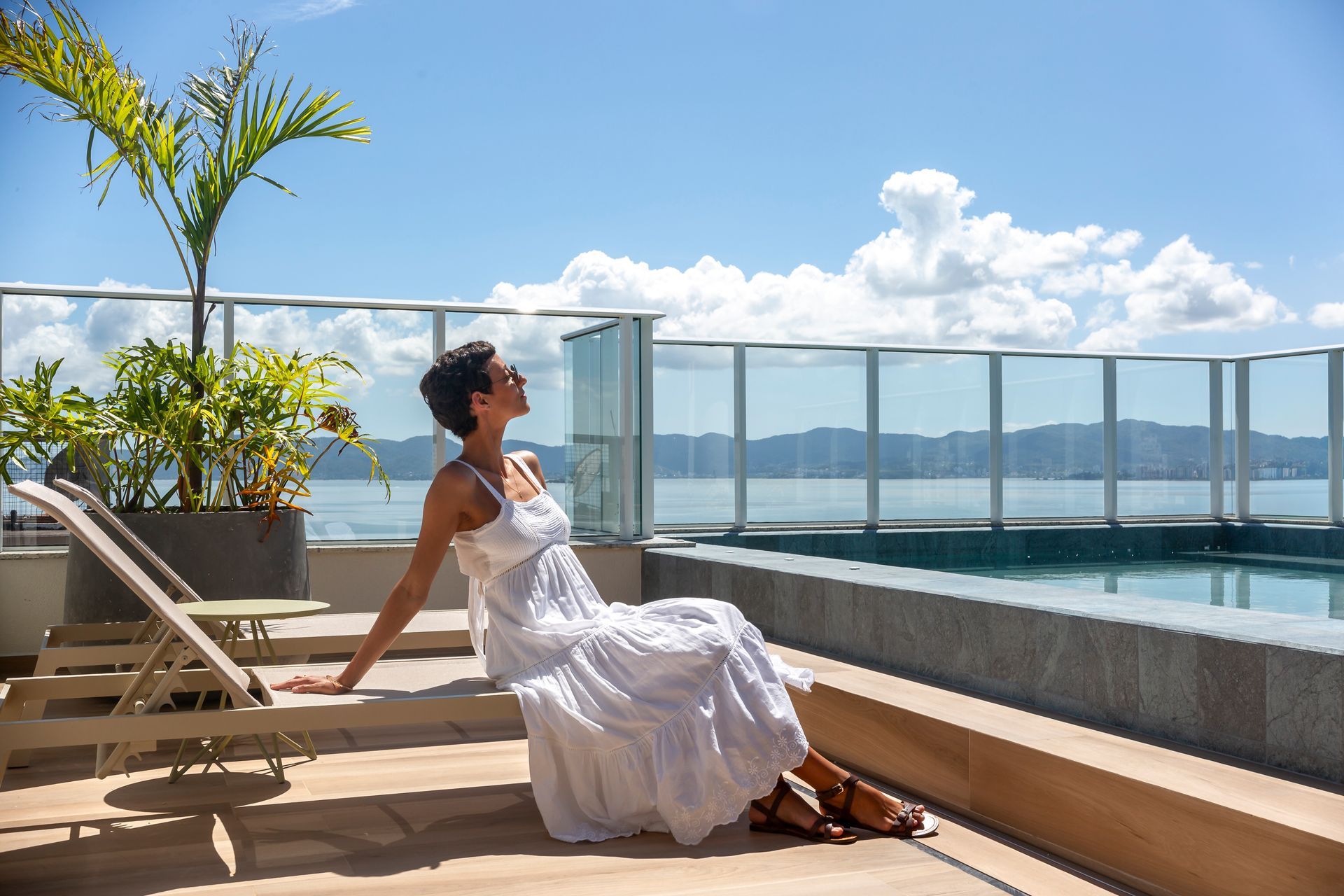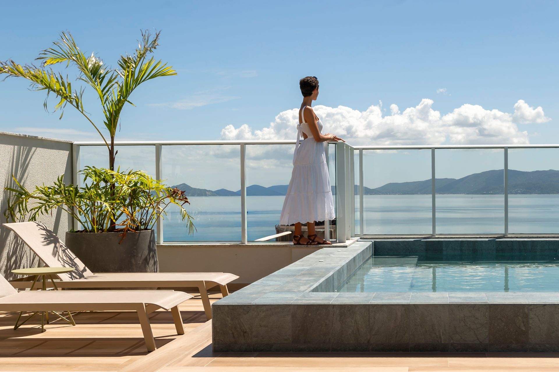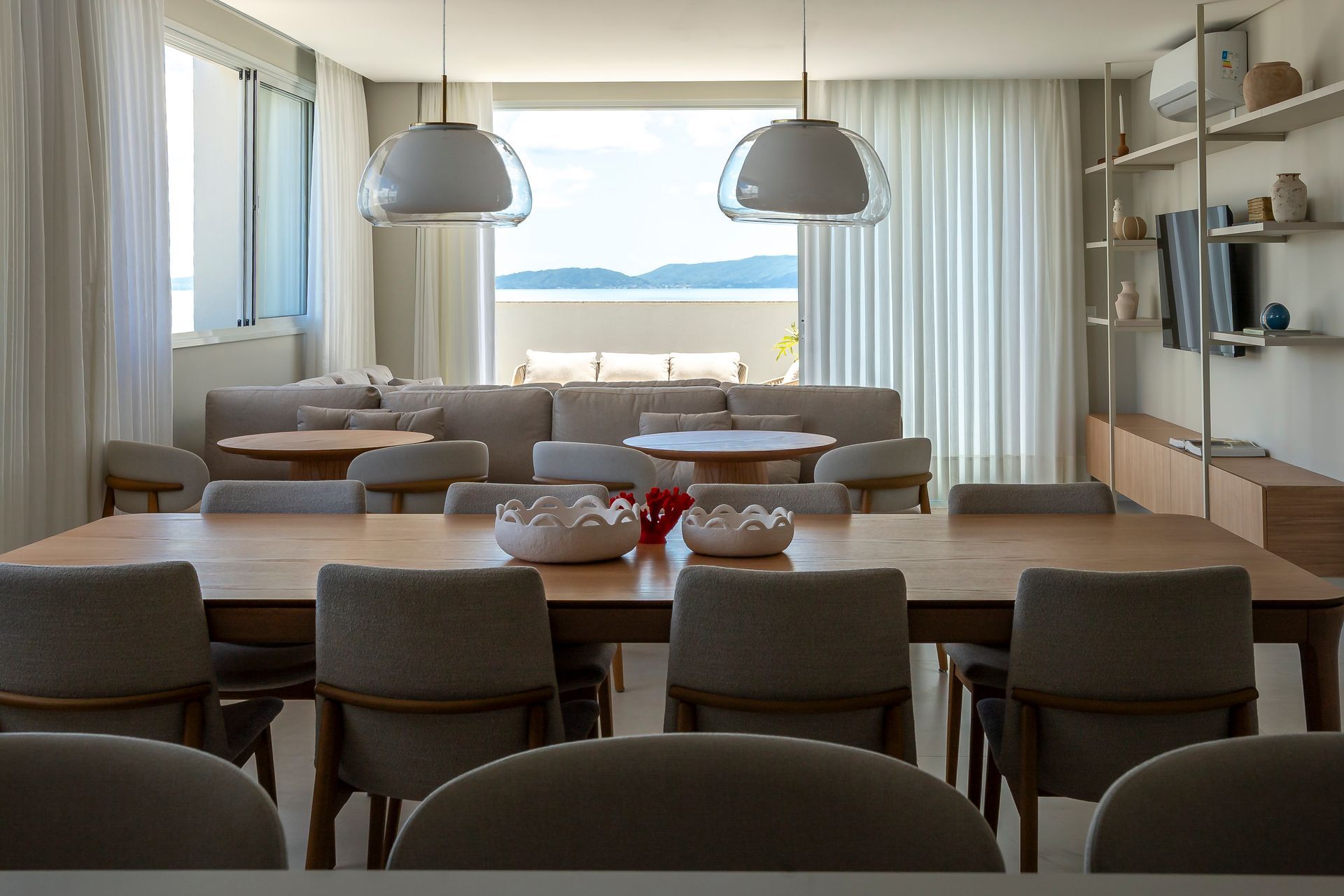 O projeto parte da ideia de que áreas coletivas devem ser vividas diariamente. Com isso em mente, as áreas externas e de convivência foram desenhadas com plantas que privilegiam fluxos claros e flexibilidade: zonas de estar e jantar delineadas por móveis soltos, caminhos amplos para circulação e pontos de contemplação direcionados à paisagem marítima. A decisão da construtora de valorizar a vista do mar definiu o fio condutor do projeto; sobre essa base, as arquitetas organizaram os espaços para que a paisagem seja sempre protagonista.