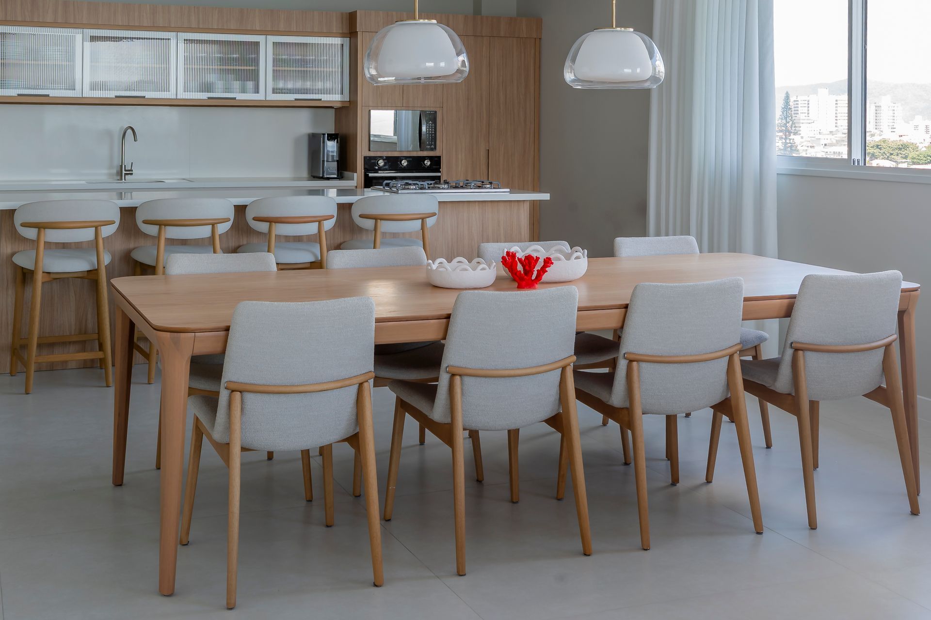 No bairro Barreiros, em São José, o Mirá se instala como um residencial de 13 pavimentos que prioriza a experiência cotidiana dos moradores. Para a área comum, as arquitetas *Bia Crippa e Julia Appel, da Bi. Ju Arquitetura*, assinaram um projeto que trabalha a convivência com a mesma atenção dedicada a um interior doméstico: layouts maleáveis, materiais que evocam o litoral e mobiliário que organiza e convida ao uso. A orientação do edifício para a vista do mar pontuou todas as decisões: do posicionamento das peças ao acabamento das superfícies, com o objetivo de integrar visualmente os ambientes coletivos à paisagem e transformar esses espaços em extensão natural dos apartamentos.