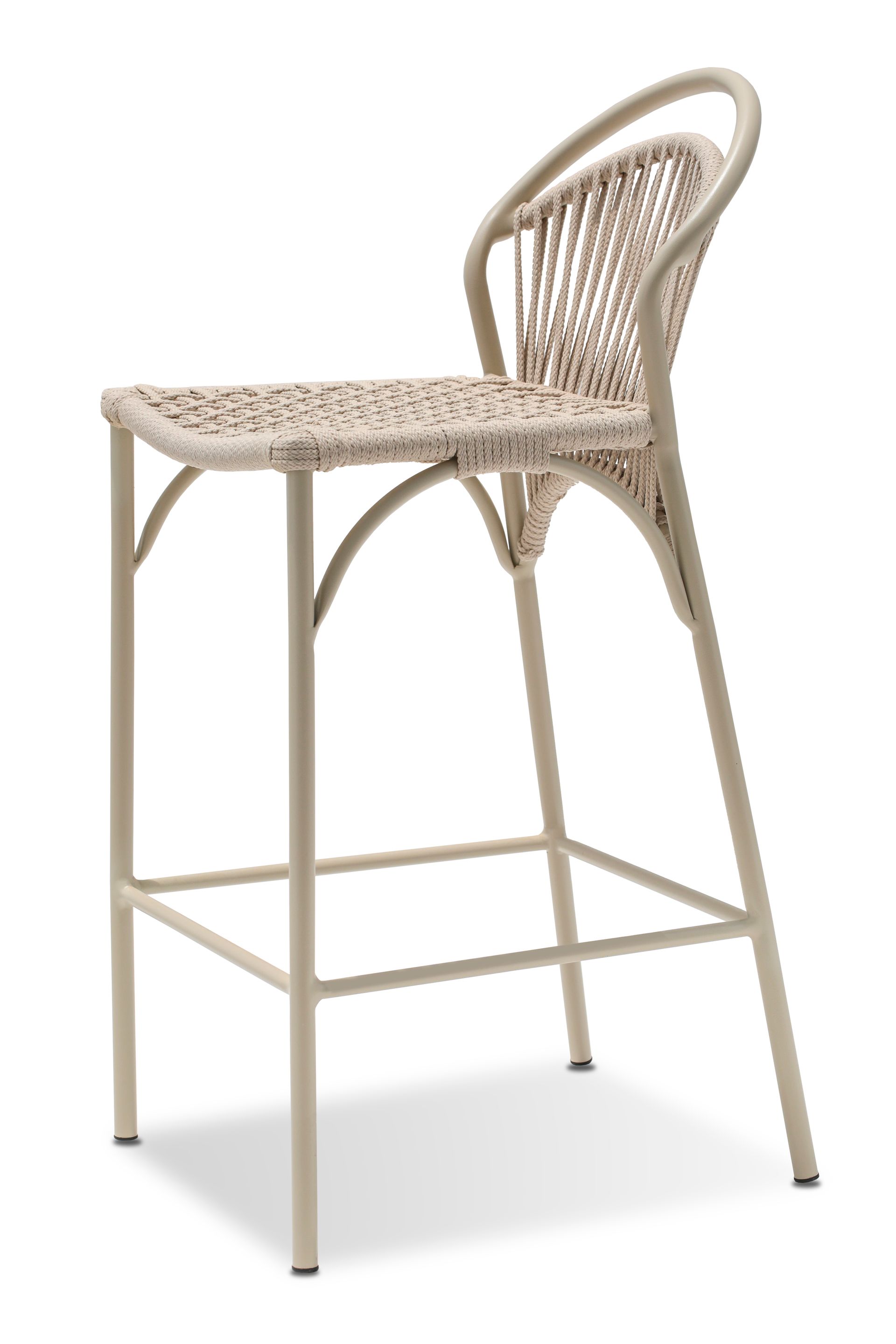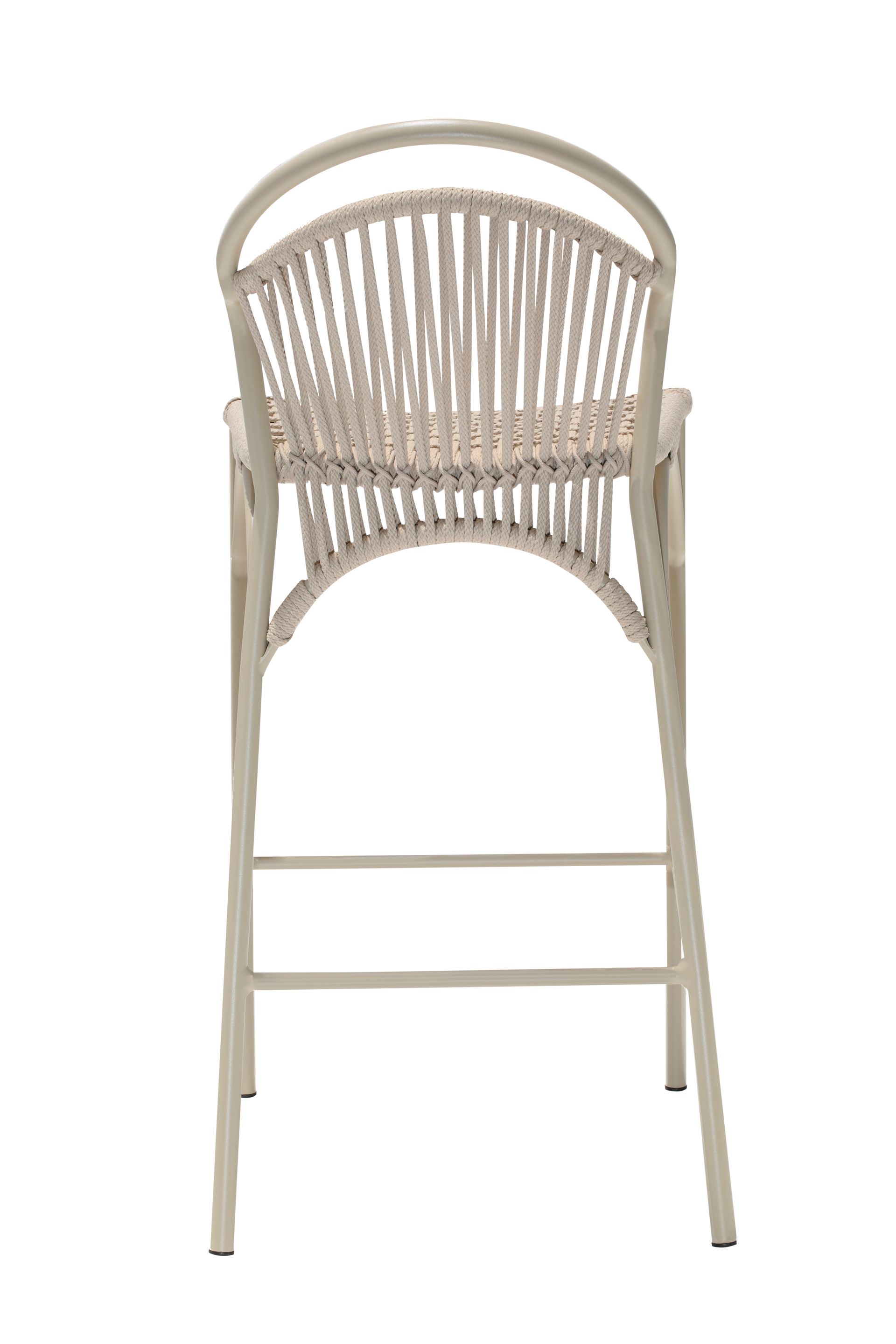 Banquetas com traços contemporâneos que harmoniza o décor, a leveza do alumínio, aliada aos trançados da corda náutica, garantem durabilidade, conforto e resistência para sua área gourmet, ou externa.