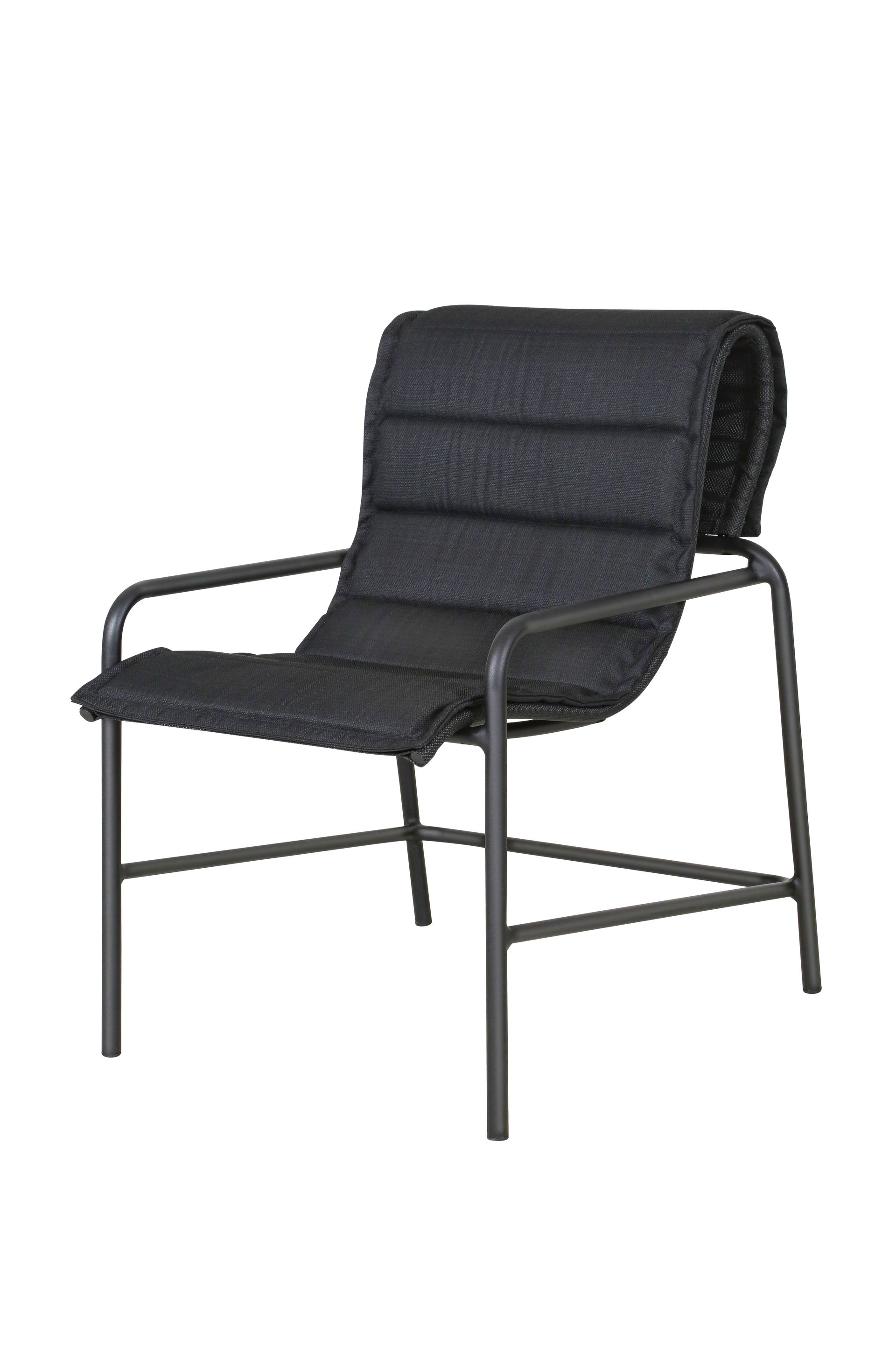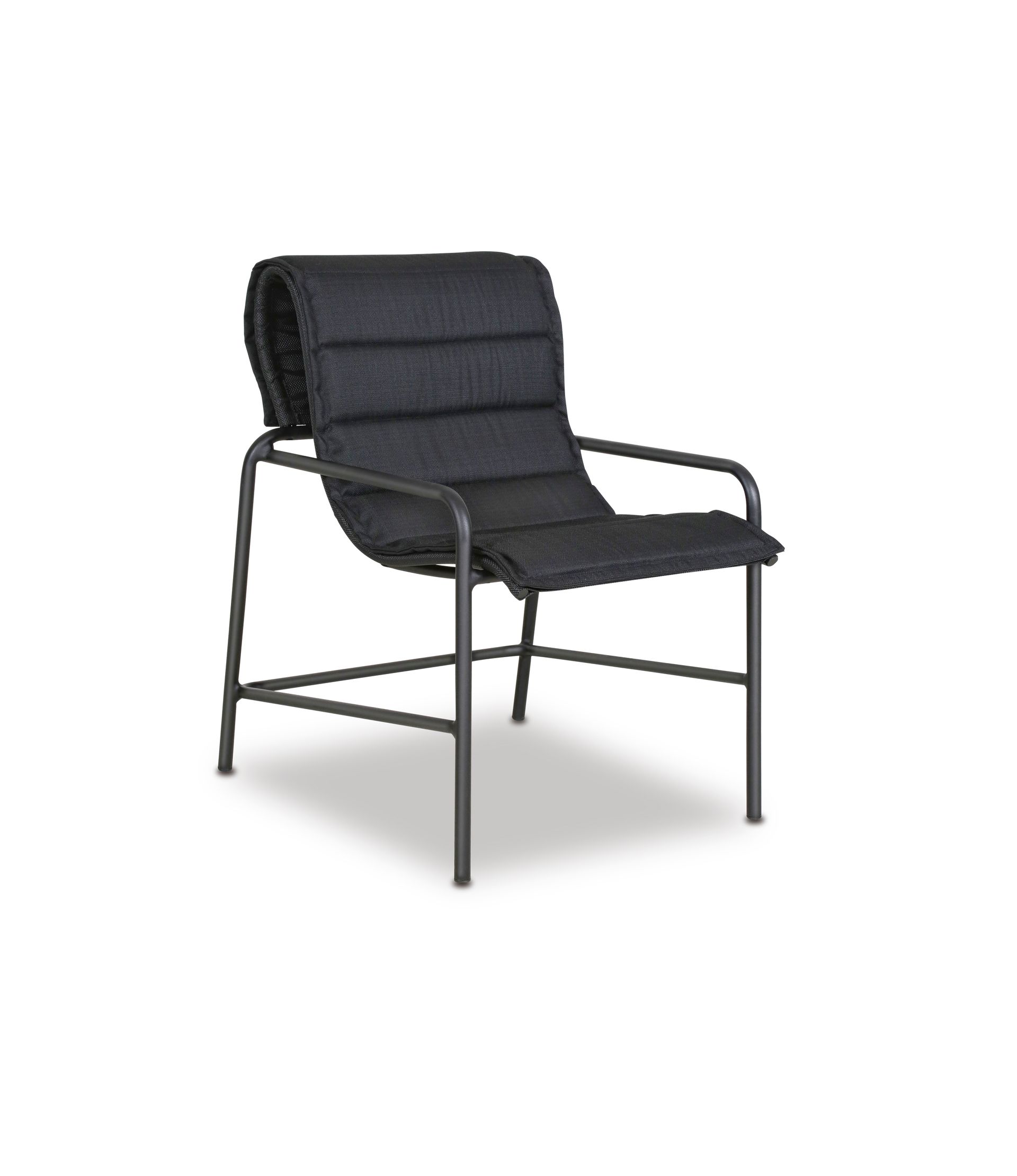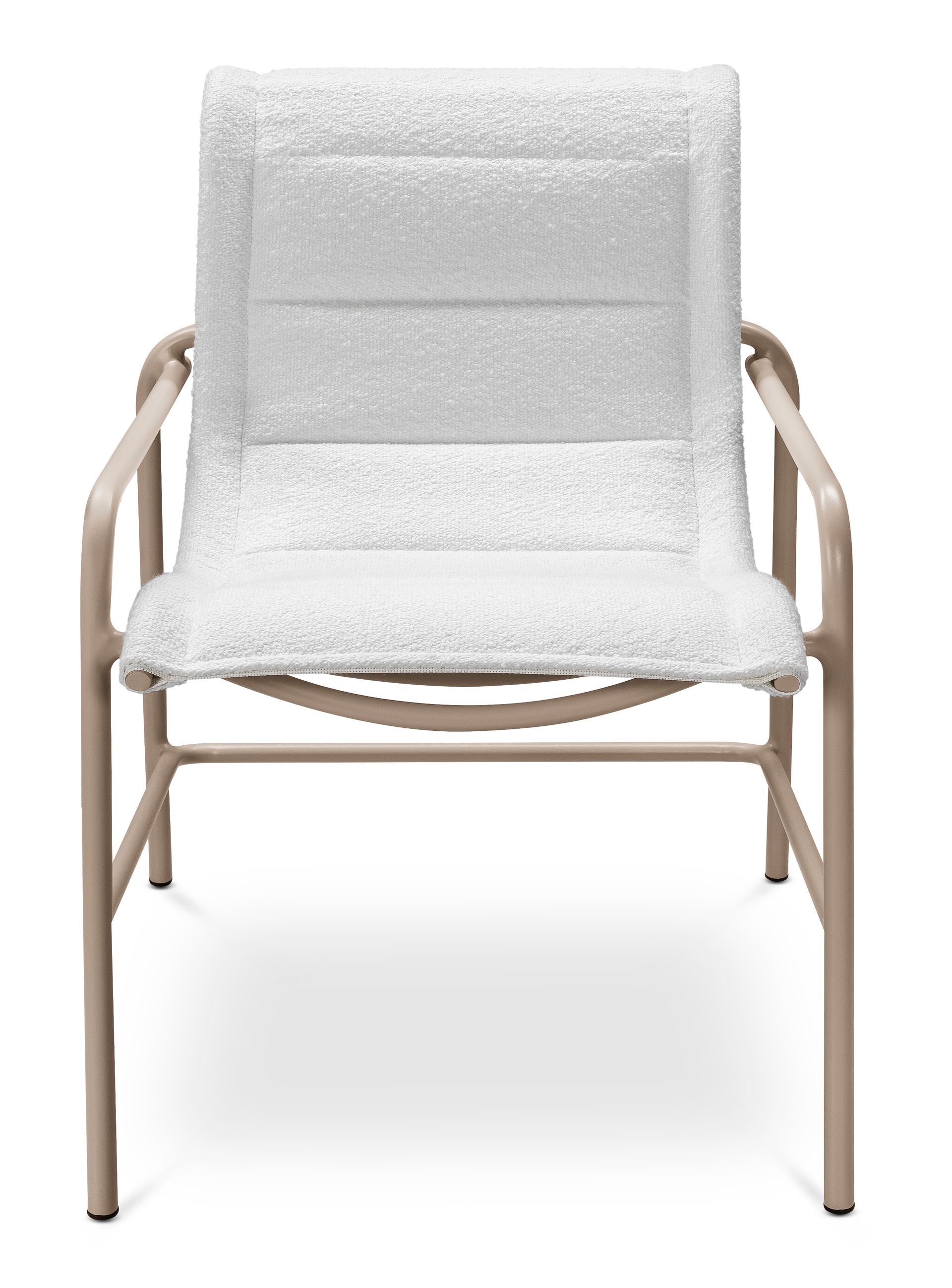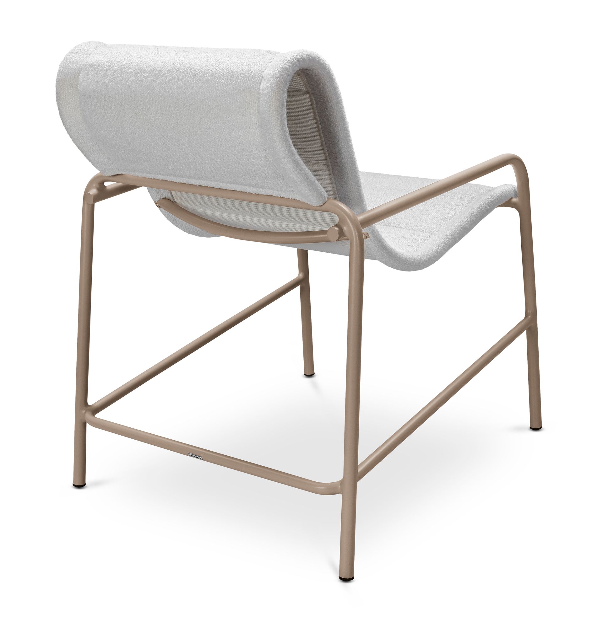 Sua estrutura é em alumínio com pintura eletrostática, envolvida e forrada com tela sling, tendo a opção de acrescentar um pillow de tecido, dando um toque a mais de personalidade à peça.