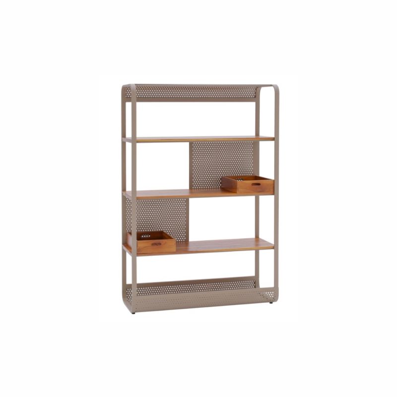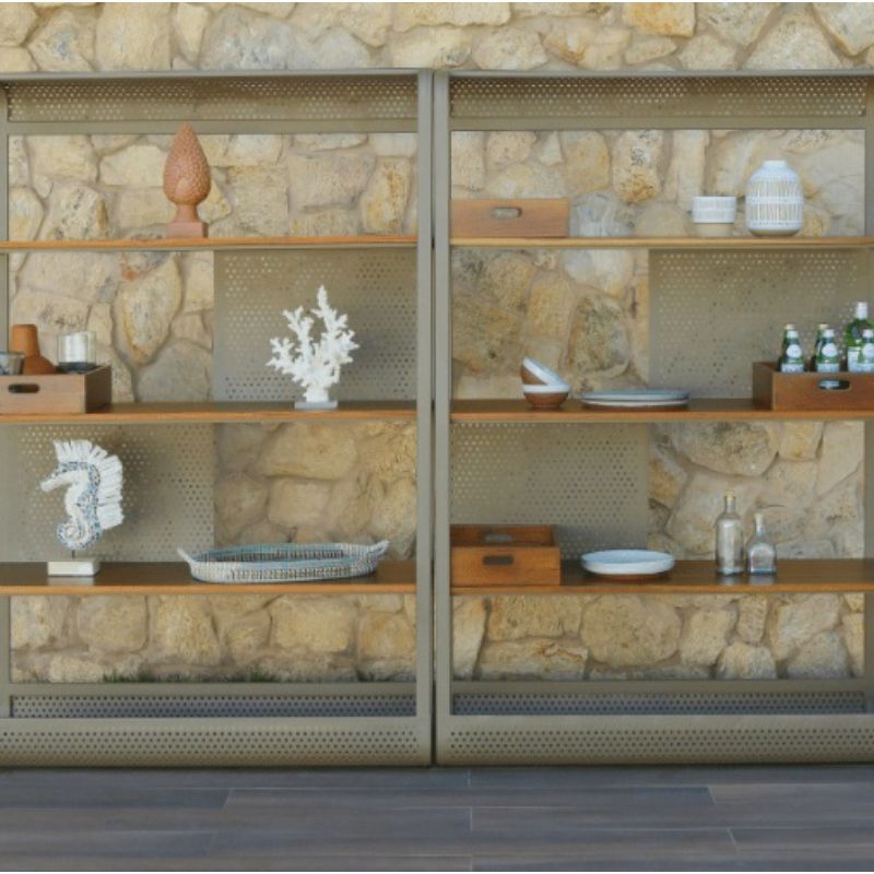 Na inspiração do movimento do vai e vem das ondas do mar, a estante Maré trás no seu design a leveza e elegância dos tubos e chapa perfurada de alumínio.