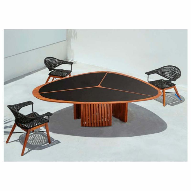 Um tampo em TS ESTRUTURAL ou PEDRA SINTERIZADA, com bordas de madeira TECA, chanfradas, assimétricas. Materiais distintos se misturam, separados por linhas transversais que lembram fissuras, trincas, rachaduras na pedra. São pedaços, fragmentos que se unem para formarem um intrincado jogo de formas e materiais.