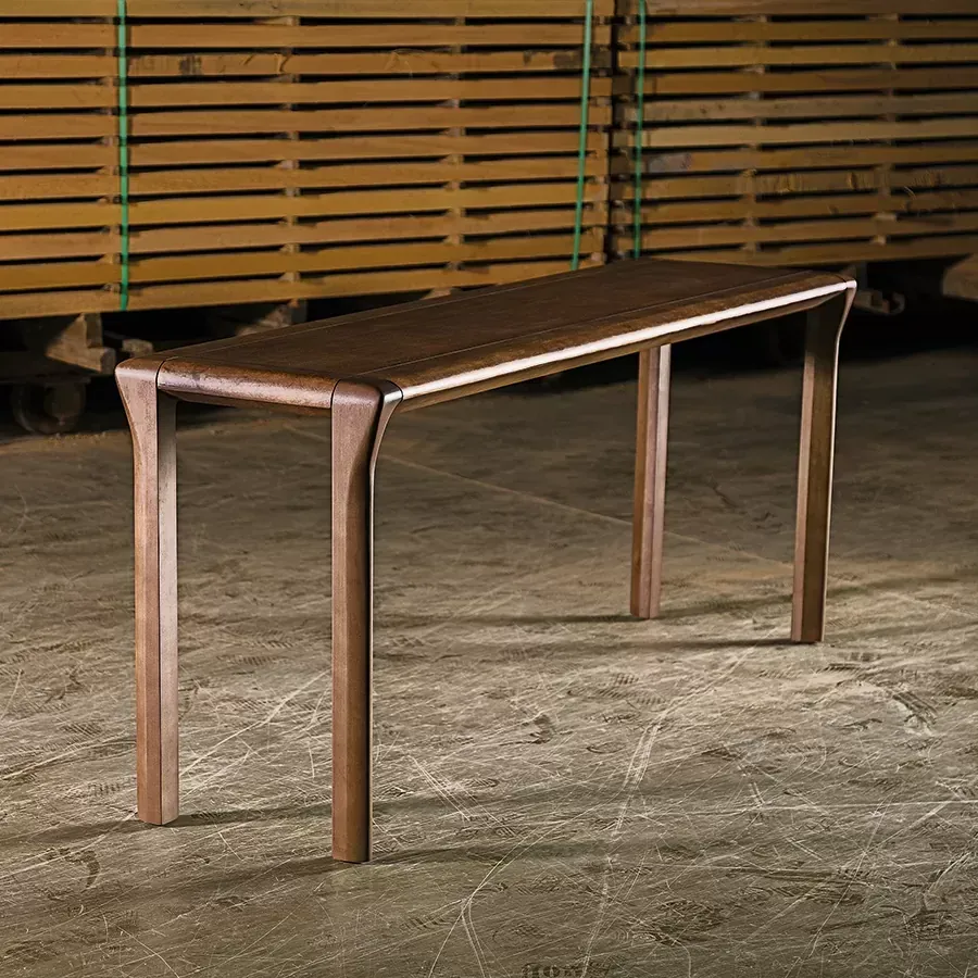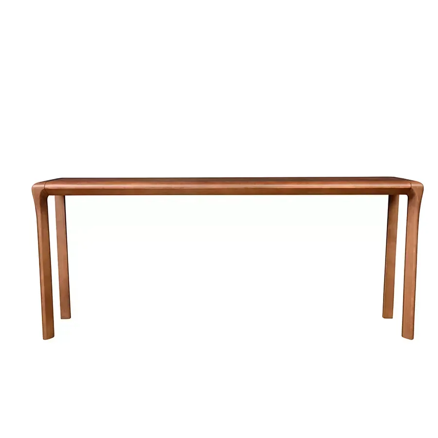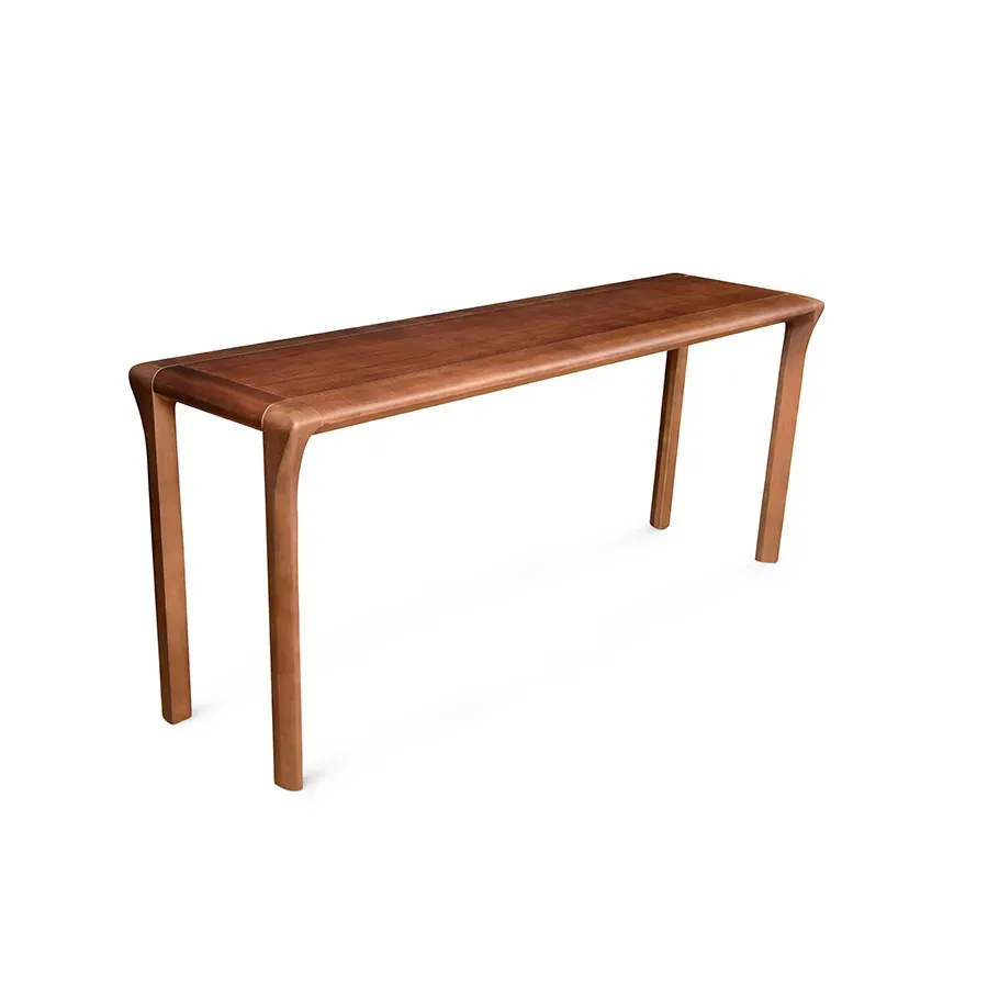 O desenho dos pés e laterais do tampo é o destaque deste aparador de linhas orgânicas. É uma peça discreta, elegante e funcional, que se enquadra em todos os estilos de projetos. A parte central é laminada em madeira natural ou tonalizada e os pés laterais do tampo em madeira maciça usinada. Possui bordas arredondadas e chanfradas para dentro, a fim de deixar seu toque ainda mais suave e delicado. Além disso, a peça não possui arestas, deixando em destaque sua fluidez.