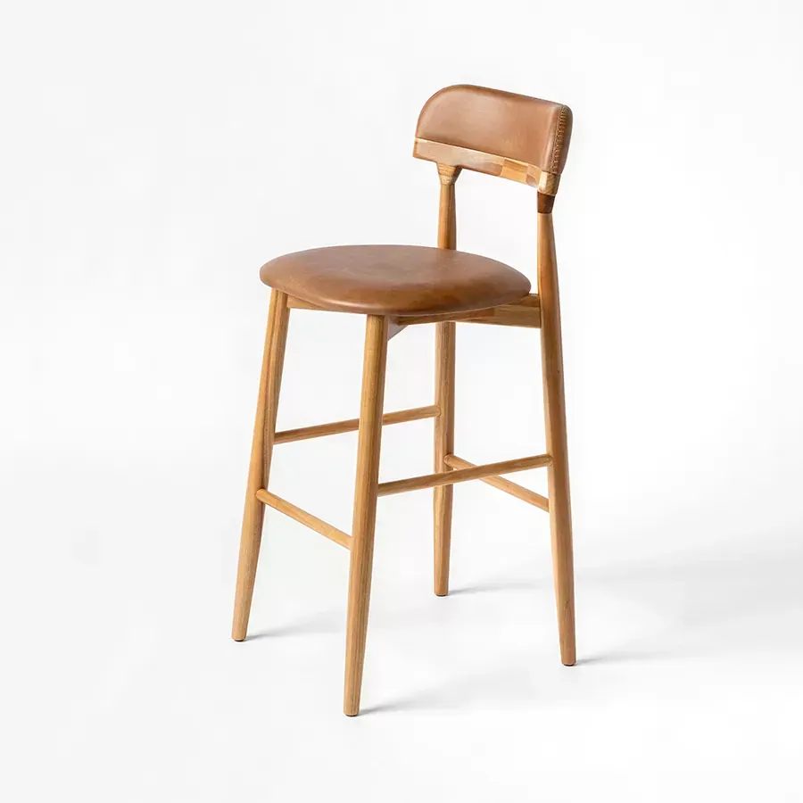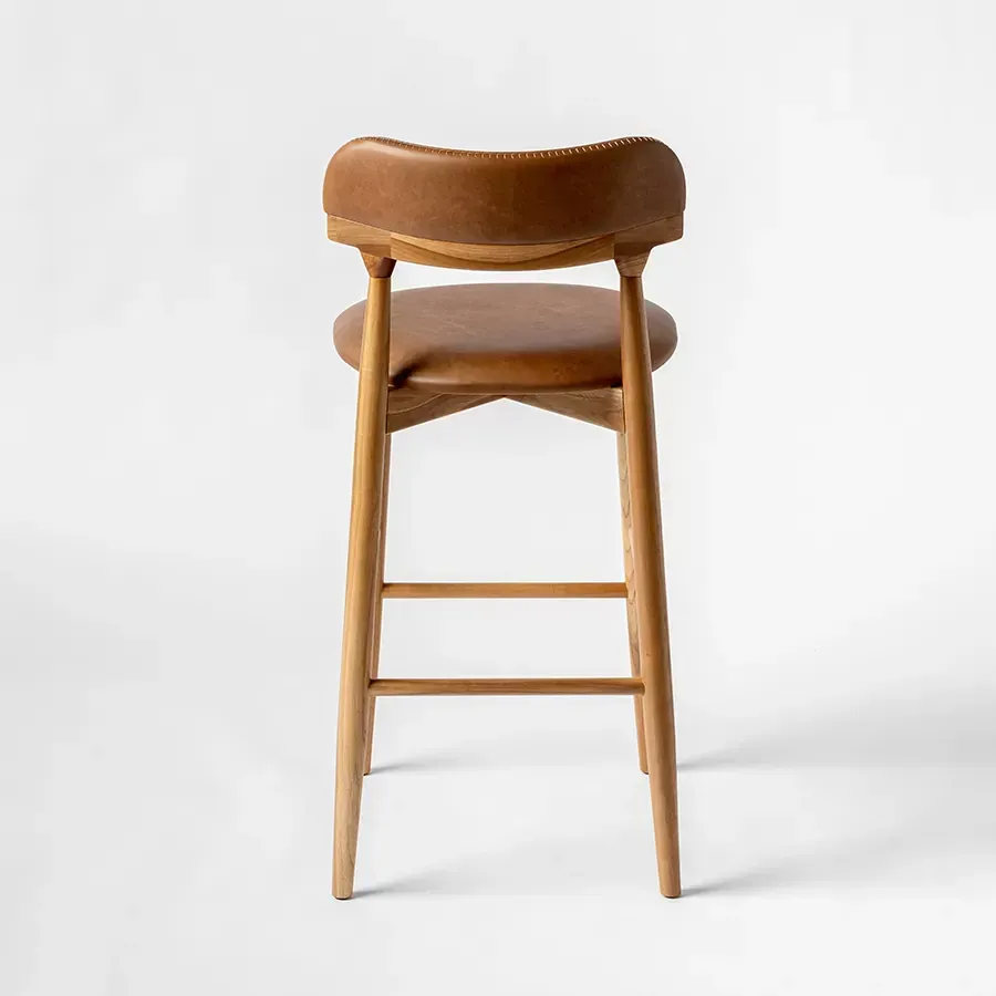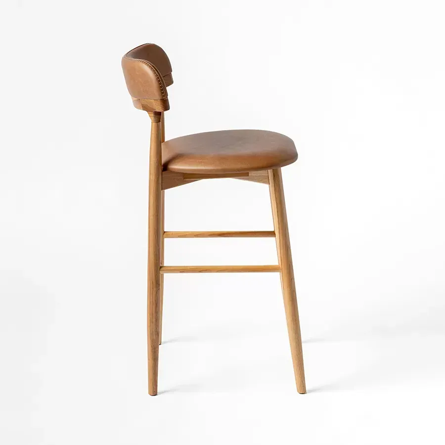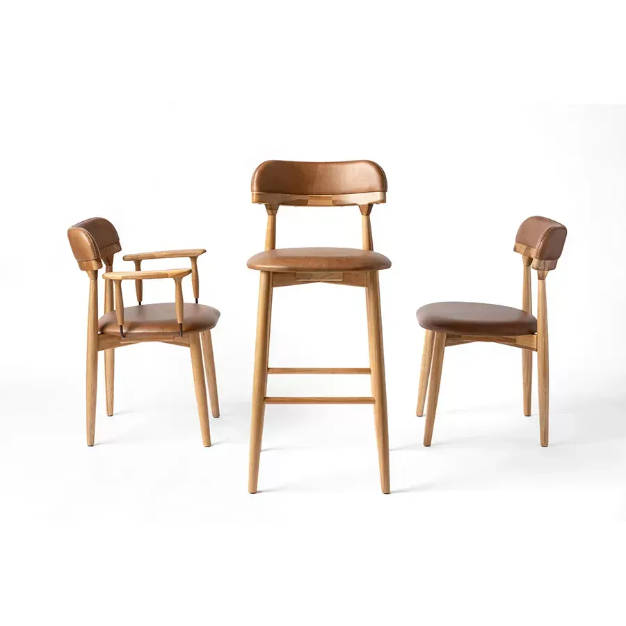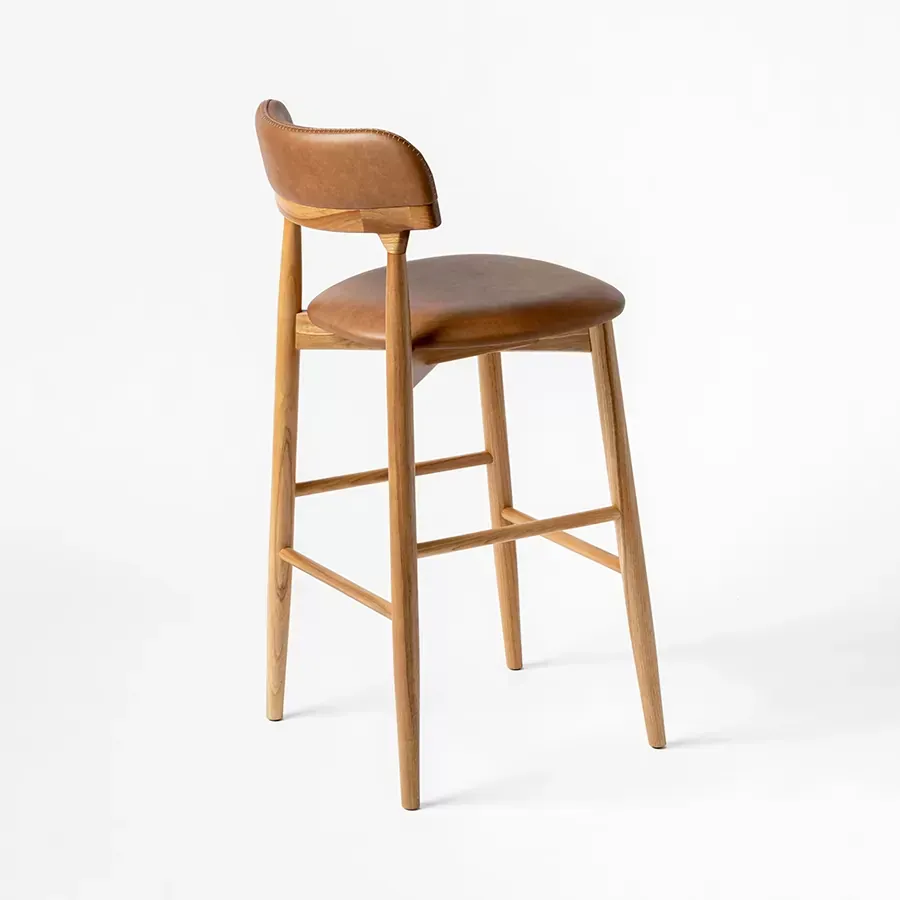 A postura vigilante do pássaro símbolo do Rio Grande do Sul, o quero-quero, foi o ponto de partida do desenho desta peça. A estrutura esguia, dos pés traseiros, pontua a união entre a madeira e a parte estofada do espaldar. Uma única costura com pesponto de linha grossa chama atenção no topo do encosto.